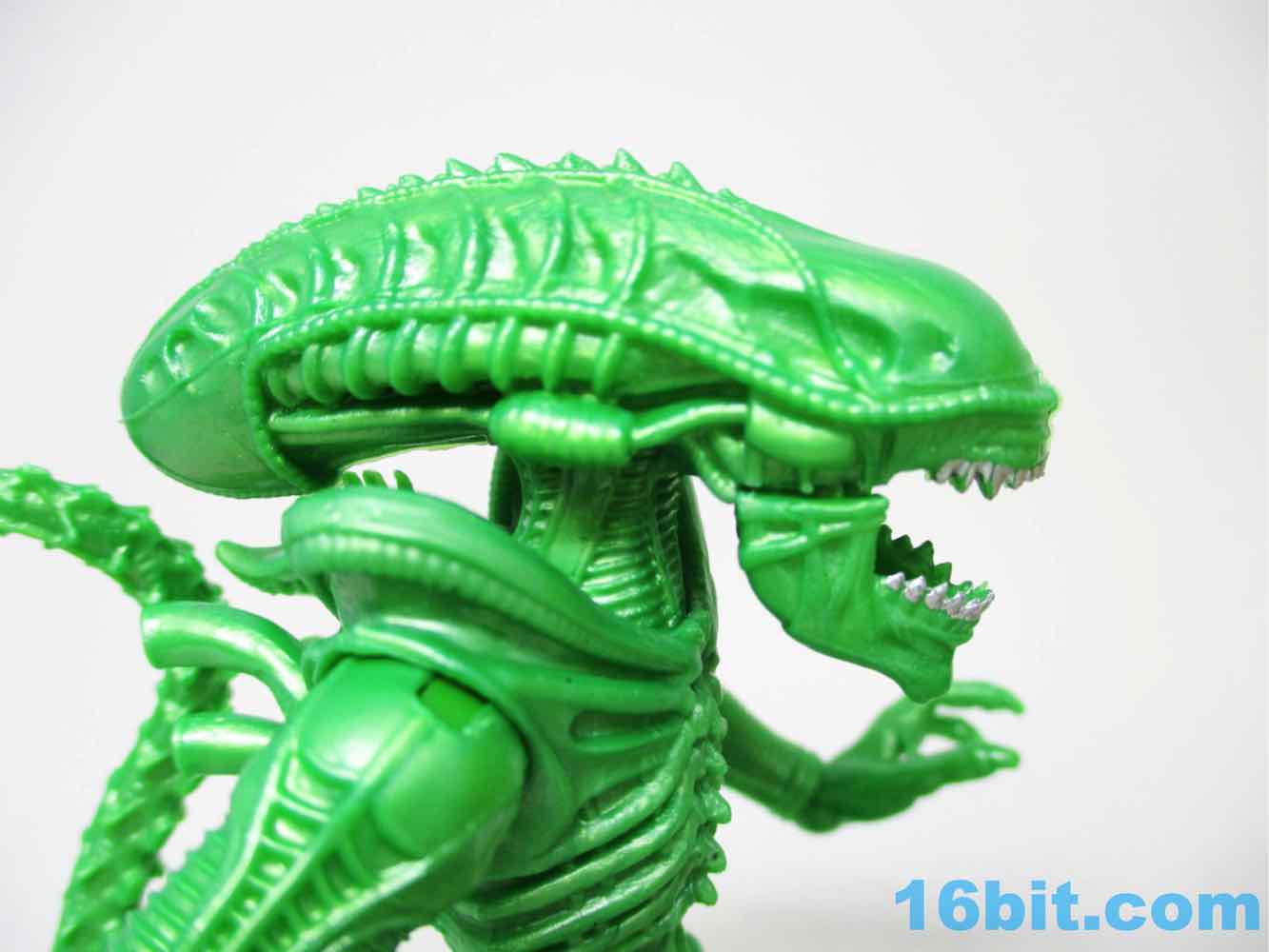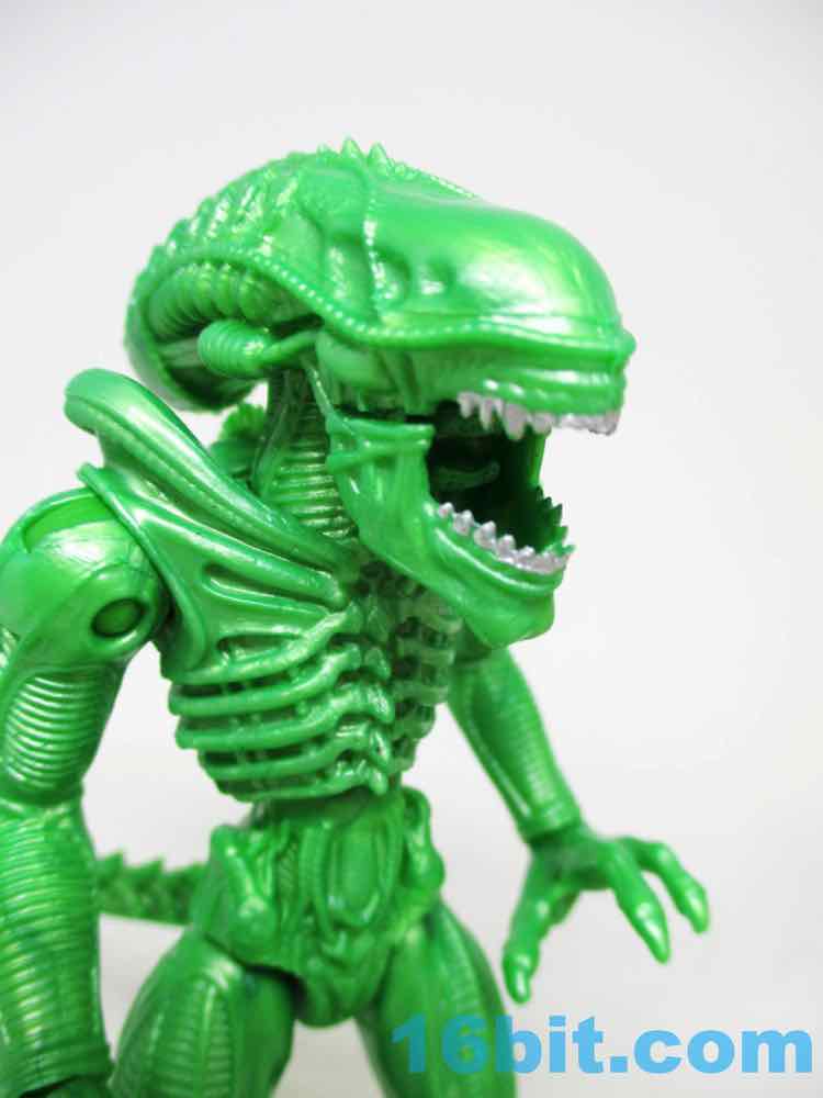 The green Warrior Alien is modeled after the Aliens model - note the hands and arms, the tail, and the dome. There are changes in the suits for each film, with this one having more ridges on the dome, only three fingers, and what appear to be violin bows on the forearms. As with the others, I love the ball-jointed wrists and ankles - it gives the figure a heck of a lot more movement with only 15 points of articulation. It feels like the weird mutant cousin of the Mantis Alien, or a malevolent green crayon. The only paint is on the silver teeth, the rest of the detail is all sculpted or baked in to the green, swirly plastic. It looks really good up-close,