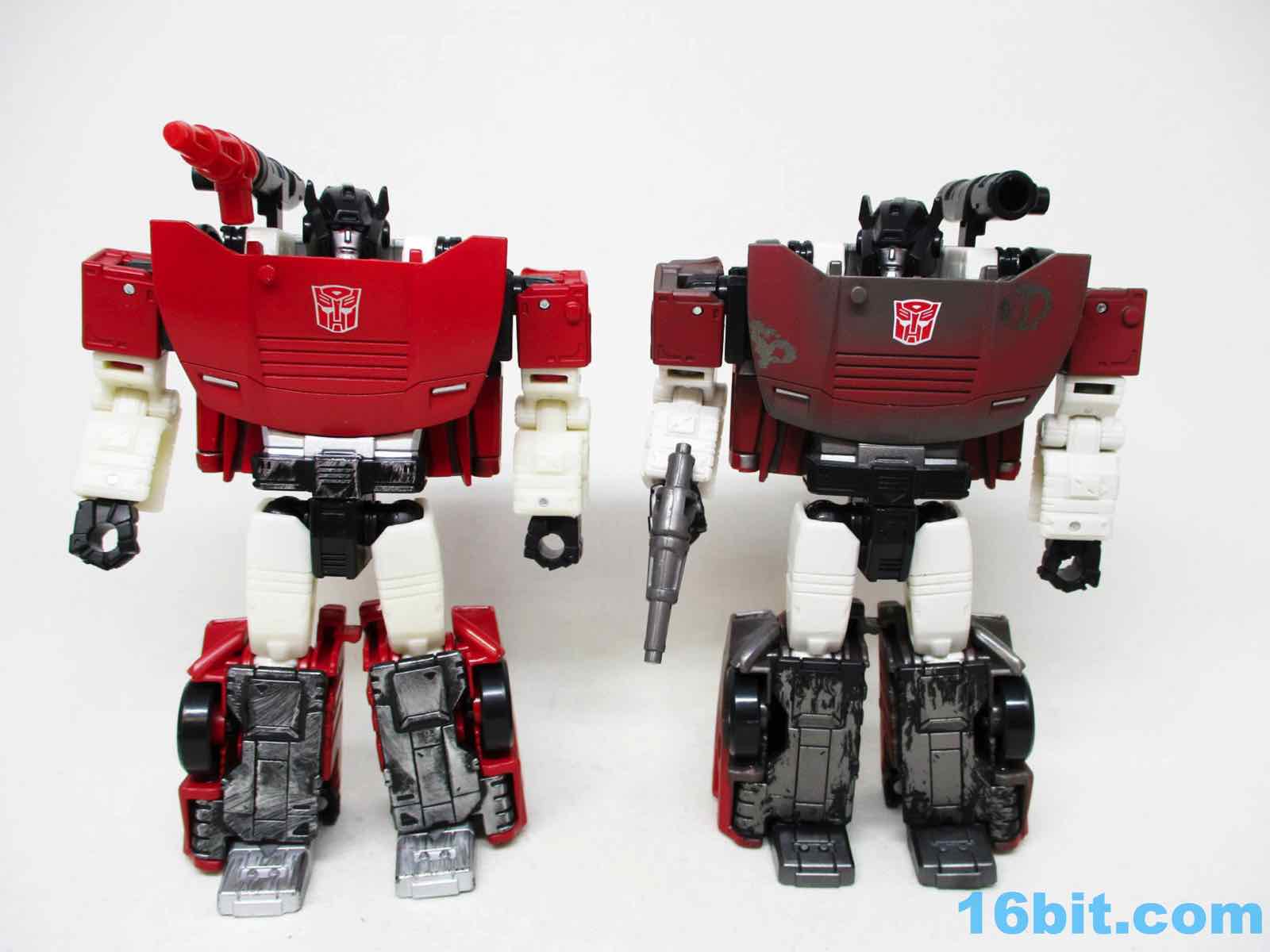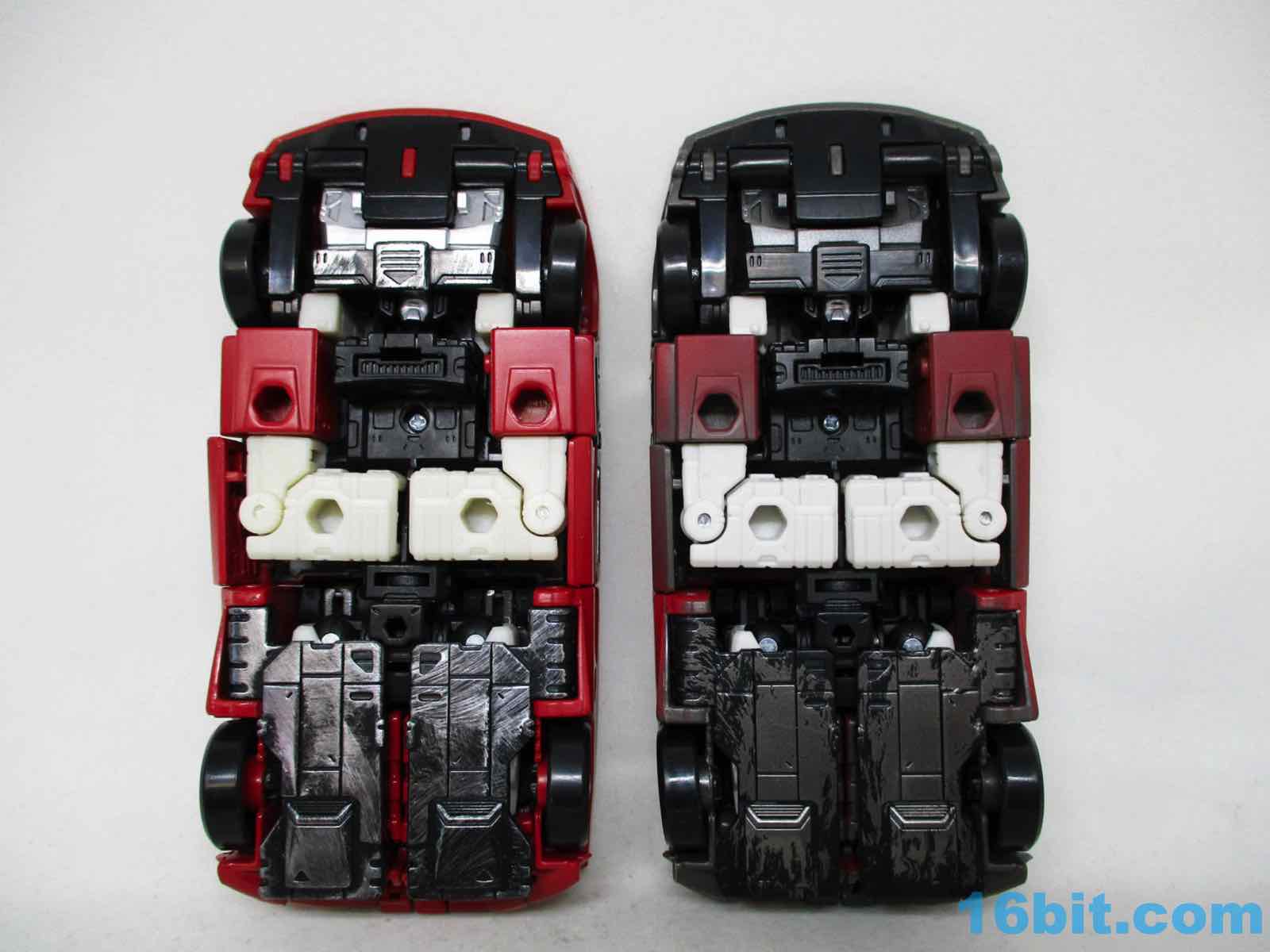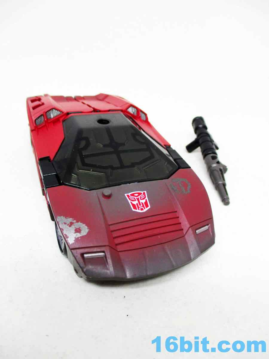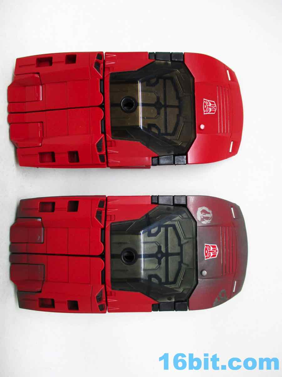 The 5-inch robot is kind of short for a deluxe, but it's fairly good and we reviewed the mold Sideswipe [FOTD #2,047] last year. The toy is basically an improved (depending on your preferences) all-new paint mask for the same mold. This time Sideswipe is mostly tweaked with the red plastic now cast in dark grey - but painted red! - and the off-white plastic now a whiter plastic. The decision to paint the grey body parts in red is certainly strange at first, but it works - it serves as a sort of primer under the red paint. What's more, the red has some added scuffing on the hood in addition to the wear and tear on the car parts. What's more, the shins have all-new paint wear patterns and it's a vast improvement over the last version. The white parts are still clean, though - so that's a little weird, and the waist is now clean black instead of scuffed in silver. Why the Decepticons went for the crotch, we may never know.