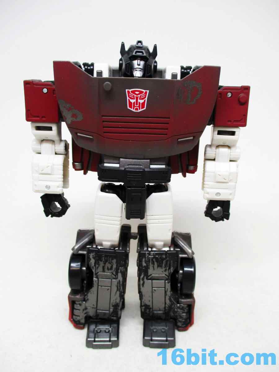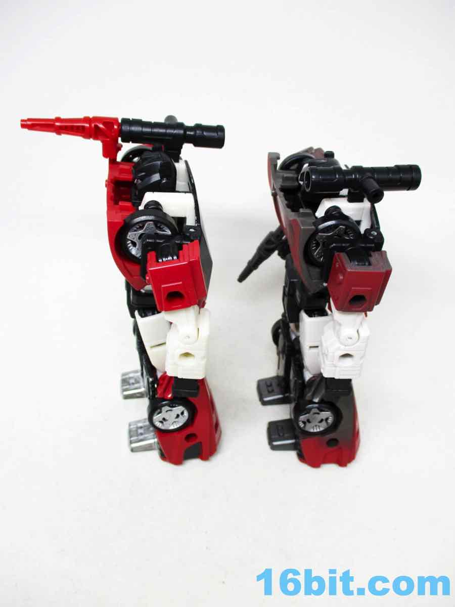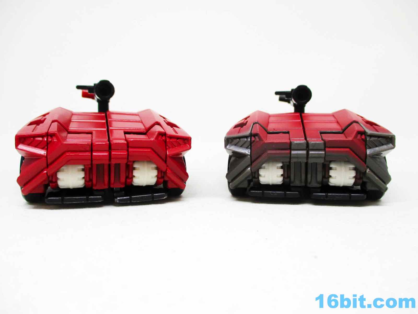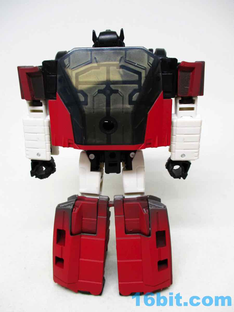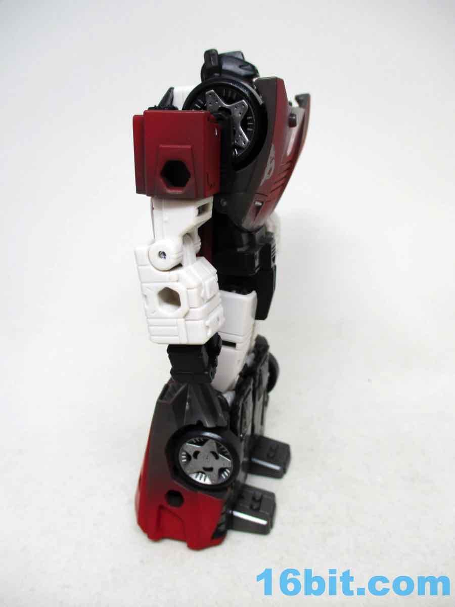 The 5-inch robot is kind of short for a deluxe, but it's fairly good and we reviewed the mold Sideswipe [FOTD #2,047] last year. The toy is basically an improved (depending on your preferences) all-new paint mask for the same mold. This time Sideswipe is mostly tweaked with the red plastic now cast in dark grey - but painted red! - and the off-white plastic now a whiter plastic. The decision to paint the grey body parts in red is certainly strange at first, but it works - it serves as a sort of primer under the red paint. What's more, the red has some added scuffing on the hood in addition to the wear and tear on the car parts. What's more, the shins have all-new paint wear patterns and it's a vast improvement over the last version. The white parts are still clean, though - so that's a little weird, and the waist is now clean black instead of scuffed in silver. Why the Decepticons went for the crotch, we may never know.