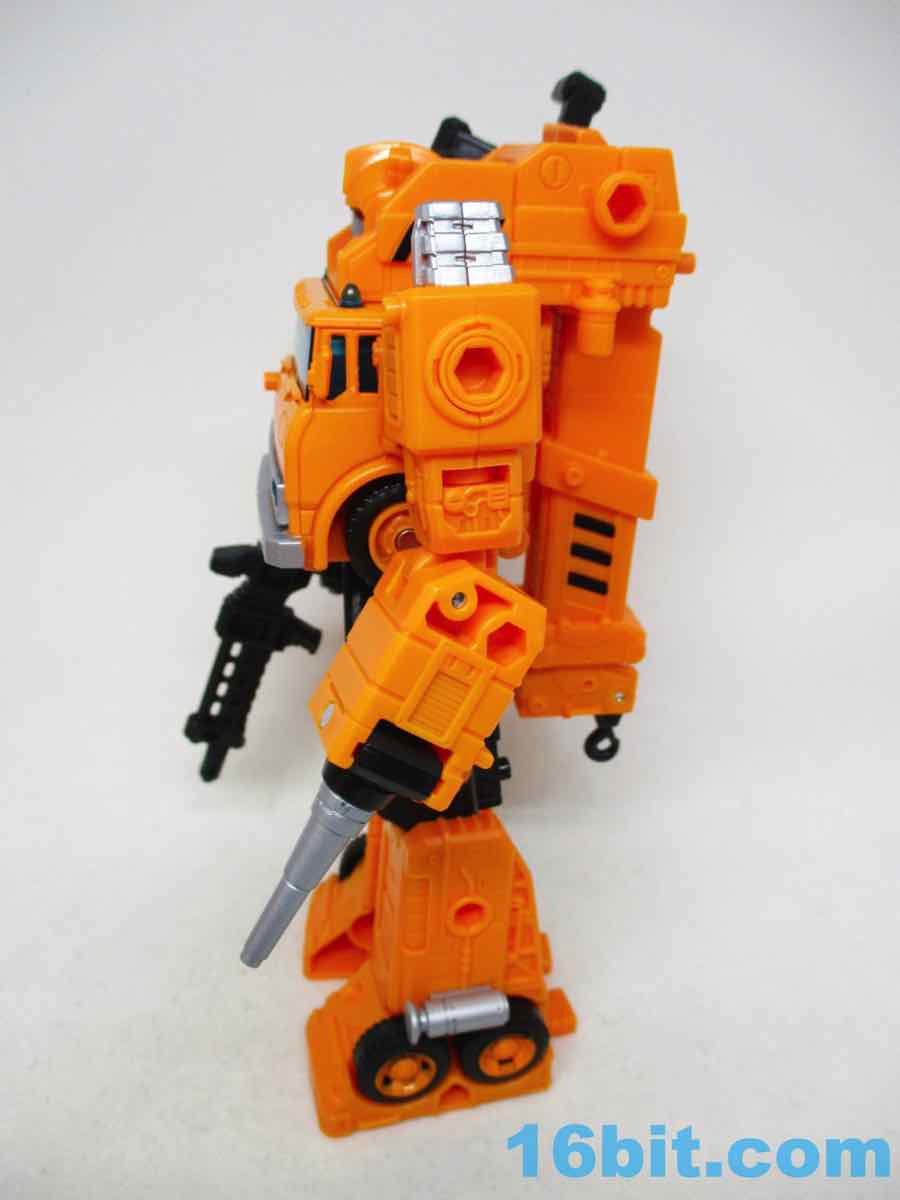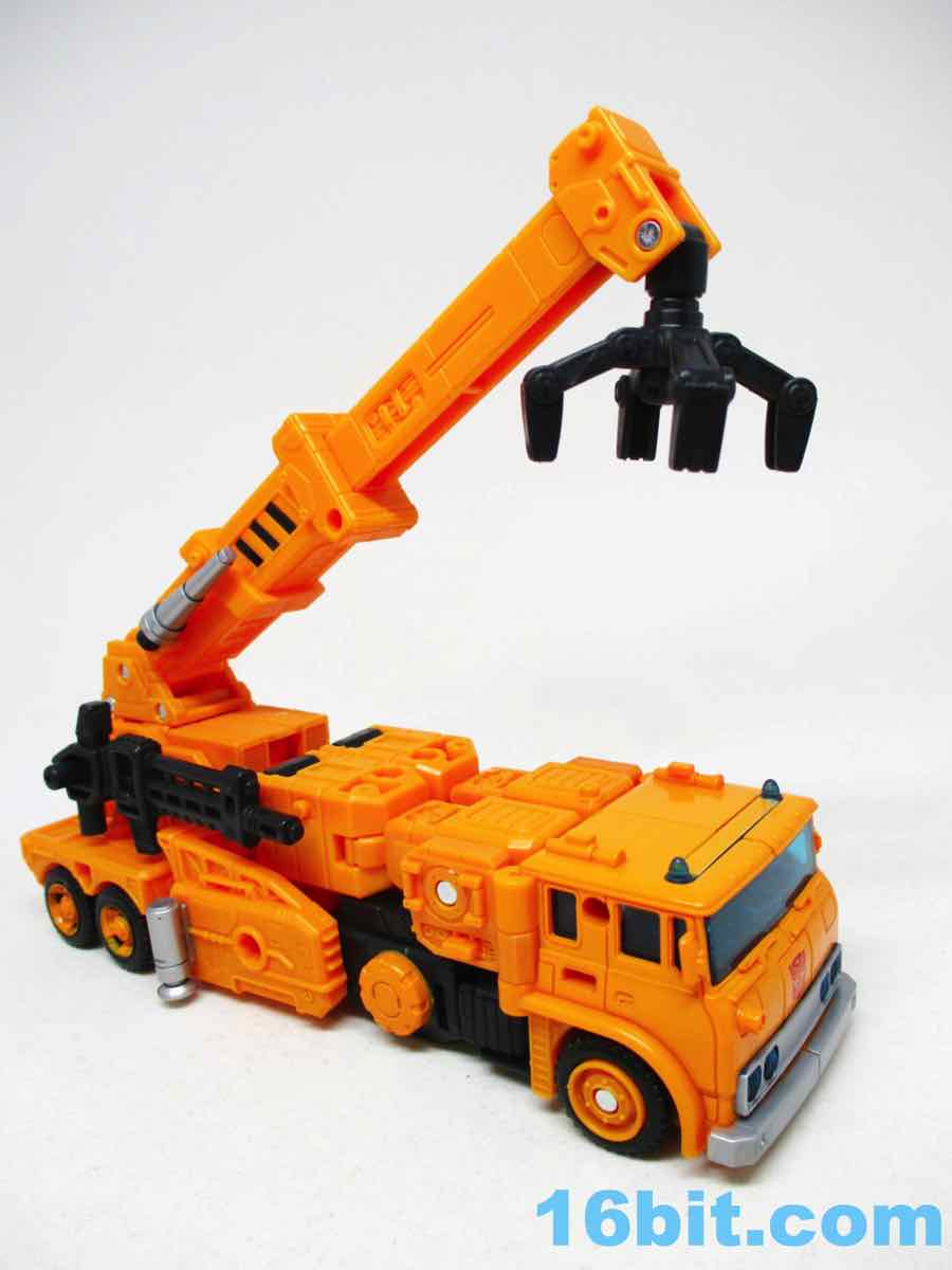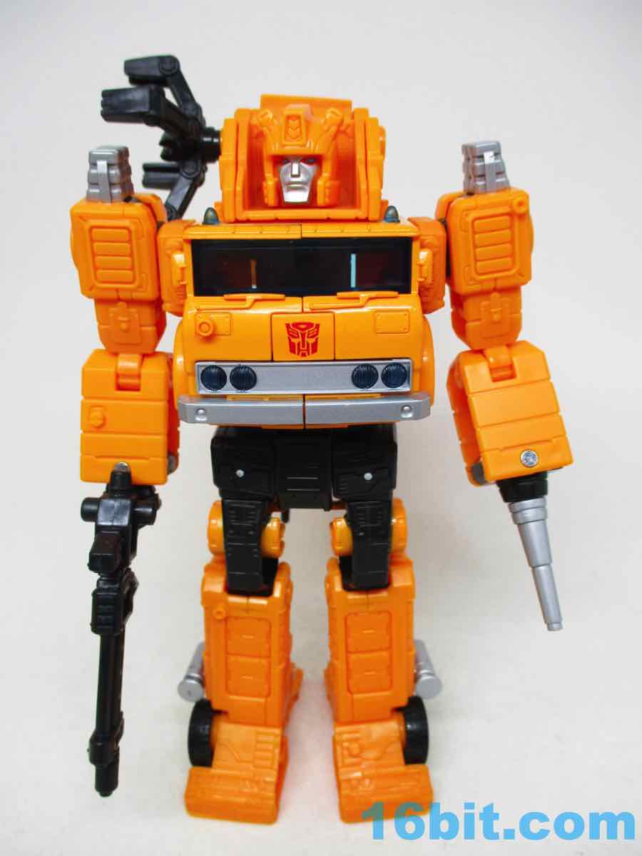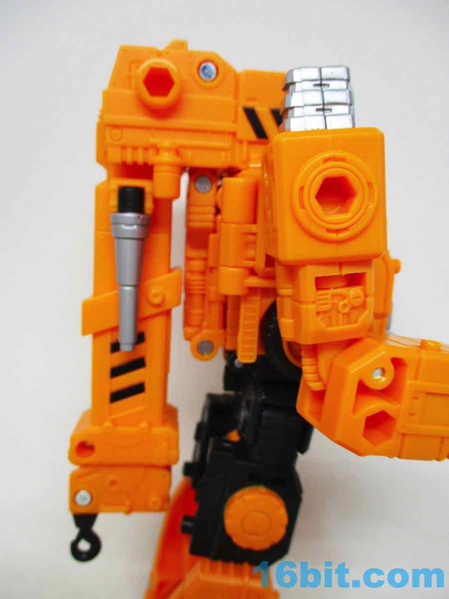 The 6 1/2-inch figure more or less grafts the design from the cartoon with the original 1984 toy. Hasbro and Takara-Tomy opted to give him the orange cartoon head rather than the toy (and occasional episode) black helmet, which makes sense as Takara-Tomy tend to favor the animation models. With about 22 meaningful points of articulation, it's a sturdy robot with great interaction with his accessories. Both fists flip around to give you 5mm sockets, so you can plug in the nozzle or the new claw arm. These accessories can also be stowed on the crane backpack. The nozzle was so nicely integrated it was fun to discover it was a bonus accessory and not just sculpted detailing.
