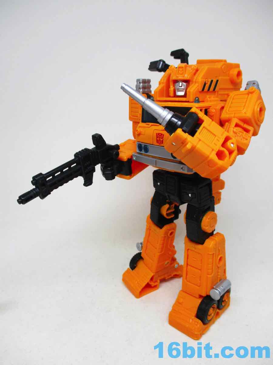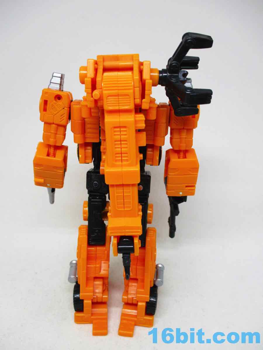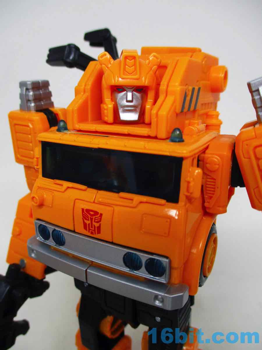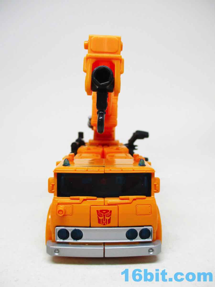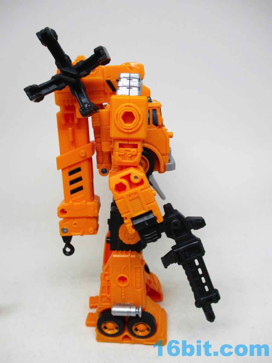 The 6 1/2-inch figure more or less grafts the design from the cartoon with the original 1984 toy. Hasbro and Takara-Tomy opted to give him the orange cartoon head rather than the toy (and occasional episode) black helmet, which makes sense as Takara-Tomy tend to favor the animation models. With about 22 meaningful points of articulation, it's a sturdy robot with great interaction with his accessories. Both fists flip around to give you 5mm sockets, so you can plug in the nozzle or the new claw arm. These accessories can also be stowed on the crane backpack. The nozzle was so nicely integrated it was fun to discover it was a bonus accessory and not just sculpted detailing.