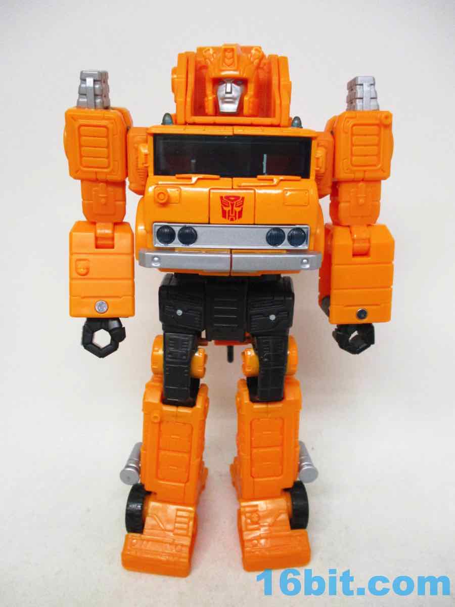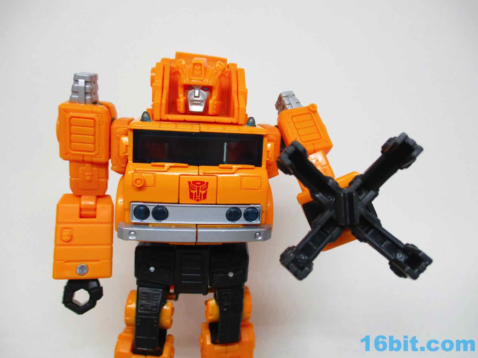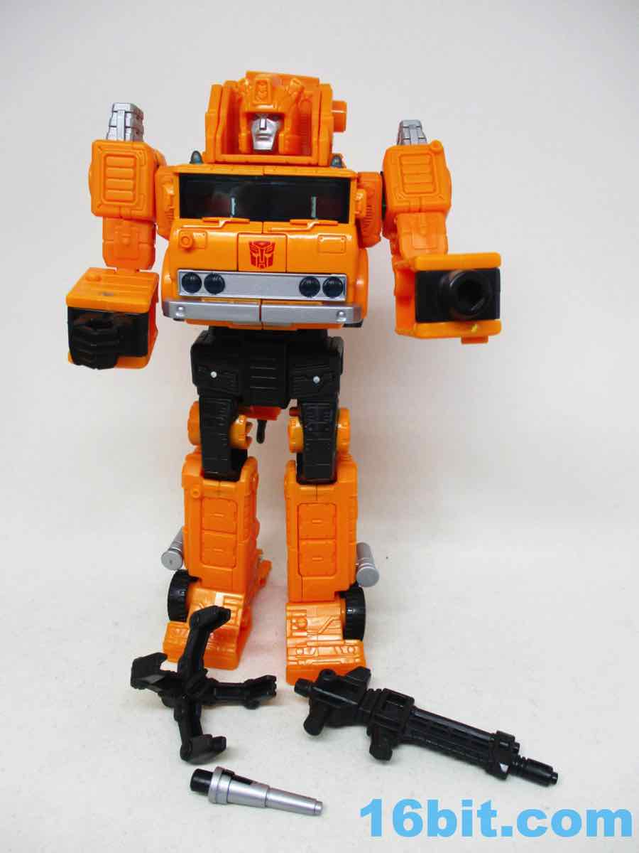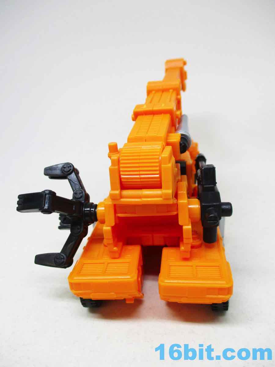 The 6 1/2-inch figure more or less grafts the design from the cartoon with the original 1984 toy. Hasbro and Takara-Tomy opted to give him the orange cartoon head rather than the toy (and occasional episode) black helmet, which makes sense as Takara-Tomy tend to favor the animation models. With about 22 meaningful points of articulation, it's a sturdy robot with great interaction with his accessories. Both fists flip around to give you 5mm sockets, so you can plug in the nozzle or the new claw arm. These accessories can also be stowed on the crane backpack. The nozzle was so nicely integrated it was fun to discover it was a bonus accessory and not just sculpted detailing.