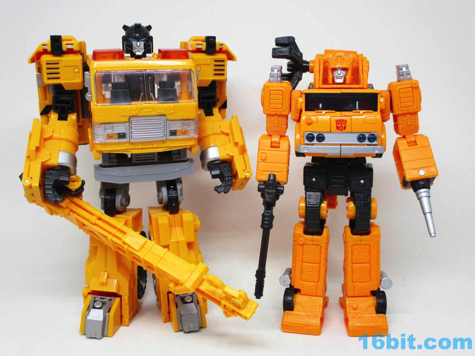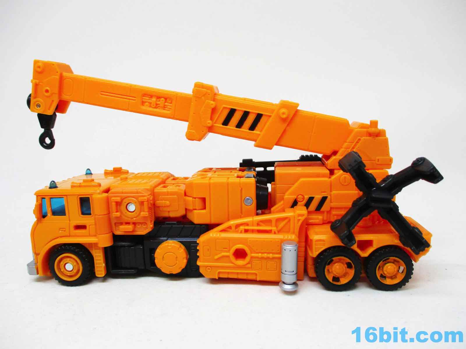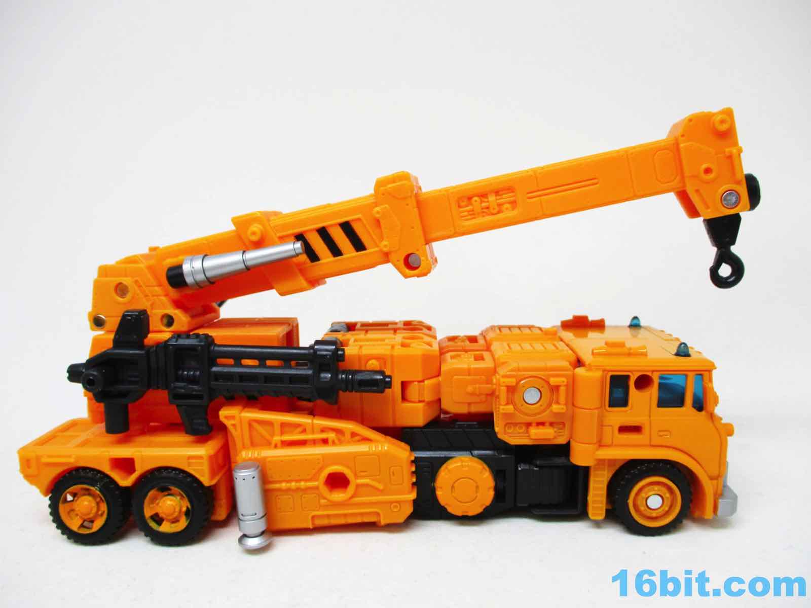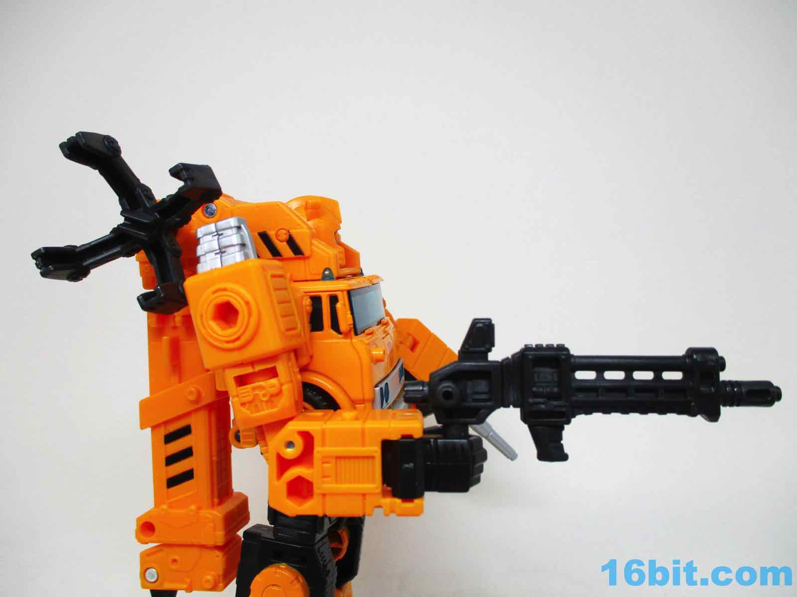 The 6 1/2-inch figure more or less grafts the design from the cartoon with the original 1984 toy. Hasbro and Takara-Tomy opted to give him the orange cartoon head rather than the toy (and occasional episode) black helmet, which makes sense as Takara-Tomy tend to favor the animation models. With about 22 meaningful points of articulation, it's a sturdy robot with great interaction with his accessories. Both fists flip around to give you 5mm sockets, so you can plug in the nozzle or the new claw arm. These accessories can also be stowed on the crane backpack. The nozzle was so nicely integrated it was fun to discover it was a bonus accessory and not just sculpted detailing.
