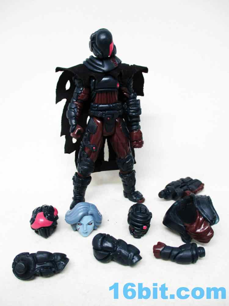 The cloth cape was sold previously with Onell Design's Renegade Gendrone figures - and a few others. The rest are all Toy Pizza parts. The CyMa blue head, small collar, and torso are all Cyber Mama parts, as is the Cobra Commander-ish masked head. There are arms, legs, and a head from the Rift Killer. The "gun" hands and shoulder armor - plus one of the heads - are from the Device Ninja. On top of all of that, there are more upper arms and I have no idea where those are from as of my writing this.