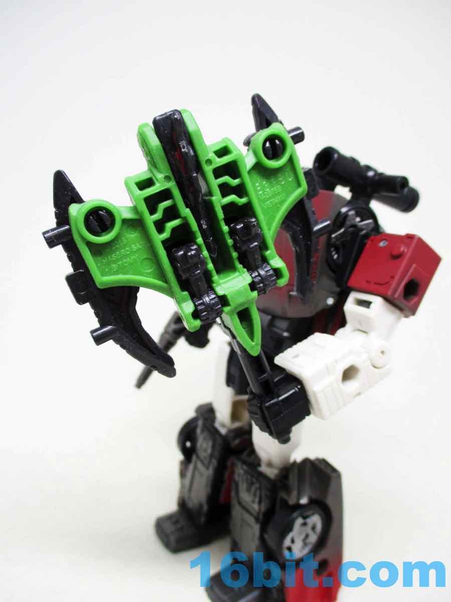 The transformation to weapon is pretty easy - tuck in the head, feet, and wings. Fold down the handle. Now you've got an axe. If you don't like the axe? There's a hidden 5mm peg under the creature's head that can serve as another place to grip the robot - and with the tail grip extended, it sure looks like a blaster to me. You can mount the blue blast effect on the tip of the grip, or on the pegs on the blades/wings for a smash clash effect.