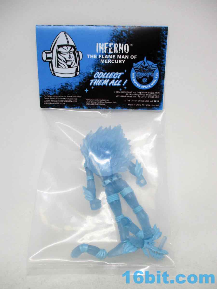 Item No.: n/a Manufacturer:The Outer Space Men Includes:Helmet, flame backpack, alternate glow arms, ray gun Action Feature:Glows blue in the dark, pops apart Retail:$25.00 Availability: November 2019 Other: Brings the total to 9 Inferno, 10 if you count weapon variants