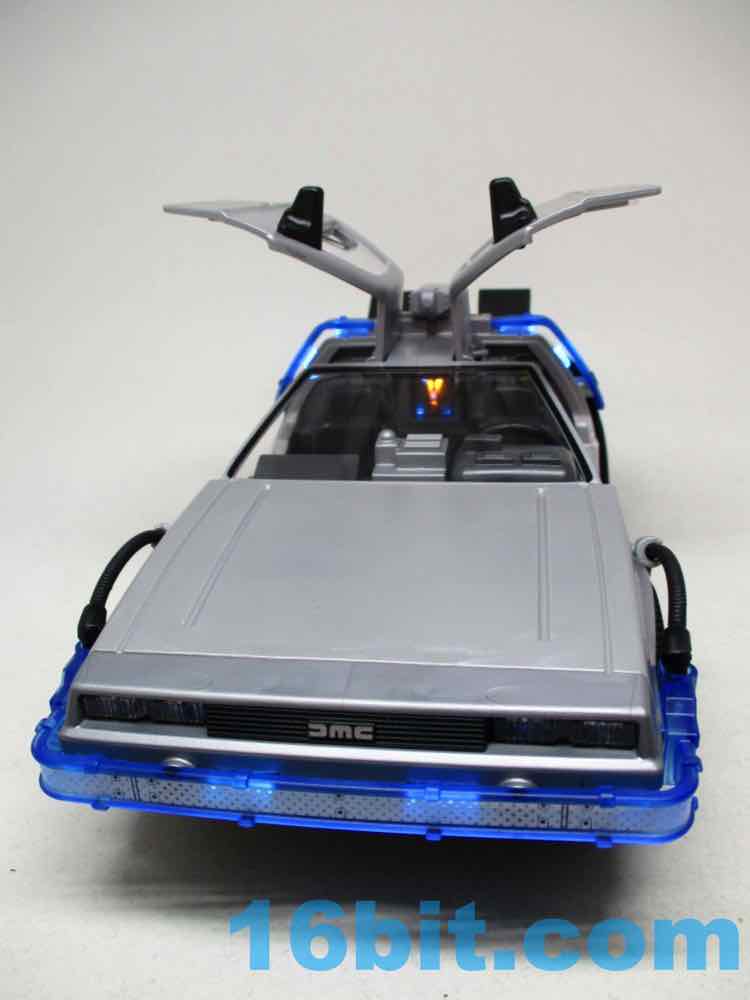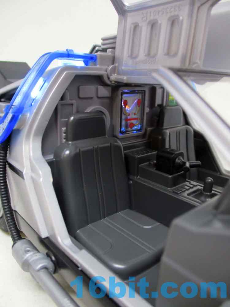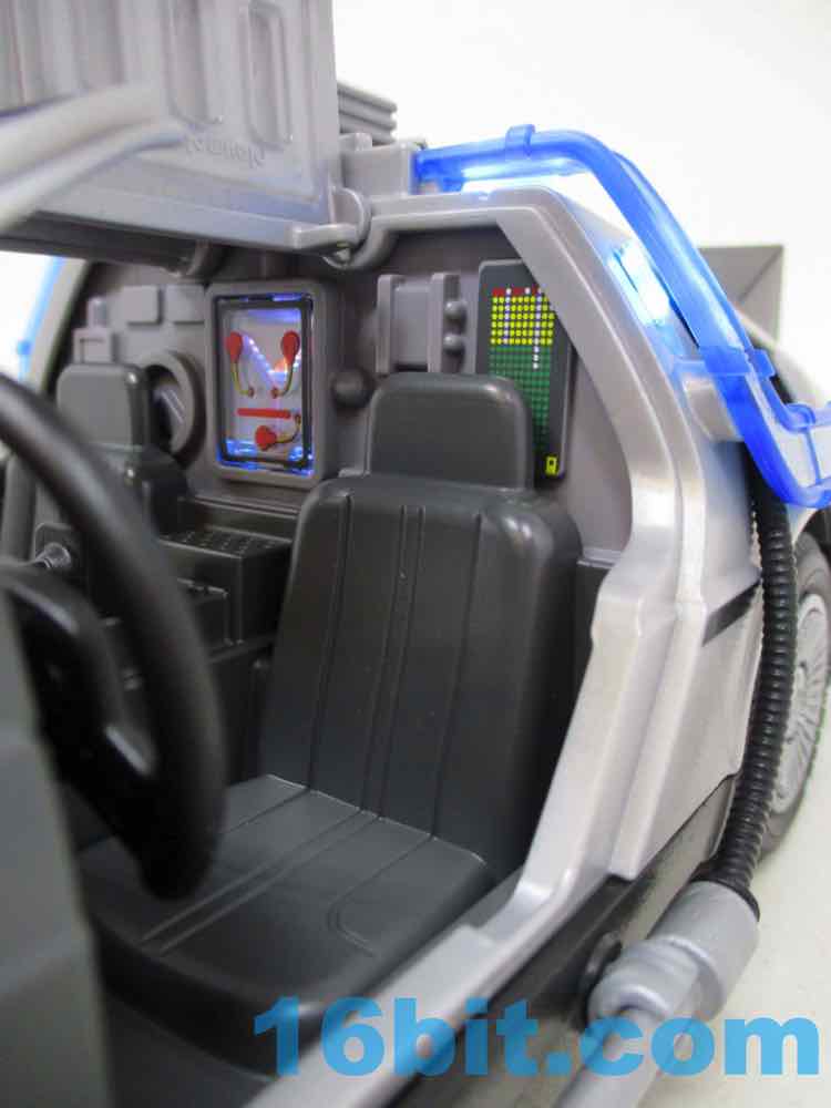 The electronics are impressive, but not robust - there's no sound effect. You get three modes of lighting - blinking, on, or off. The Flux Capacitor inside the car glows brightly and has the added benefit of making the dashboard look like it will glow. The blue cables also light up brightly, and if you're a parent you can also remove the electronic battery box completely if you prefer. It's not an option I often see on these toys.