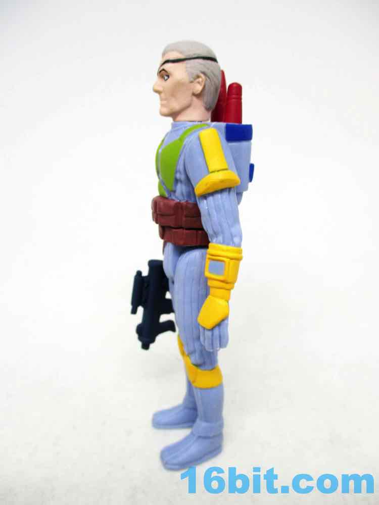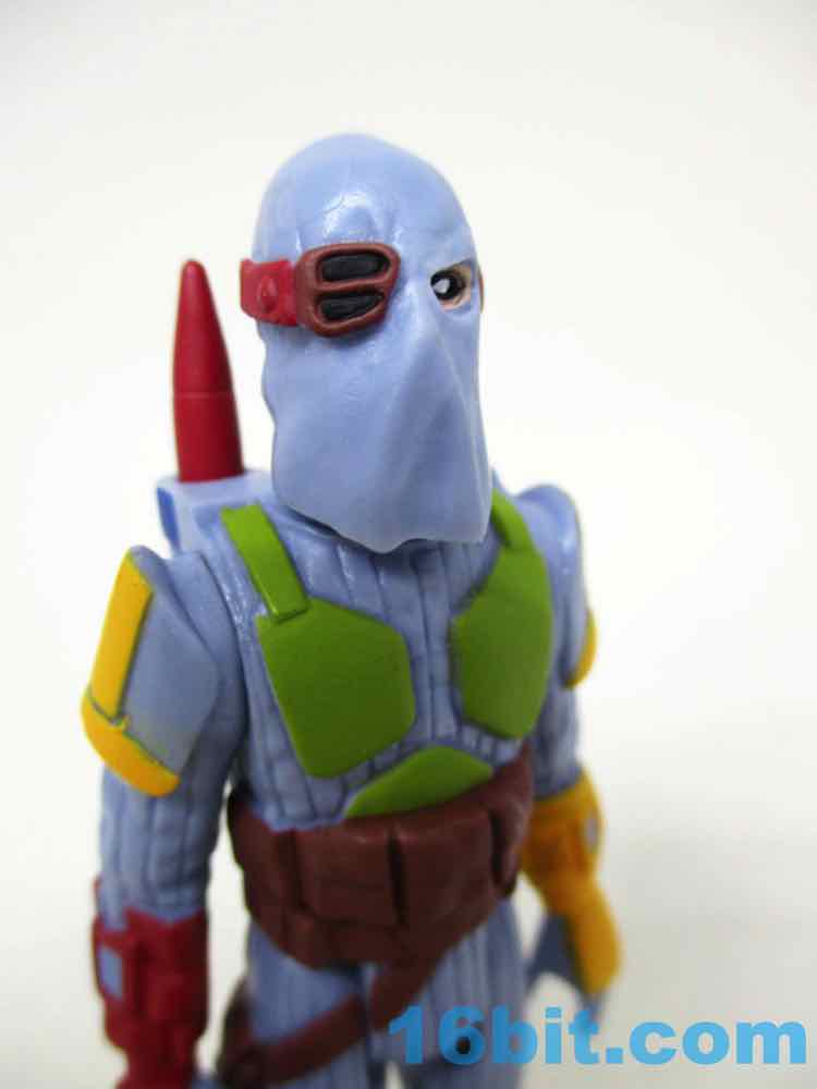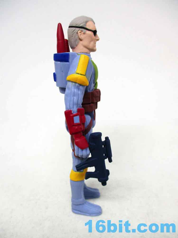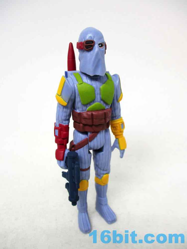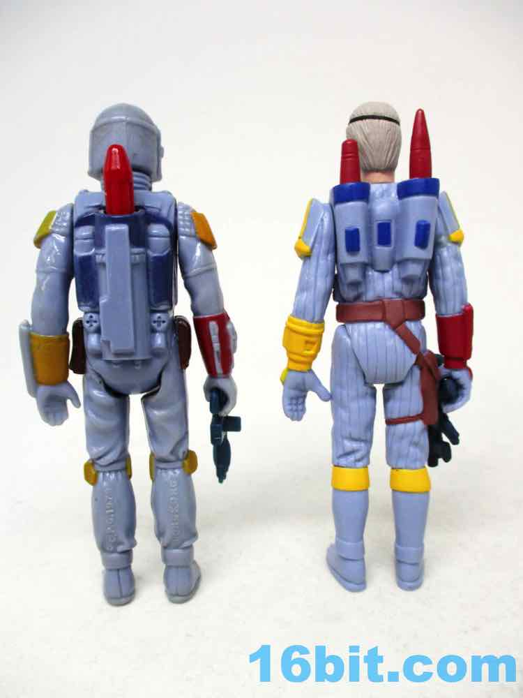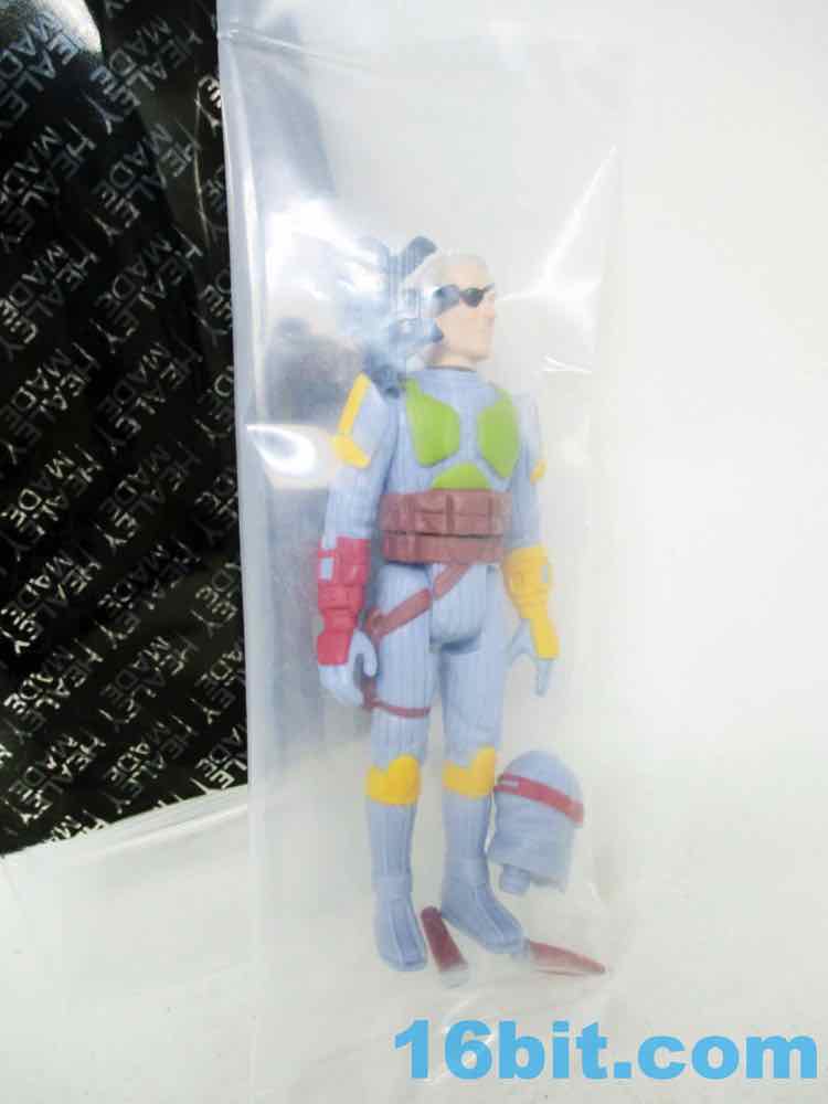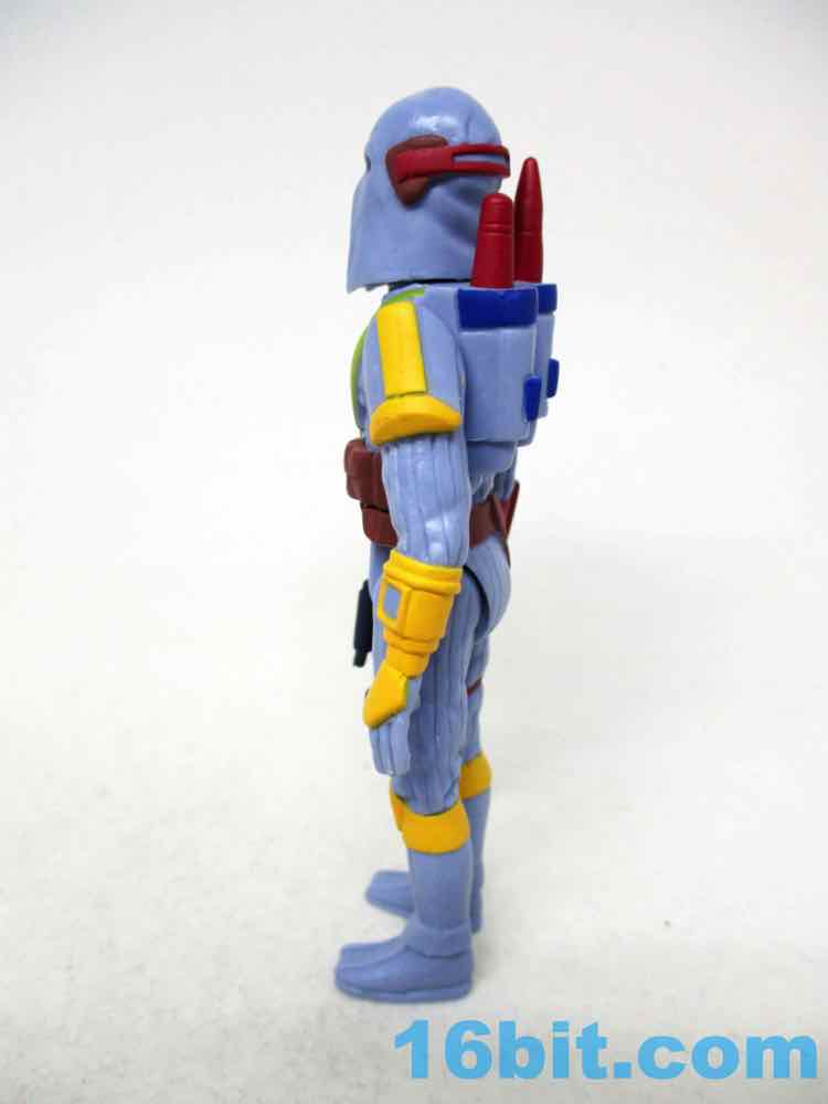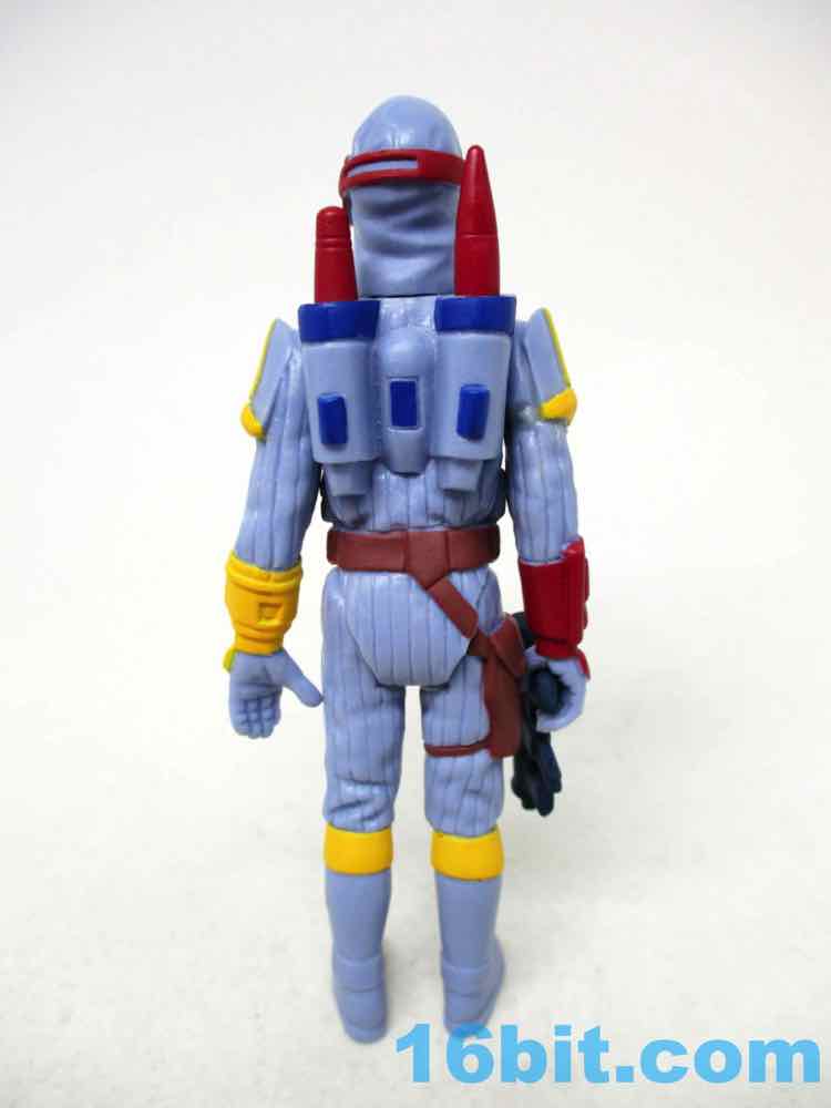 The plastic color is a hair brighter than the old Kenner Boba Fett, while the reds are decent and so are the browns. The yellows are a lot brighter, and I daresay look more interesting on the figure. The green doesn't really match at all but hey, it's not really Boba Fett. It's just a figure inspired by old Kenner toys like Boba Fett and Hasbro's Cobra Commander. This 3 3/4-inch figure has 2 removable rockets in the backpack, and additional 2 rockets in the baggie, and an alternate head. There's also a blaster pistol in colors very close to the classic Kenner blue. I should note it's a good fit in his hand.
