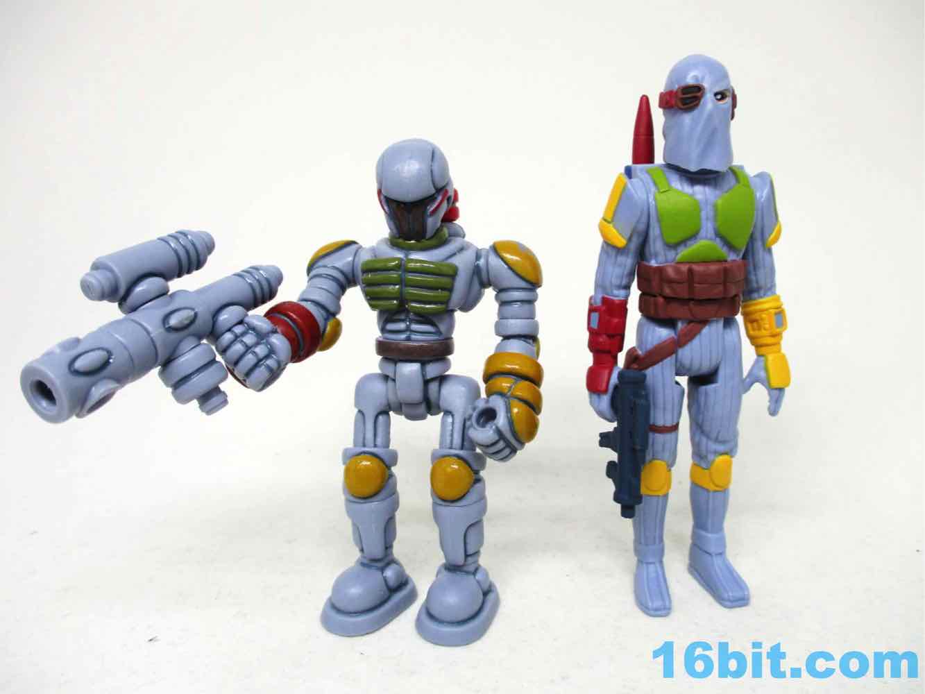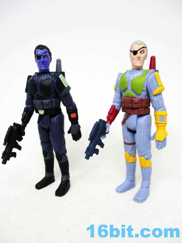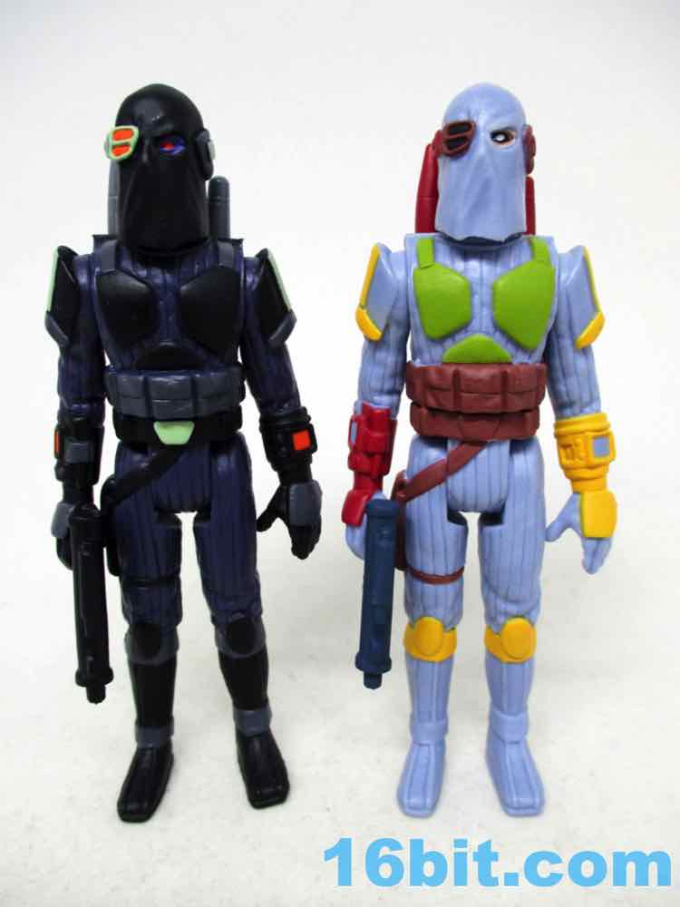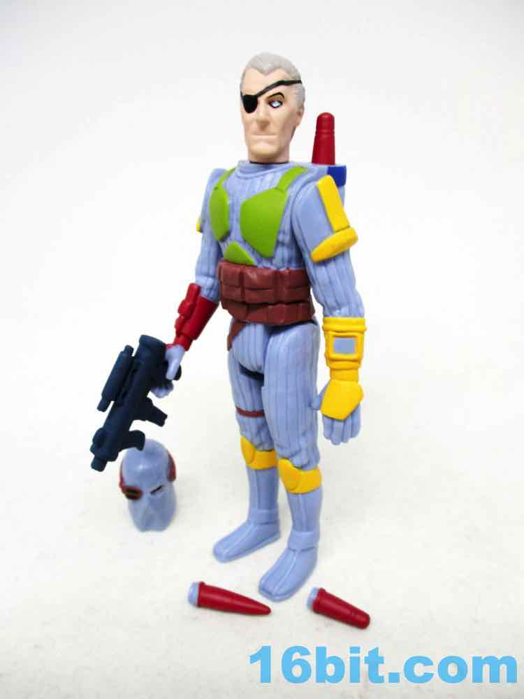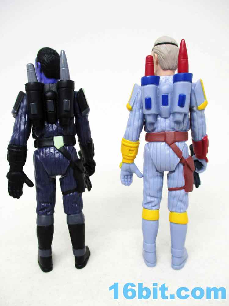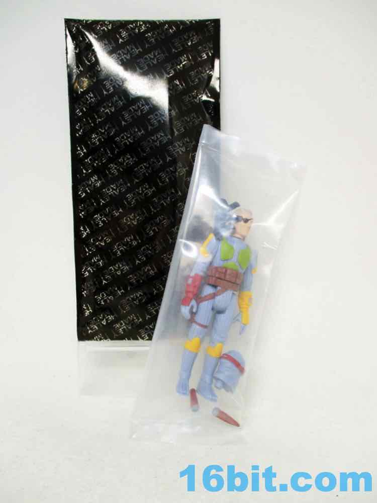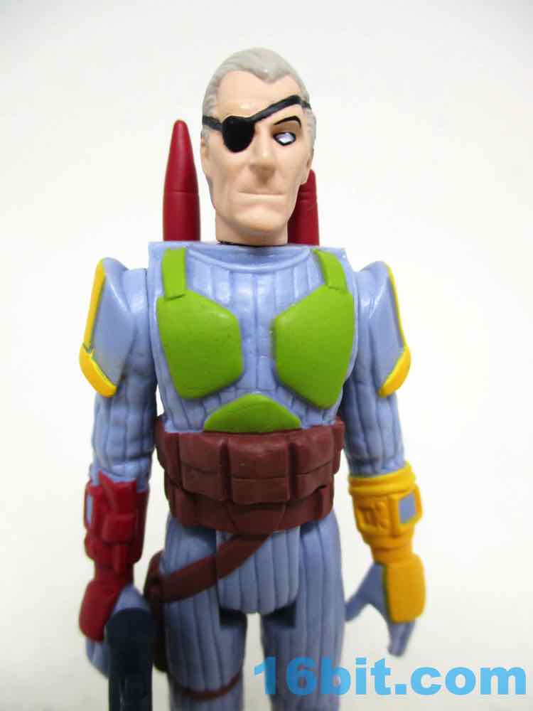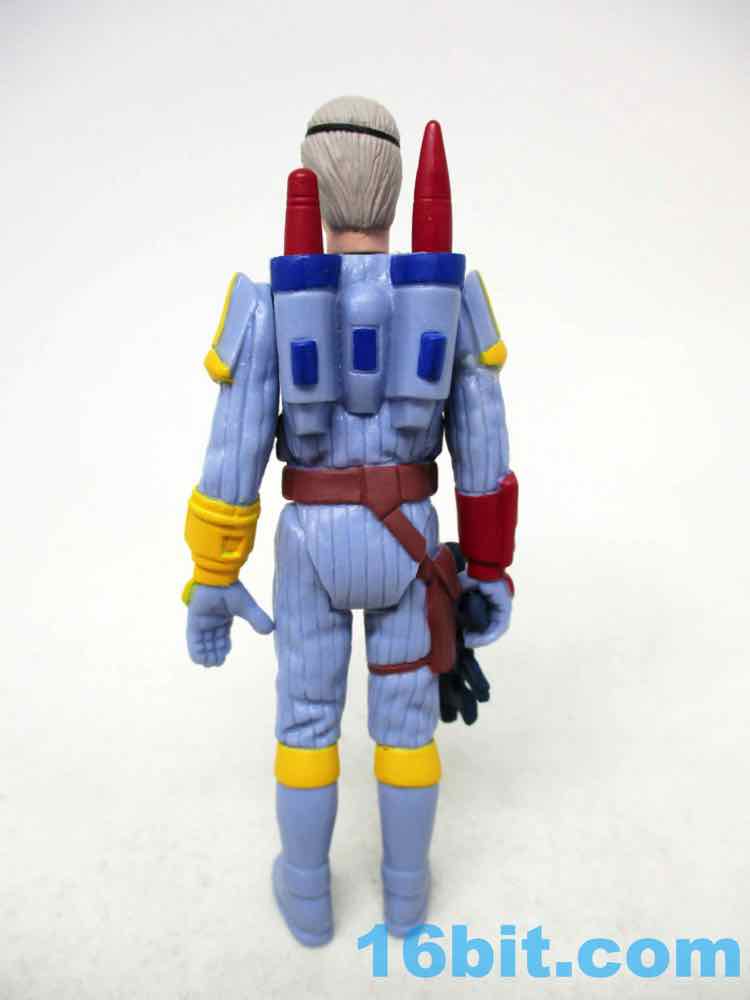 The plastic color is a hair brighter than the old Kenner Boba Fett, while the reds are decent and so are the browns. The yellows are a lot brighter, and I daresay look more interesting on the figure. The green doesn't really match at all but hey, it's not really Boba Fett. It's just a figure inspired by old Kenner toys like Boba Fett and Hasbro's Cobra Commander. This 3 3/4-inch figure has 2 removable rockets in the backpack, and additional 2 rockets in the baggie, and an alternate head. There's also a blaster pistol in colors very close to the classic Kenner blue. I should note it's a good fit in his hand.