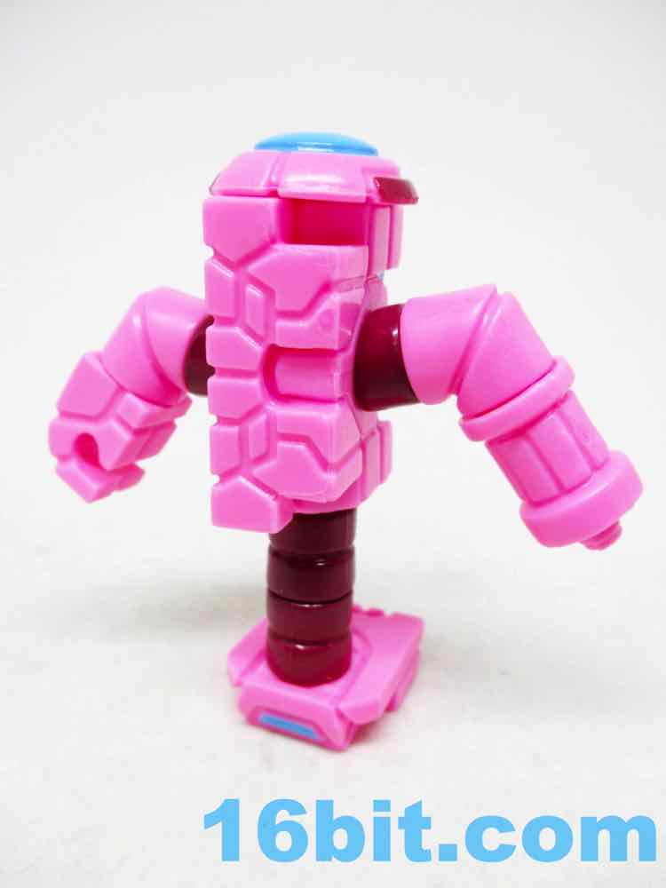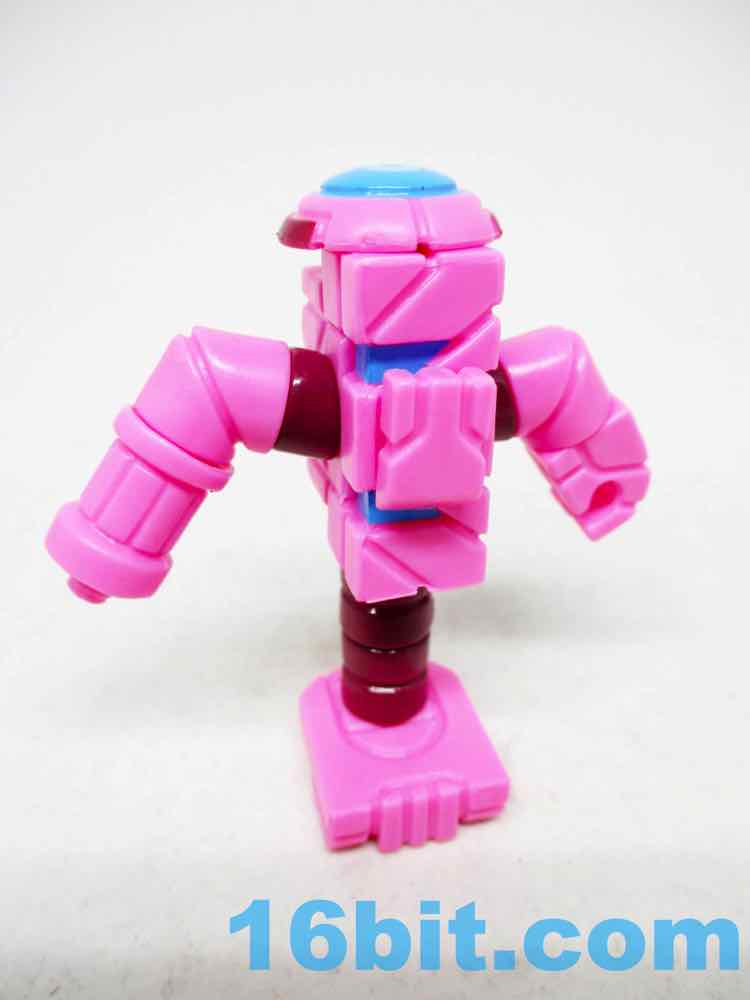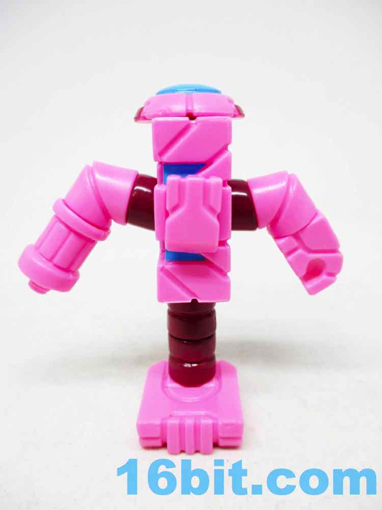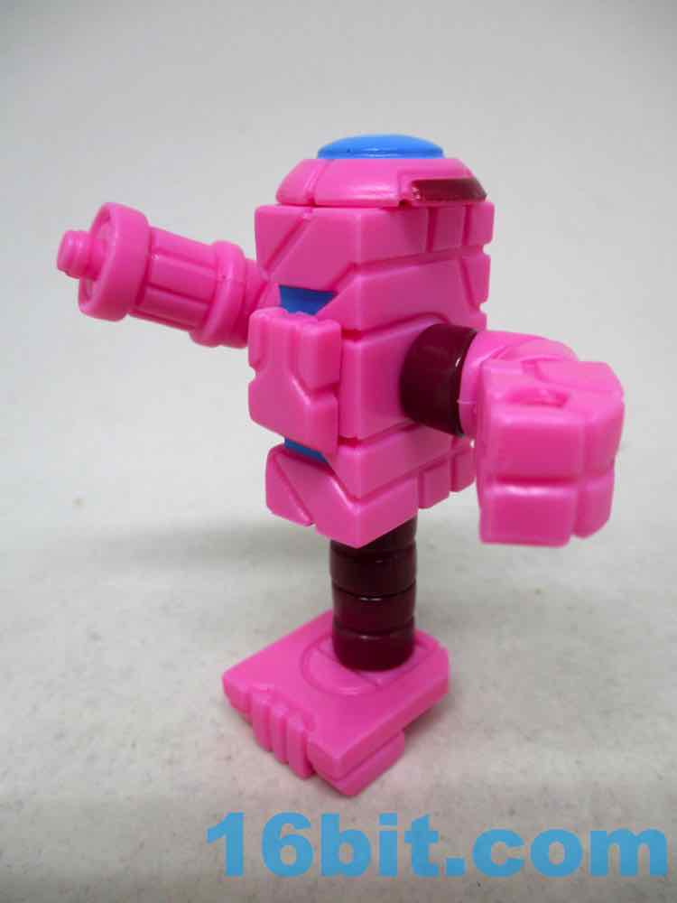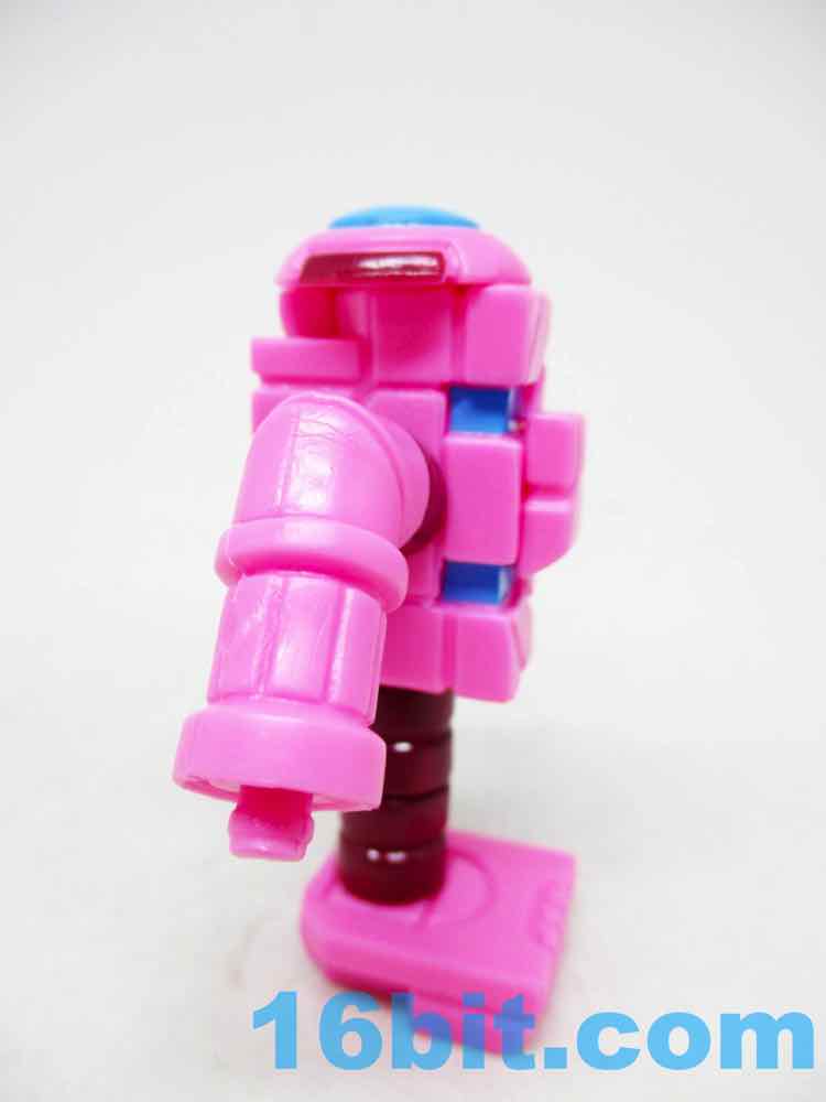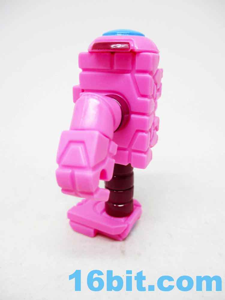 You might recognize elements from the Zeroid mold, like a blaster arm and an open fist hand. It looks like it could be one of Dr. Wily's hordes from a Mega Man game, or some weird background robot from the yellowing pages of a newsprint comic book. This is a great example of the "LEGO set action figure" ethos from the line's early days, showing you the hidden potential in each of these kits if you happen to have an eye to see these things. (I don't, I need to have it pointed out to me.) The bright pink figure has darker painted pieces to give you some contrast, and the figure's "head" is capped by a blue circle. It's kind of like R2-D2, but with a different shape and a unique logo.
