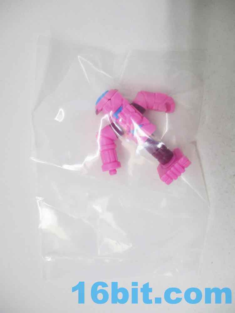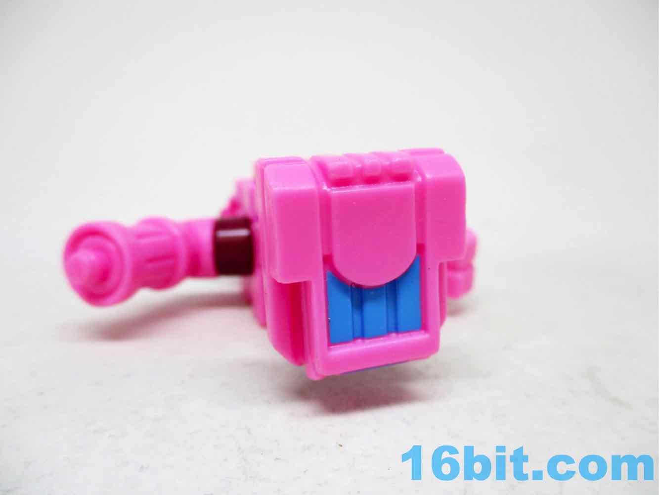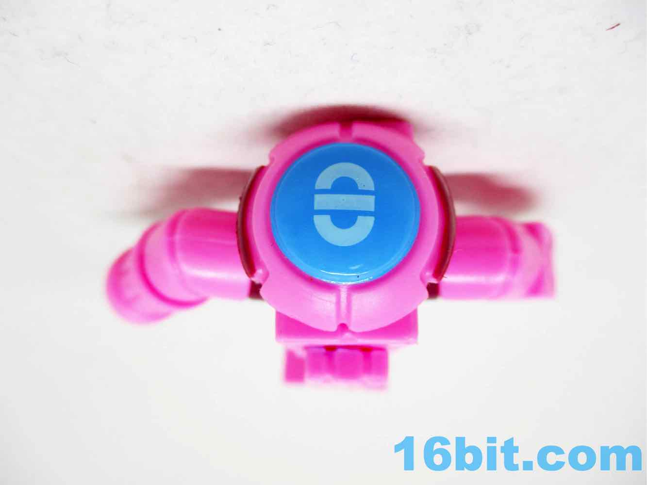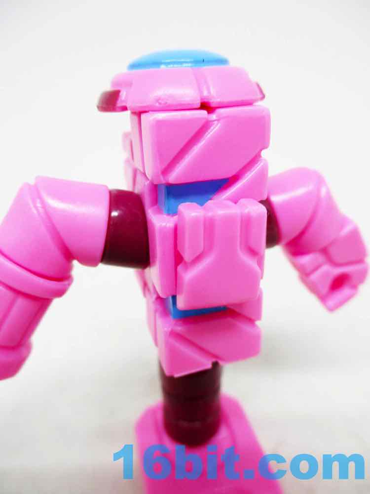 You might recognize elements from the Zeroid mold, like a blaster arm and an open fist hand. It looks like it could be one of Dr. Wily's hordes from a Mega Man game, or some weird background robot from the yellowing pages of a newsprint comic book. This is a great example of the "LEGO set action figure" ethos from the line's early days, showing you the hidden potential in each of these kits if you happen to have an eye to see these things. (I don't, I need to have it pointed out to me.) The bright pink figure has darker painted pieces to give you some contrast, and the figure's "head" is capped by a blue circle. It's kind of like R2-D2, but with a different shape and a unique logo.