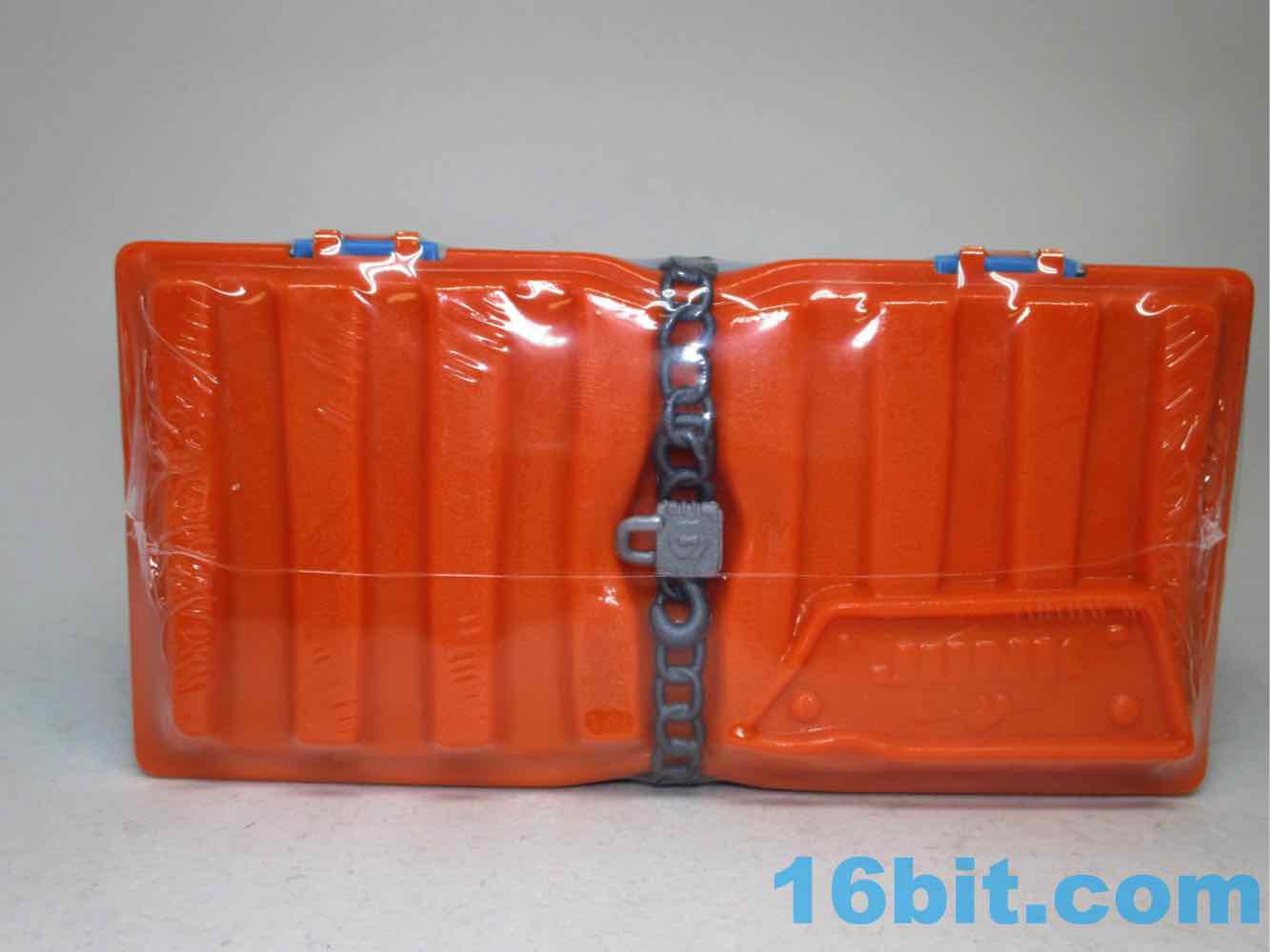 To open it, you rip off the plastic wrap and stretch the plastic chain over the dumpster - or pop the lock. I stretched it, it was much easier.
