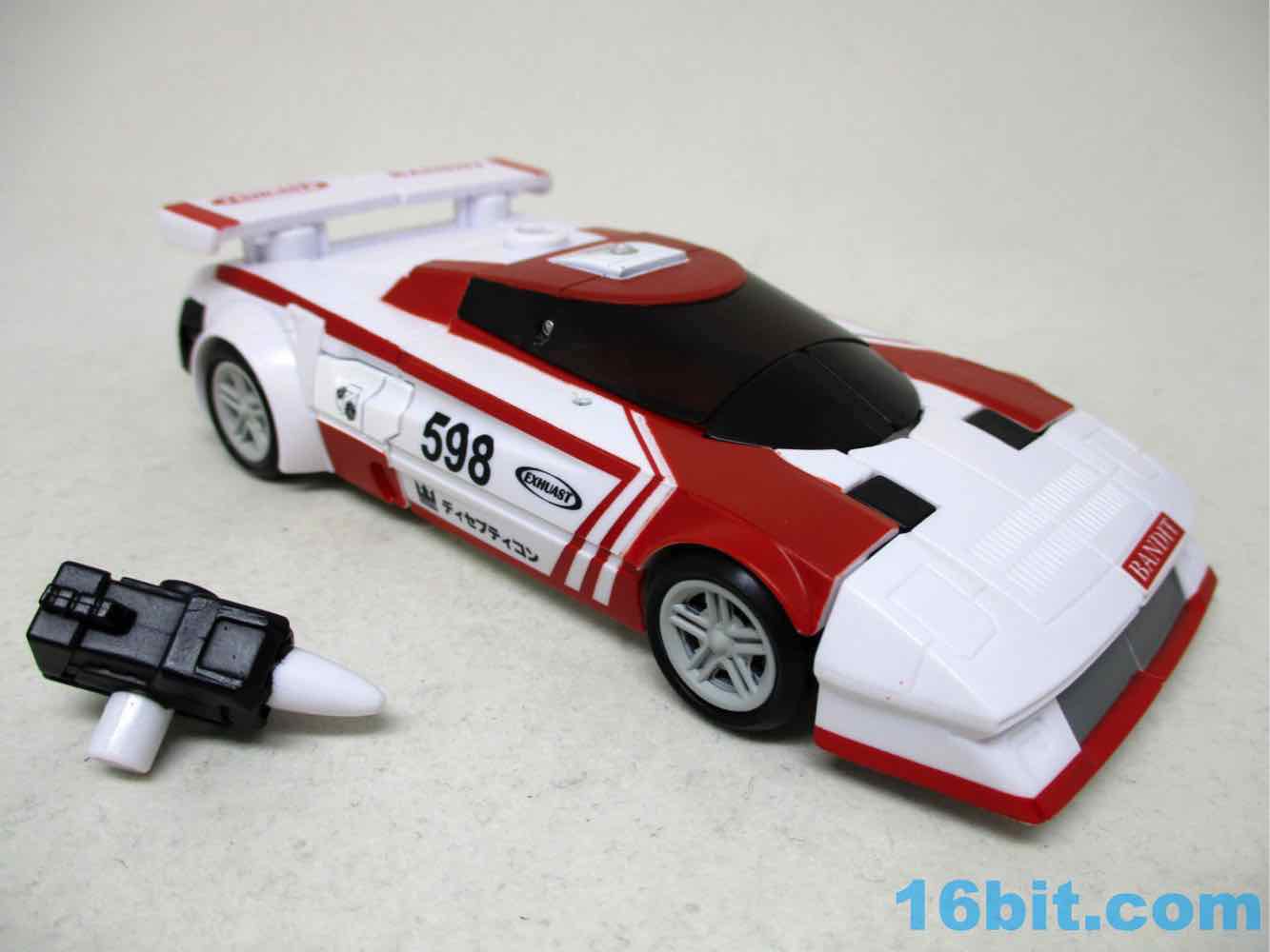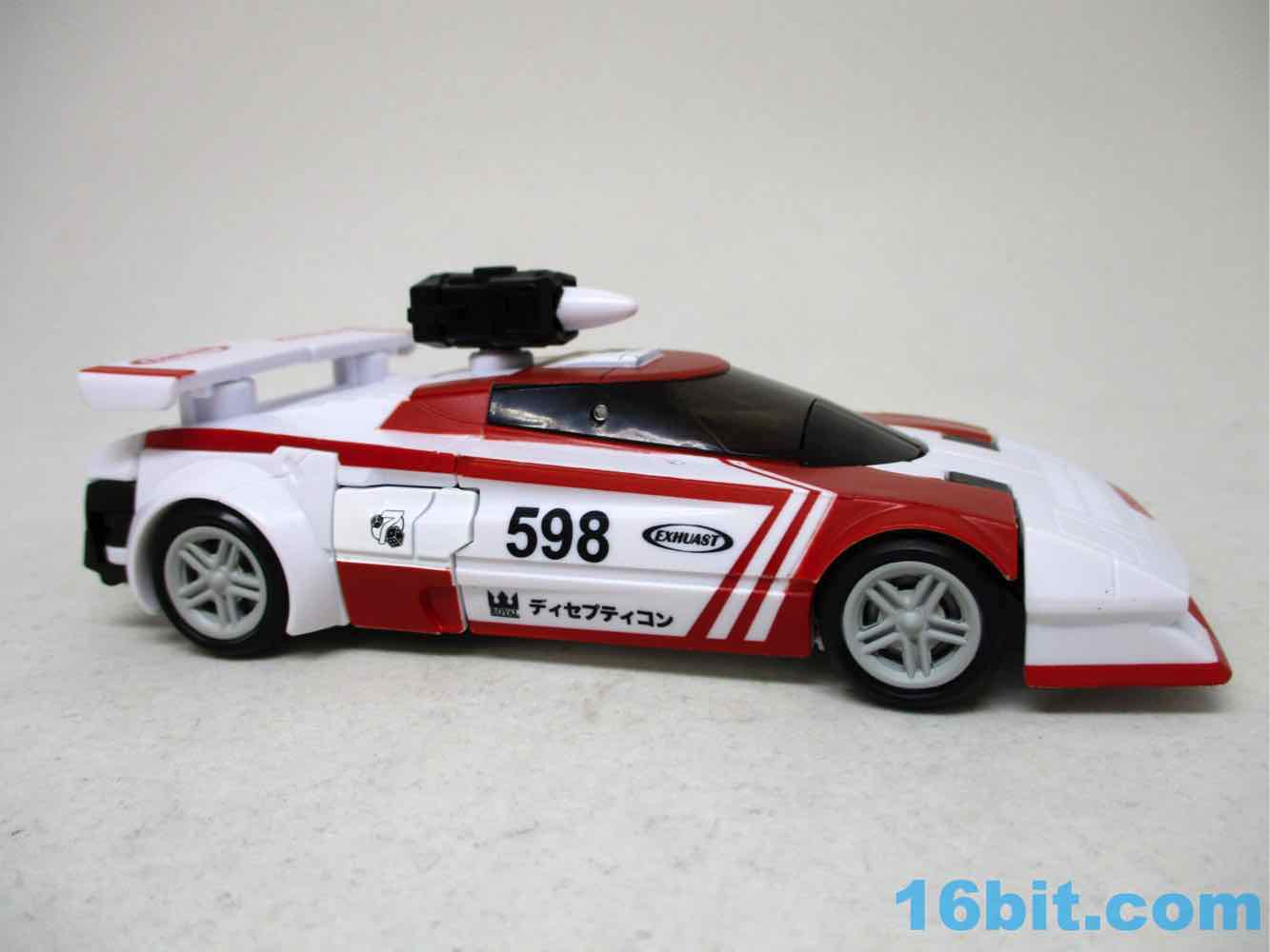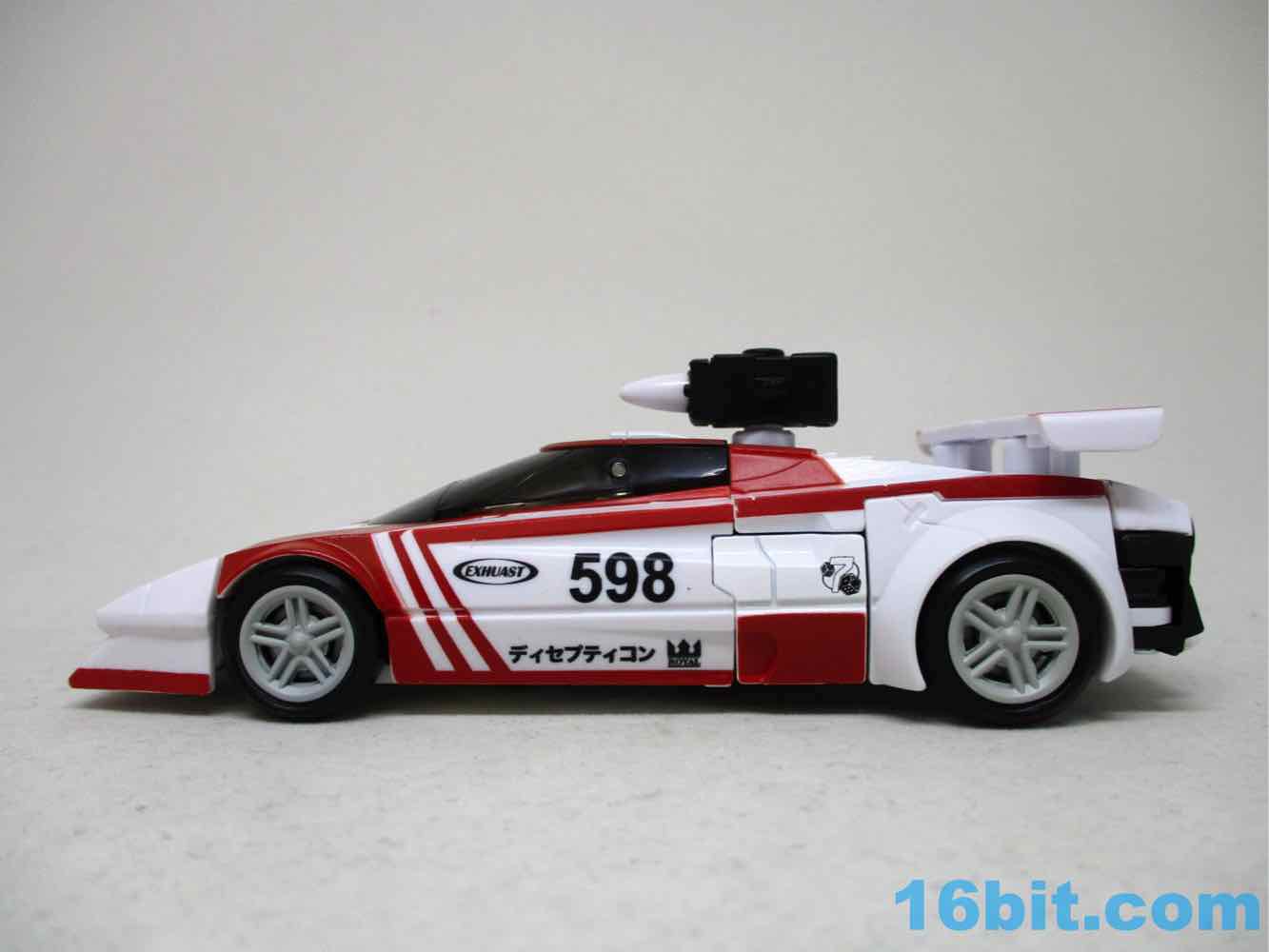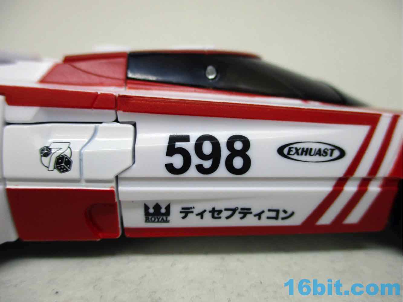 If ever there needed to be a name to perfectly sum up the emotional mood of the year, it's Decepticon Exhaust. Modeled loosely off an old race car which is itself modeled after a pack of smokes, this Wheeljack redeco/retool has been modified so it doesn't look like a pack of Marlboros anymore. While not nearly as ornate as Earthrise Wheeljack, Exhaust does have "BANDIT" and "EXHAUST" written on him as well as - I'm told - the word "Decepticon" in Japanese. It also has a 598 on the door - just like the original - but the classic Decepticon symbol was replaced with that of a mercenary faction.