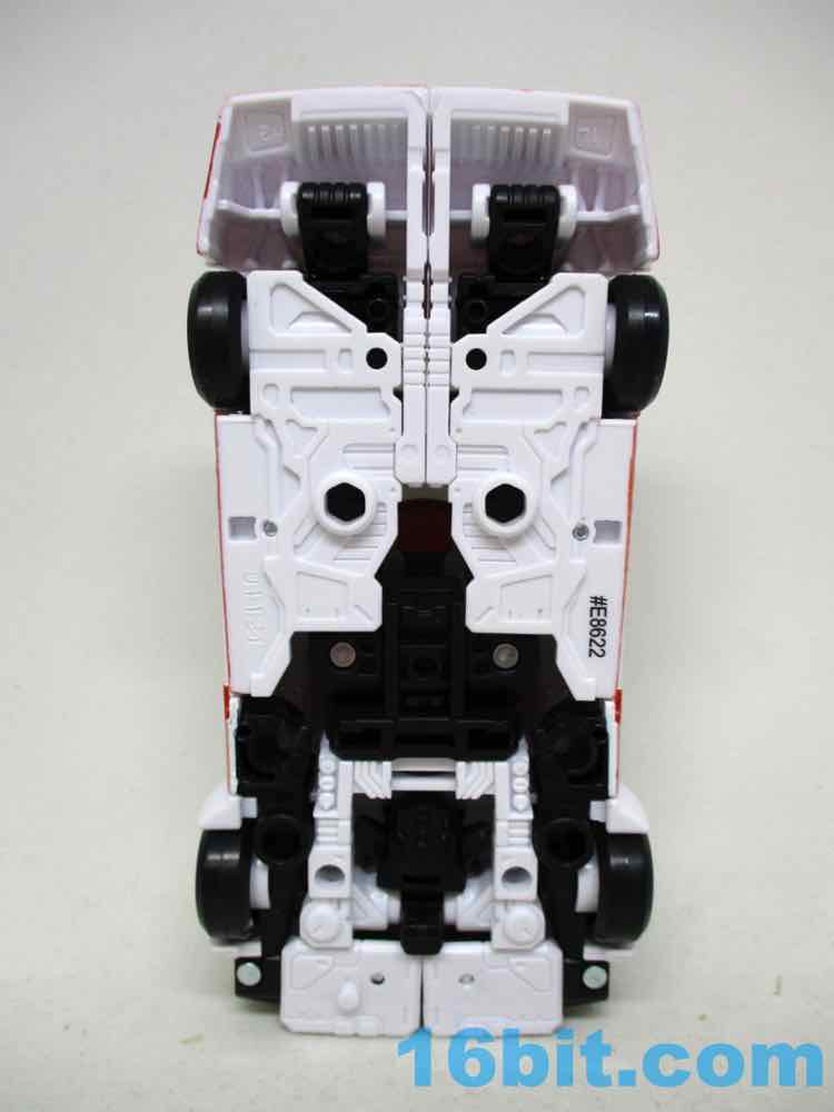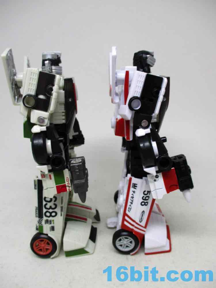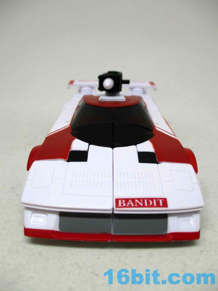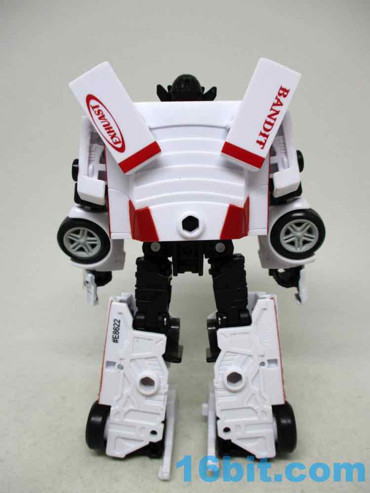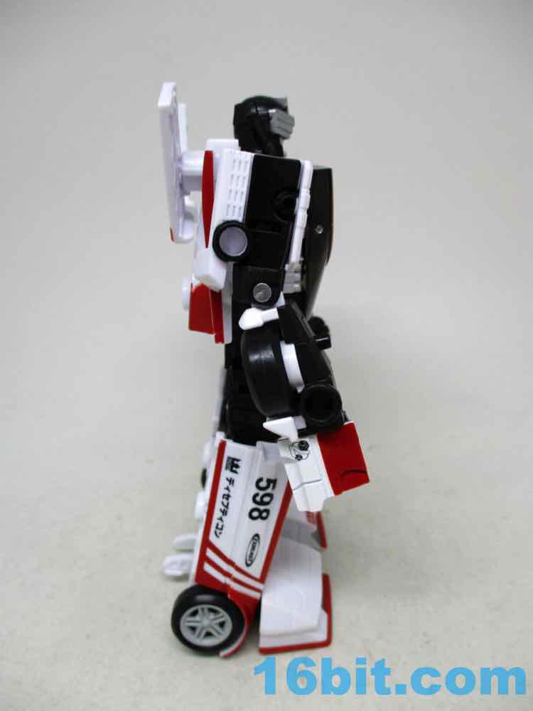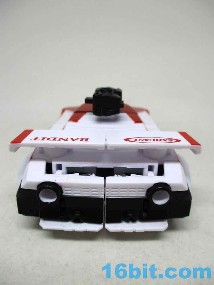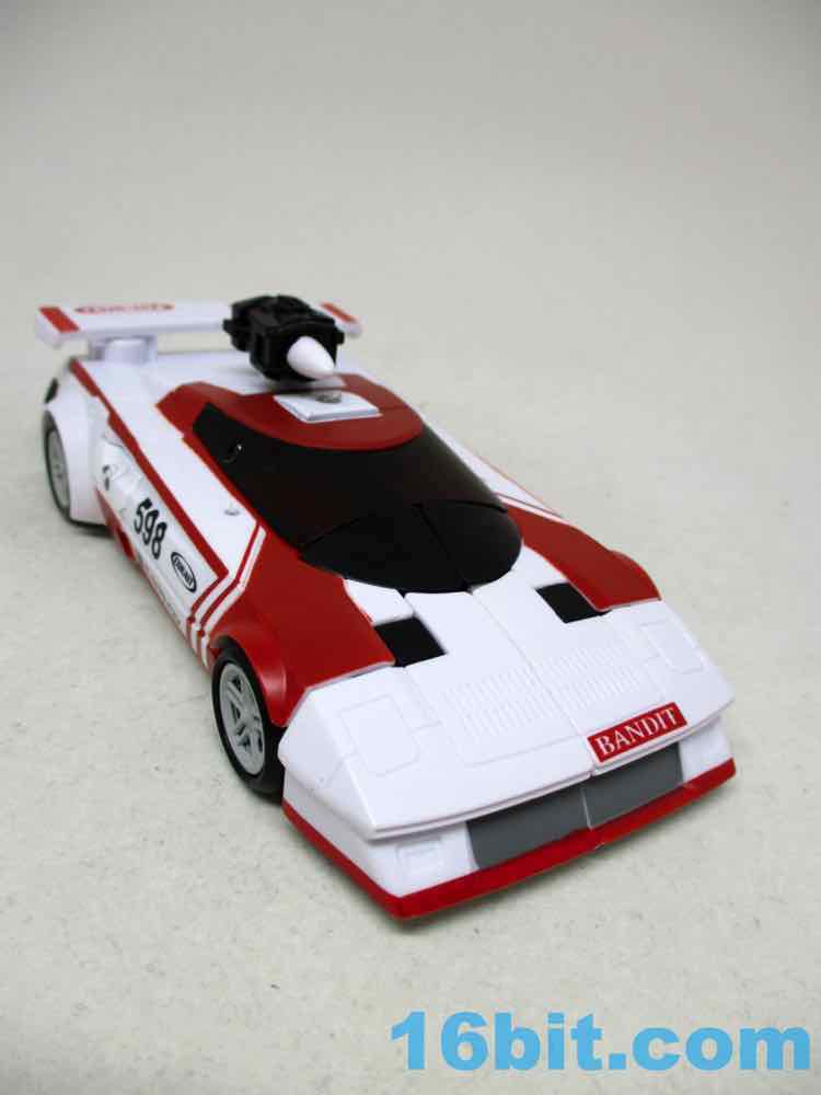 Transformation is a bit of a hassle thanks to the weird window bits that pop off easily - I don't think you'll be able to change him without knocking off a piece at least once. Other than this, it's a pretty great puzzle to play with. Robot arms become the rear bumper and most of the doors, the front of the car becomes the feet, and there are lots of moving parts to contort into a decent, nicely-sized toy car with white wheel covers.
