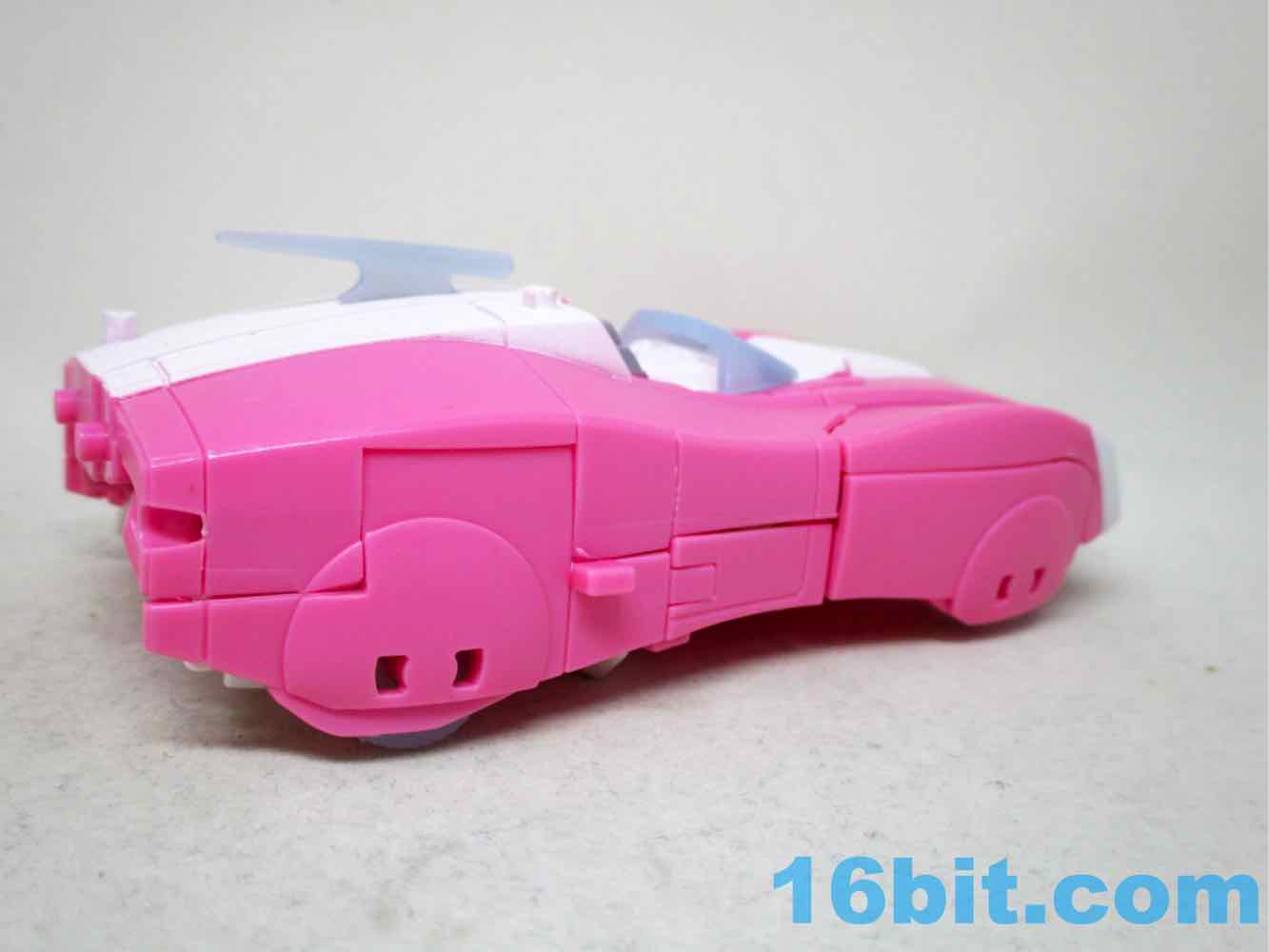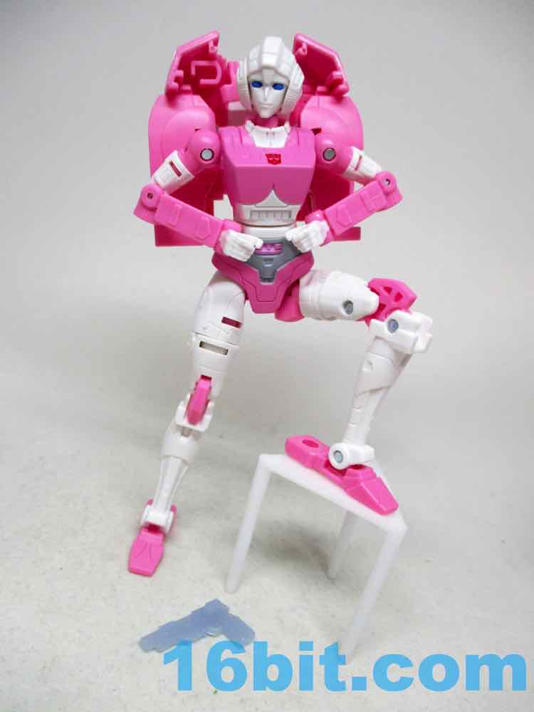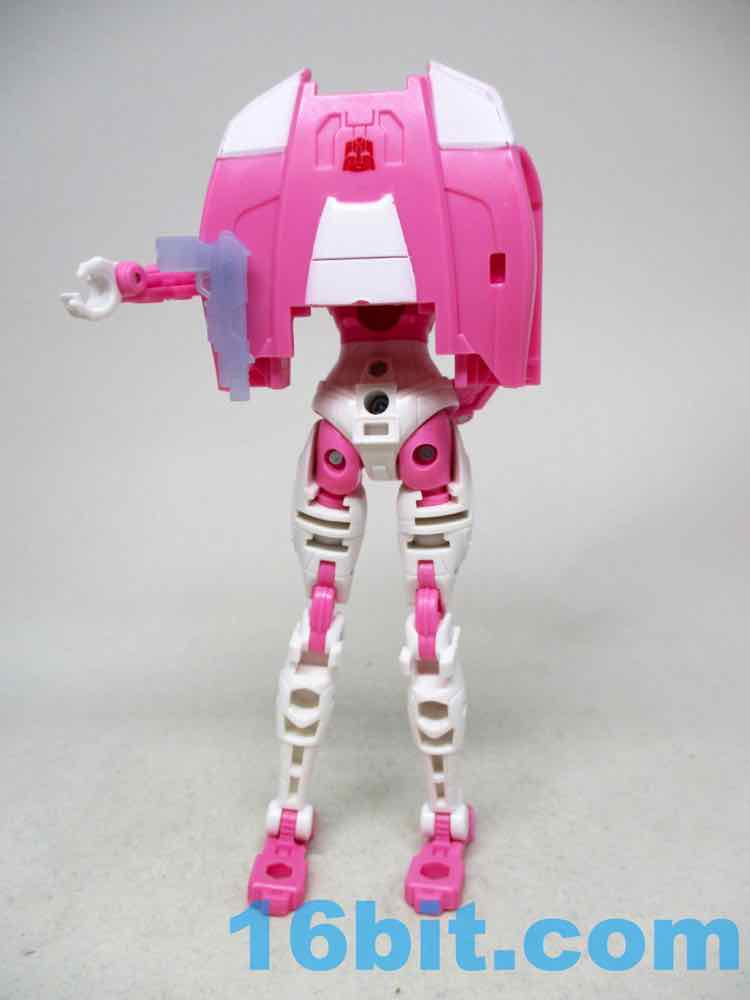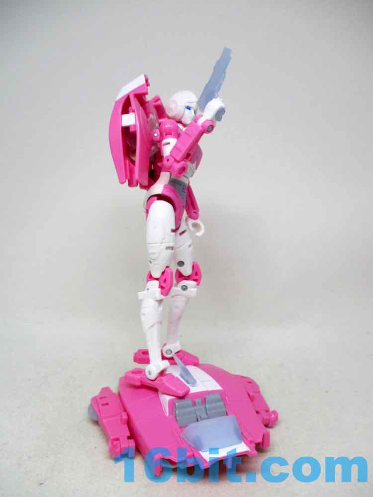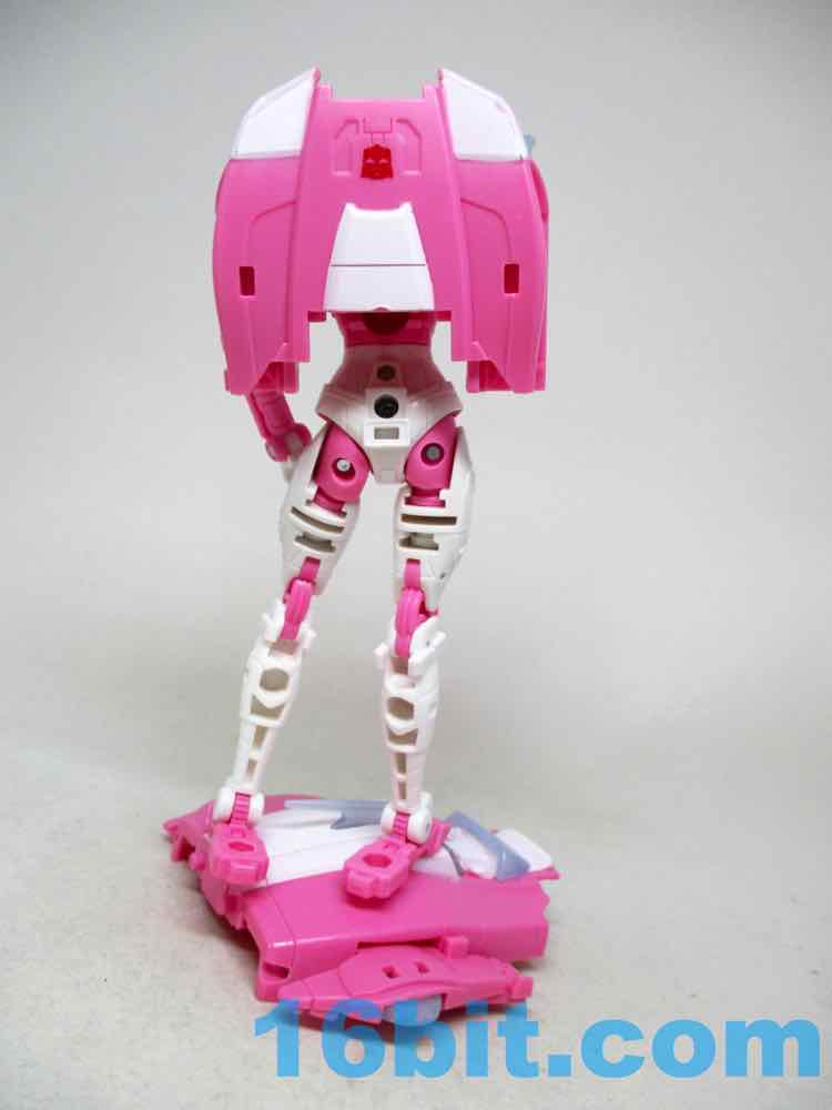 For all intents and purposes, Arcee is a great action figure and a poor "transformer." The robot has a stunning 28 points of articulation, and absolutely none of the robot makes up parts of the car. You can pop off a chunk of her car kibble and use it as a hoverboard, and with the right tools you could knock out a pin and have the complete car and the complete robot standing side by side. Hasbro could just as easily have put out a "pretender" type toy here - and may have saved money doing so.