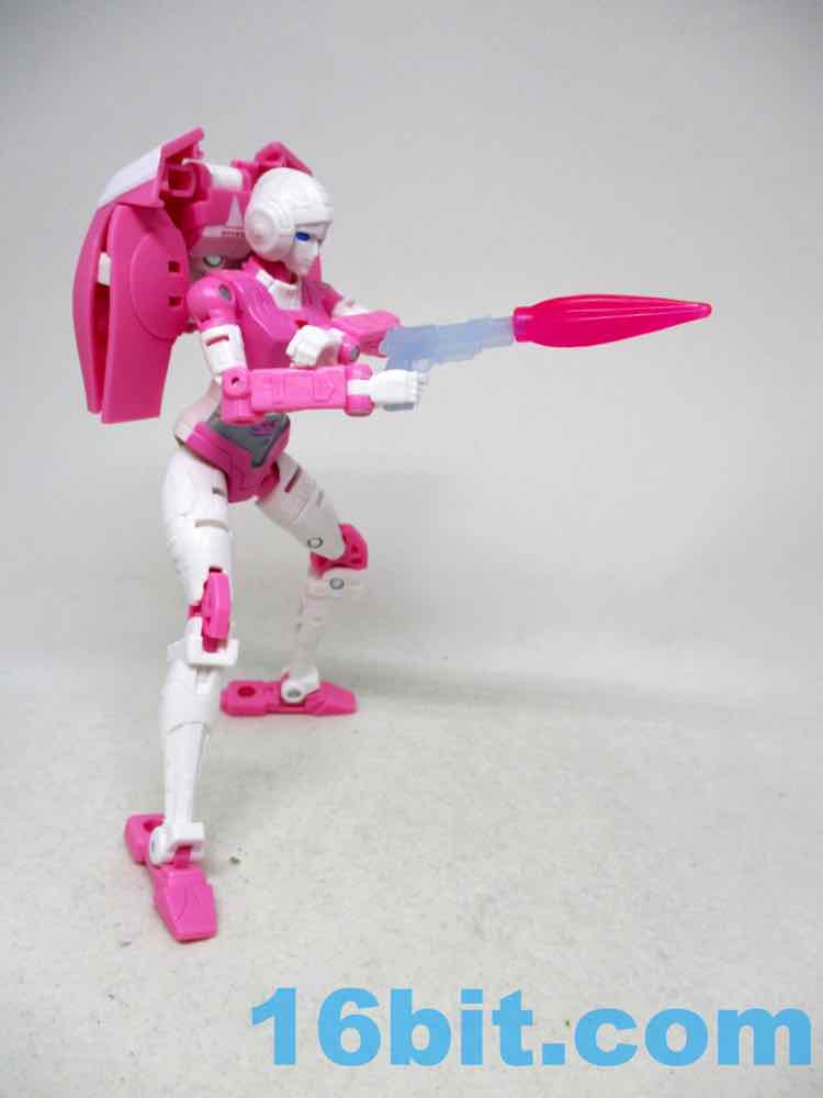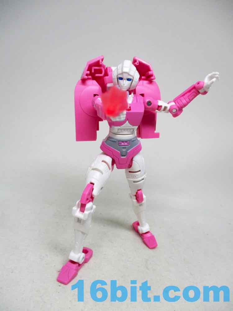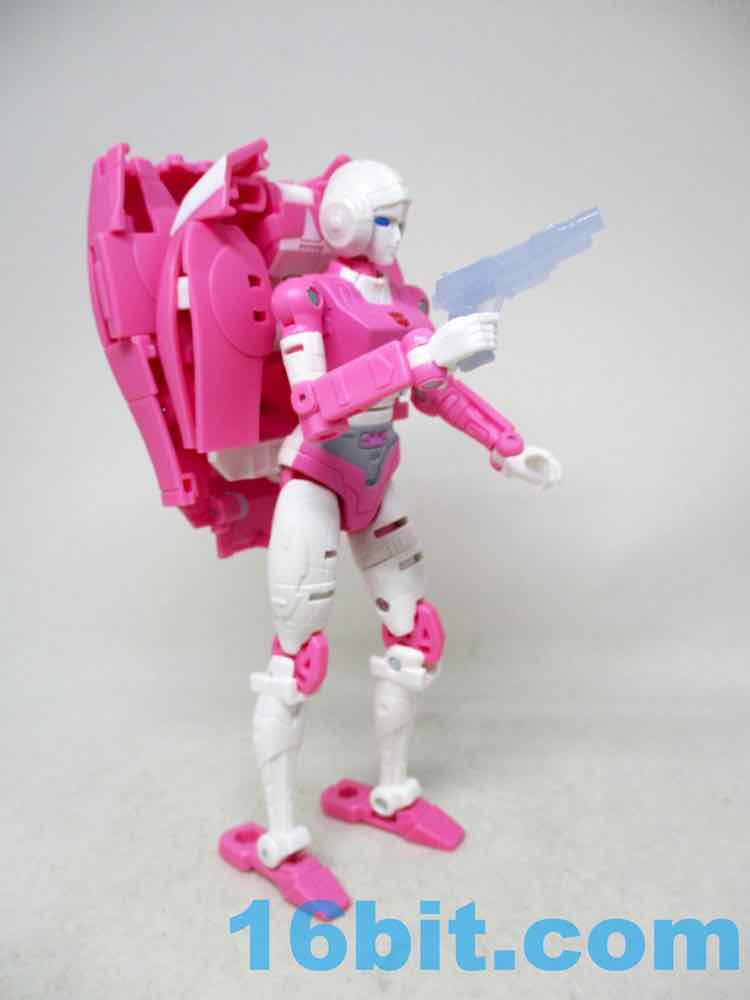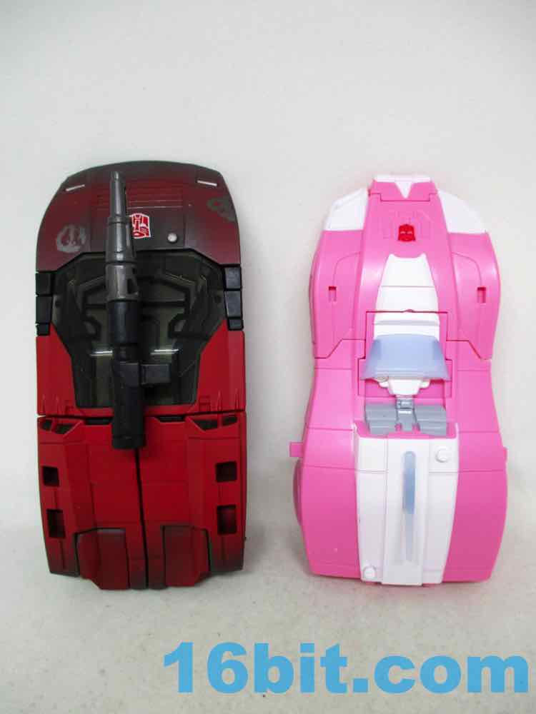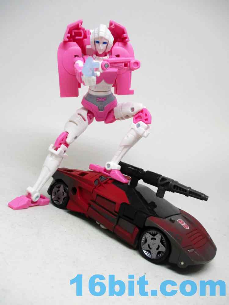 For all intents and purposes, Arcee is a great action figure and a poor "transformer." The robot has a stunning 28 points of articulation, and absolutely none of the robot makes up parts of the car. You can pop off a chunk of her car kibble and use it as a hoverboard, and with the right tools you could knock out a pin and have the complete car and the complete robot standing side by side. Hasbro could just as easily have put out a "pretender" type toy here - and may have saved money doing so.
