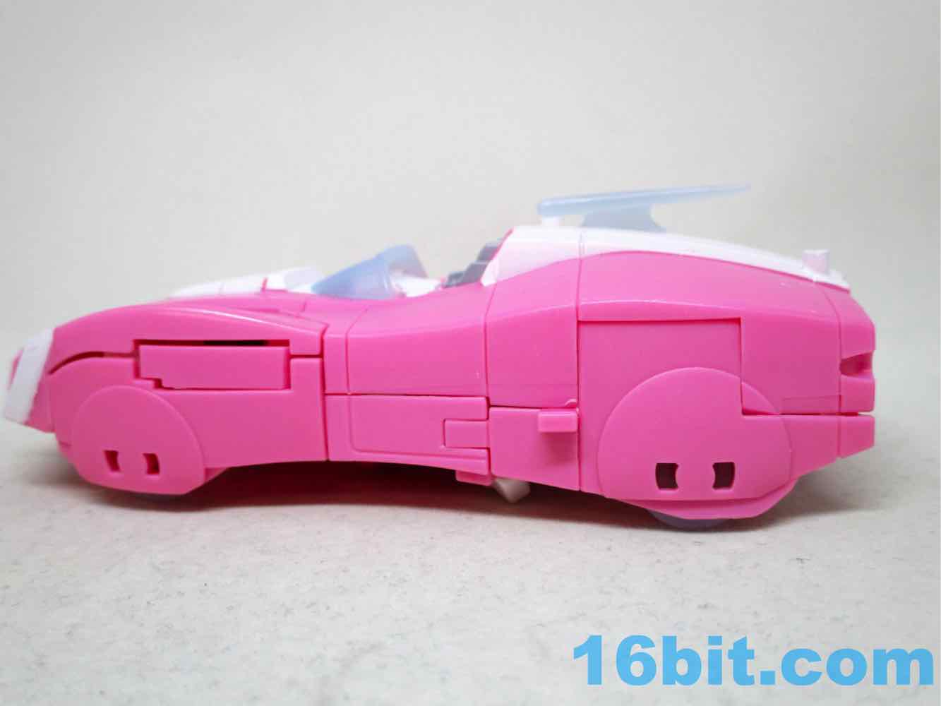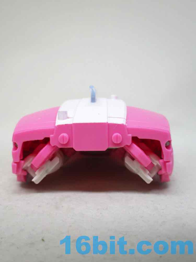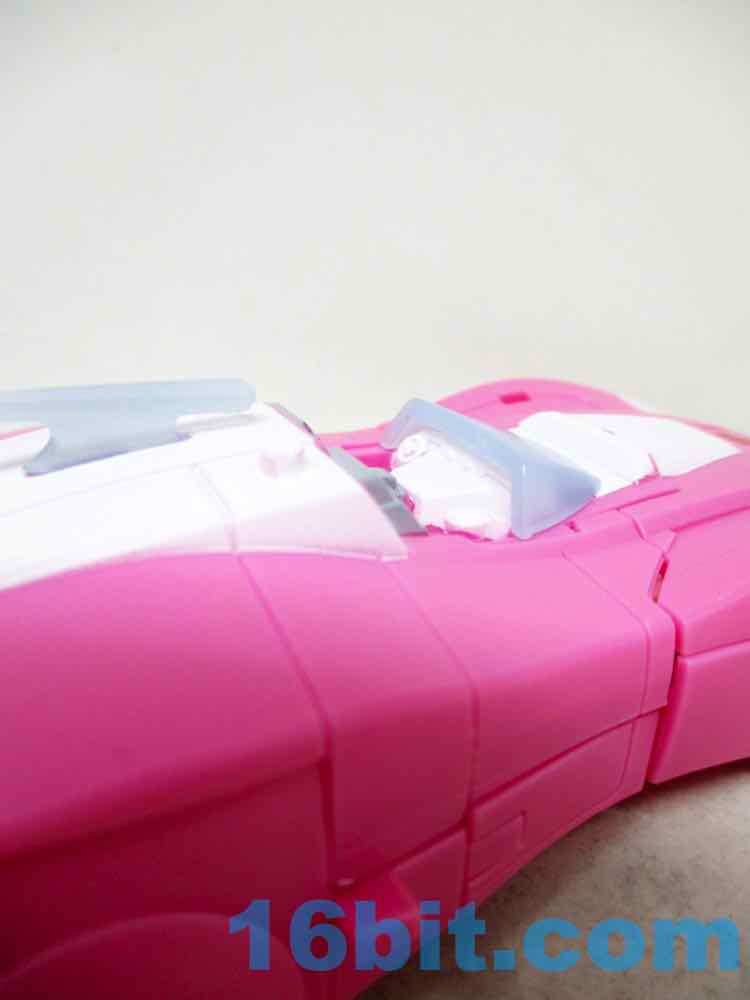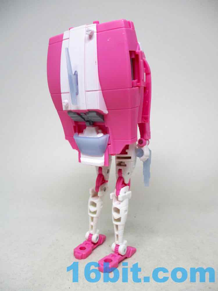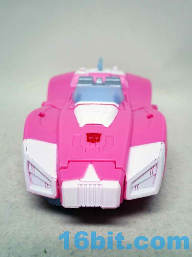 Did you ever see that movie Crazy People? "They're boxy, but good" Dudley Moore's character wrote of Volvos. Arcee's boxy... but not good. Hasbro's photography took care to not show you the back of the vehicle, which is rather incomplete. There's no backside - it looks like a piece is missing that you should plug in. I bet there will be an aftermarket piece here. The figure is also missing some deco, grey panels on the renders are missing from the final figure.
