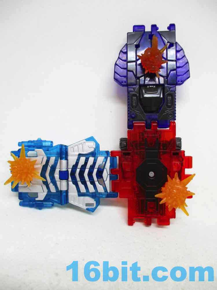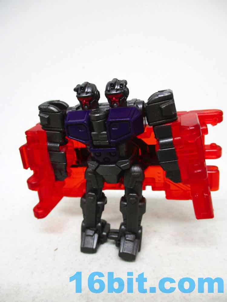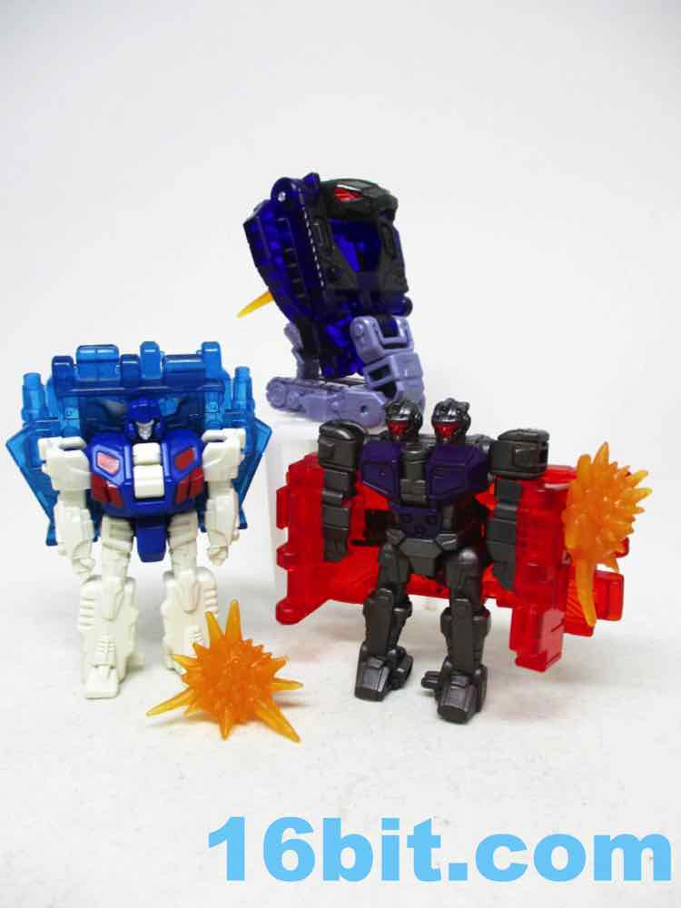 This is a more exciting toy than Soundbarrier, but not by much. They have jointed arms and legs, plus swivel biceps! There remains no faction symbol on the toy, and all he can really do is just stand there. He looks neat, the detail is good, and both heads are nice. I like the purple chest. But is it fun? It's no more fun or less fun than Soundbarrier, but Slitherfang is a more interesting transformation with a more novel snake-bot mode.