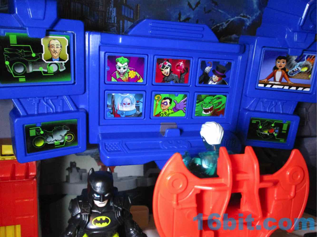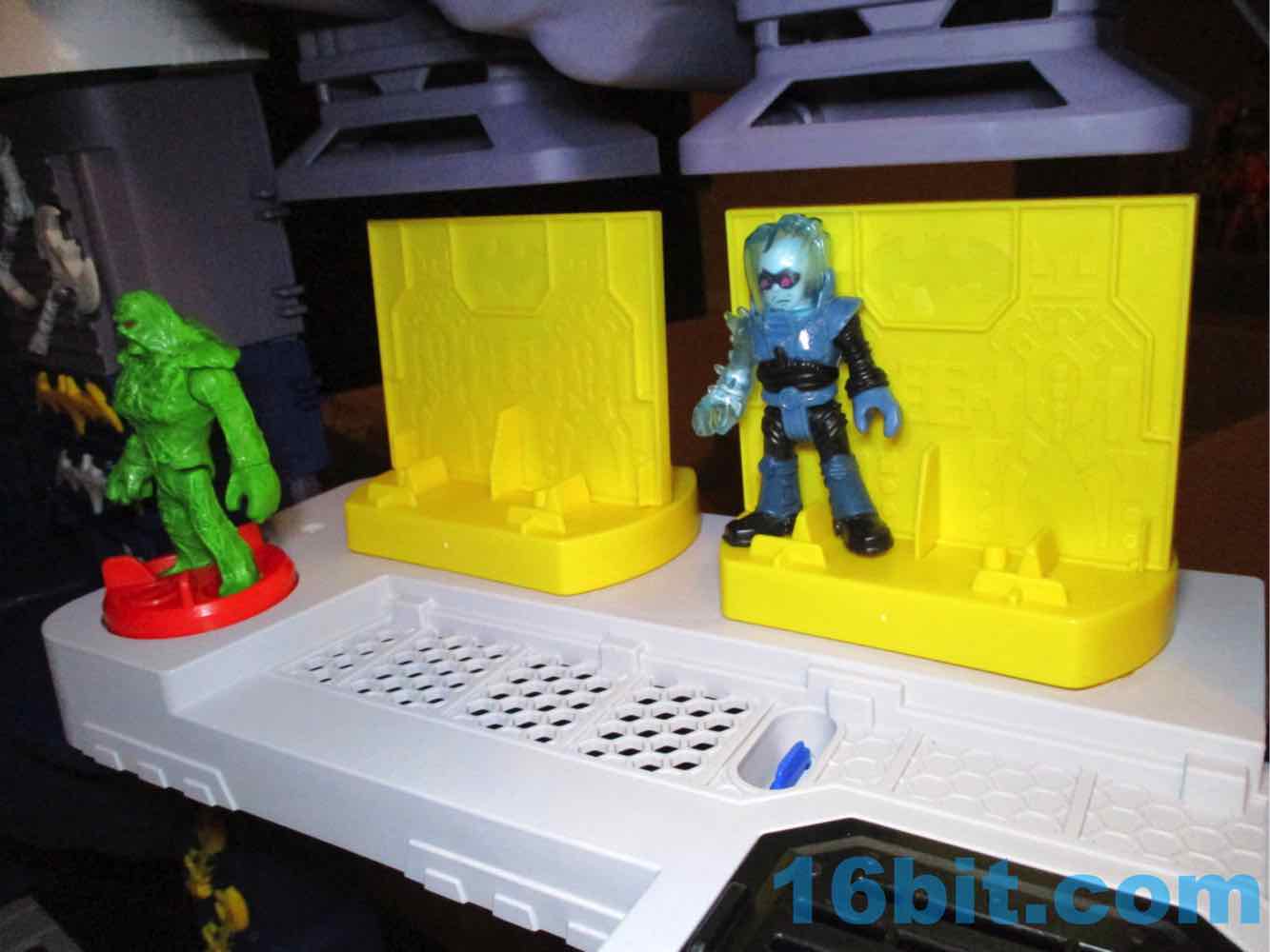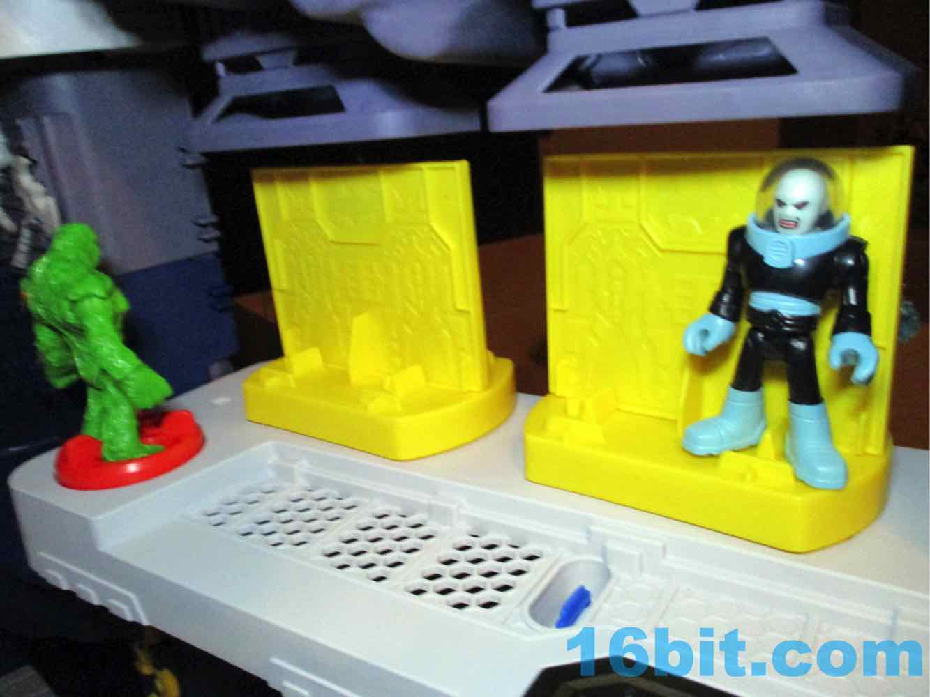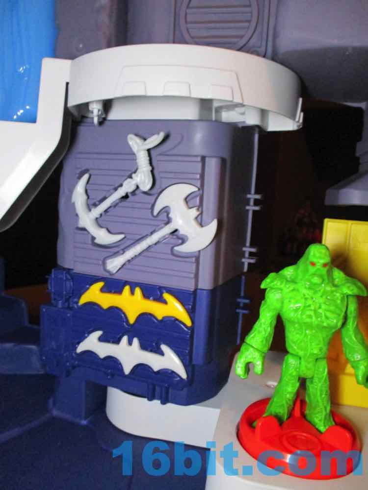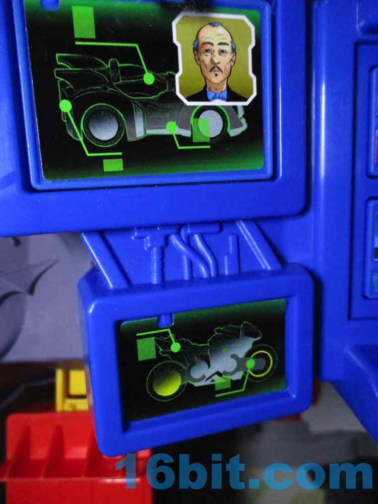 The trap door wrks when you just shove the figure through the floor, dropping them into the cell below. It works well. The chair at the Bat-Computer swivels. There's an elevator you can push up and down, but the figures sometimes fall off - the grip of the figure's foot hole against the foot peg isn't perfect. The same is true from the yellow hall of costumes, you can put your many surplus Batmen figures on there and swivel them around - but sometimes they eject off mid-spin. It's good, but not perfect. There's also a rotating blue arm near the bottom where the Bat-Cycle (not included) should go, but I have no idea what it's supposed to do. A helipad up top is just a handy flat surface.