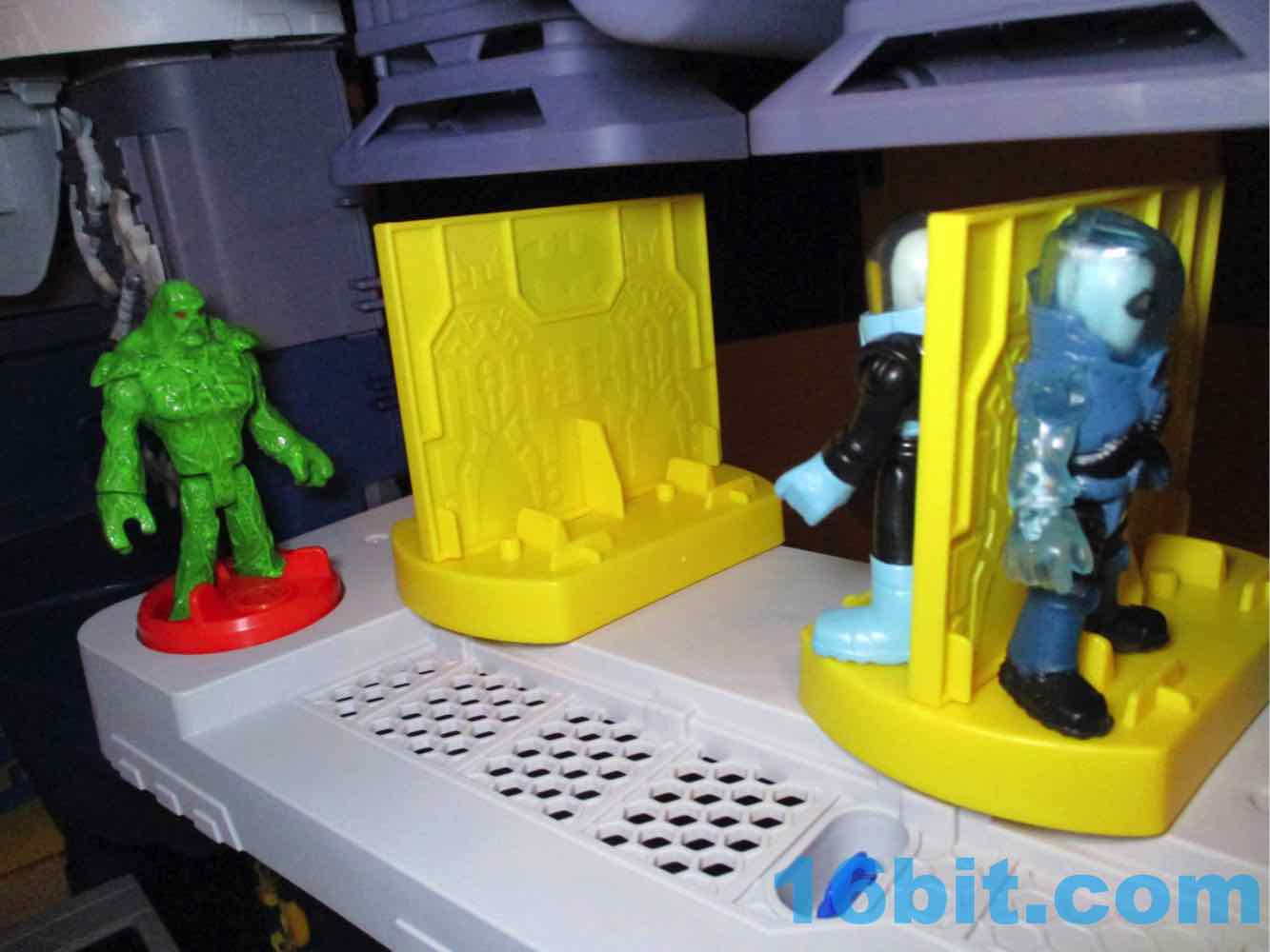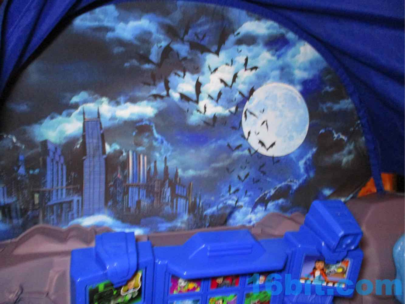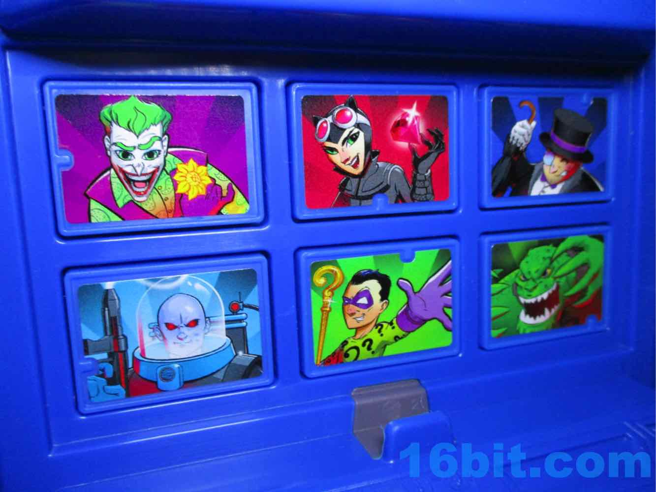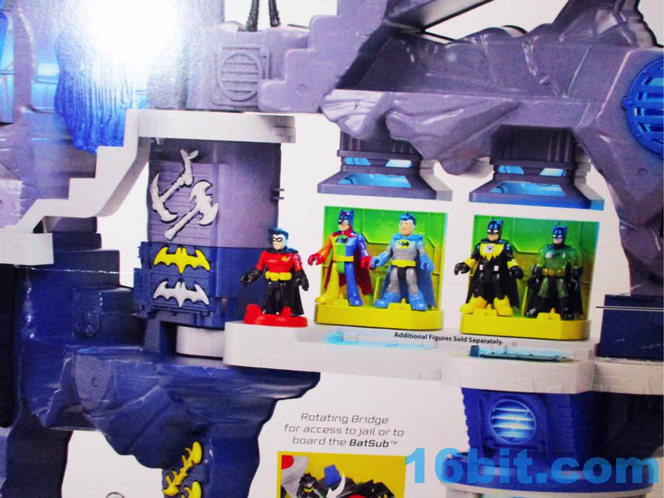 The trap door wrks when you just shove the figure through the floor, dropping them into the cell below. It works well. The chair at the Bat-Computer swivels. There's an elevator you can push up and down, but the figures sometimes fall off - the grip of the figure's foot hole against the foot peg isn't perfect. The same is true from the yellow hall of costumes, you can put your many surplus Batmen figures on there and swivel them around - but sometimes they eject off mid-spin. It's good, but not perfect. There's also a rotating blue arm near the bottom where the Bat-Cycle (not included) should go, but I have no idea what it's supposed to do. A helipad up top is just a handy flat surface.