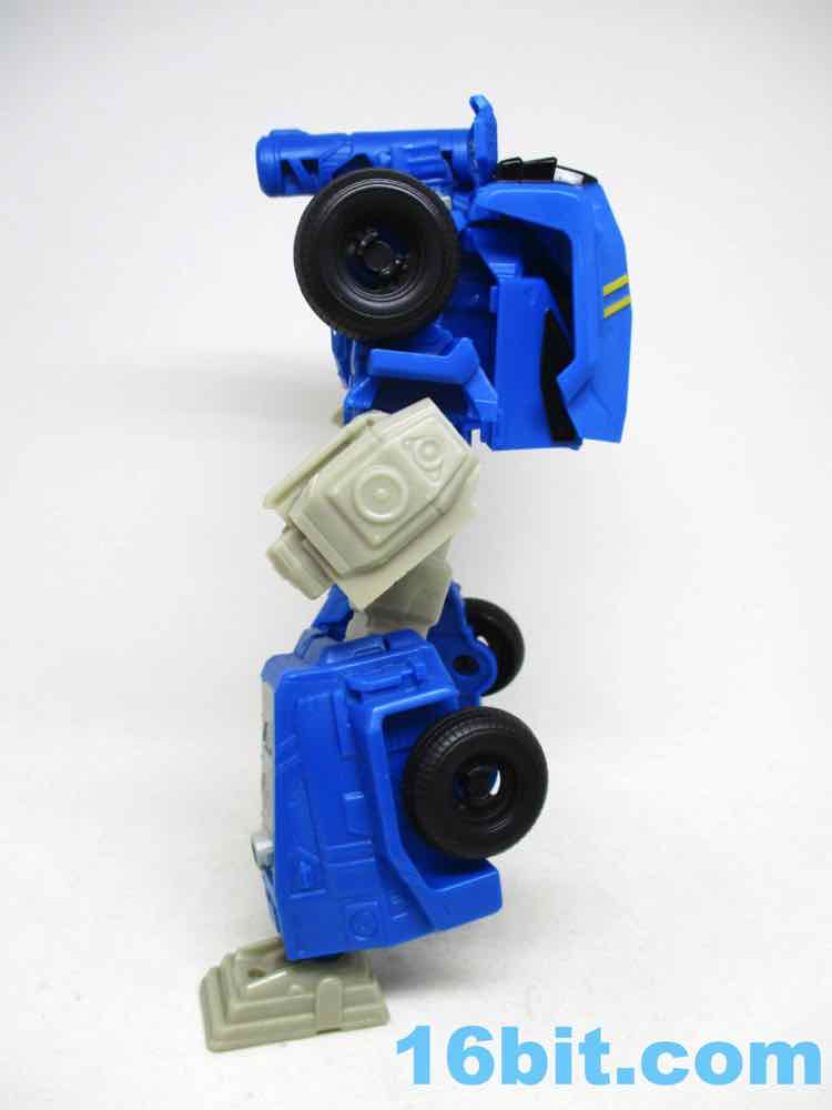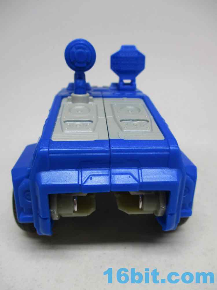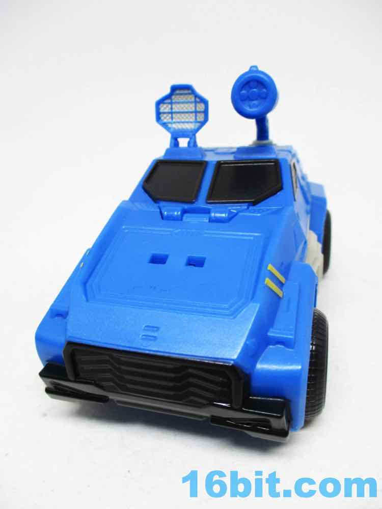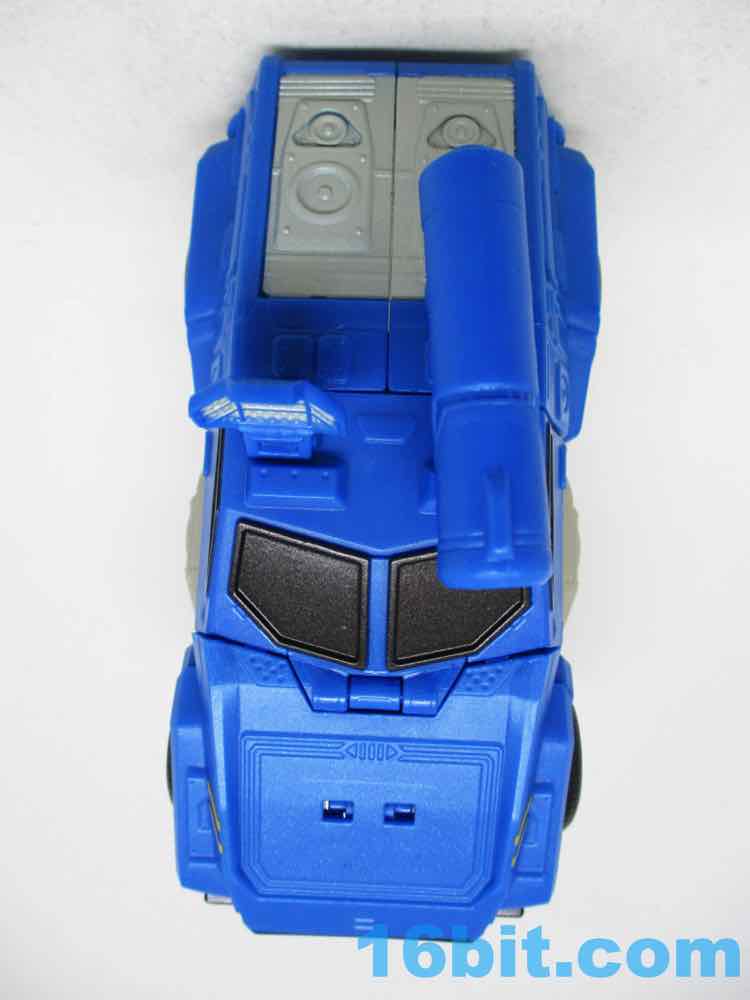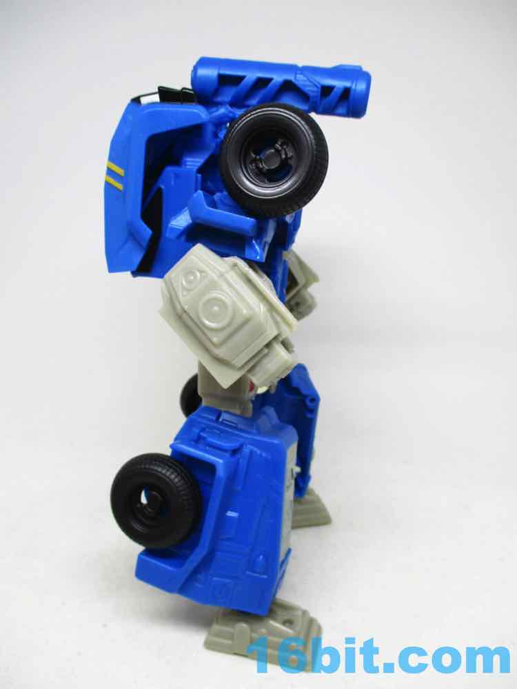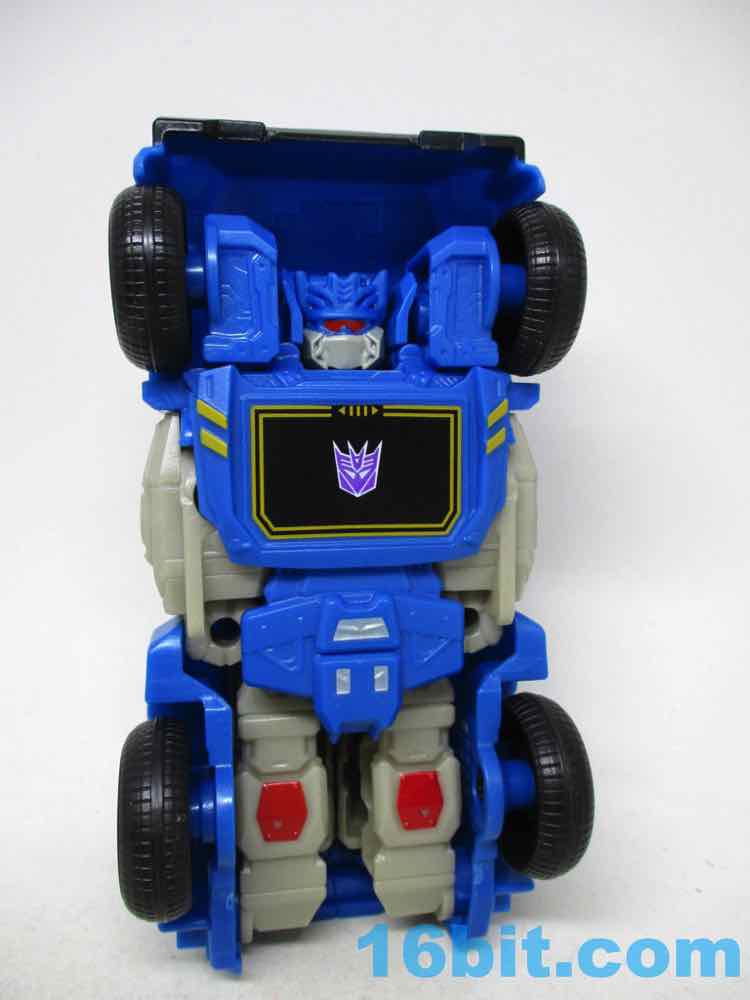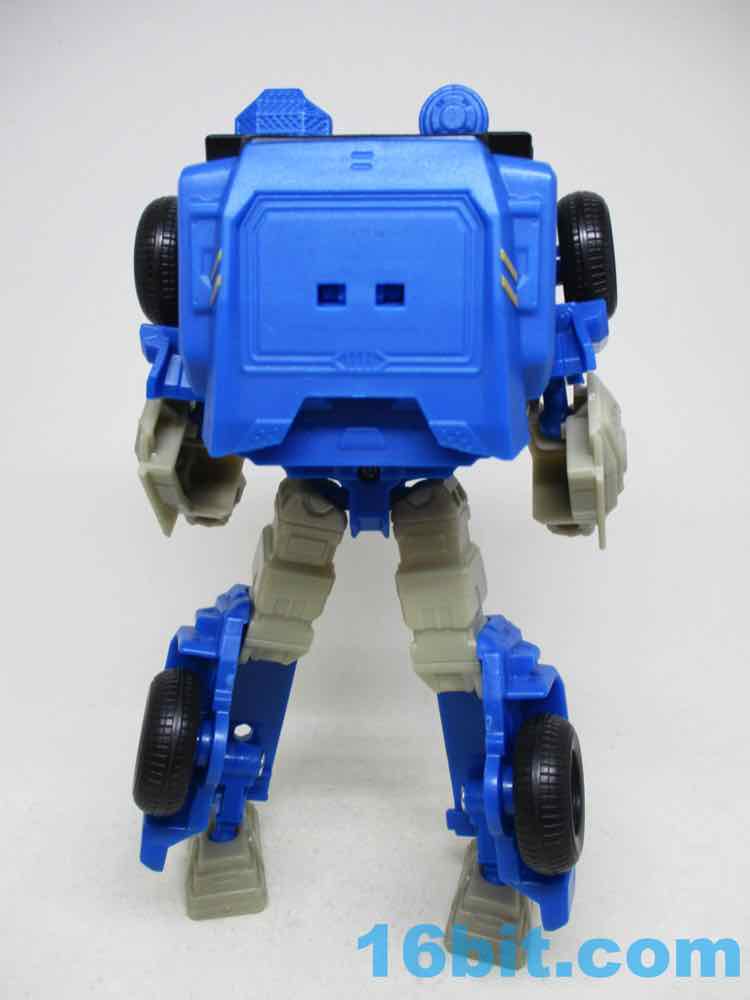 The Soundwave vehicle reminds me a lot of Robots in Disguise Steeljaw, with a long front end, a lot of blue, and pretty big wheels. Transforming him is super easy, too - the arms fold in, the hood folds over, and the feet tuck in the shins which engulf the thighs. It takes seconds - a bit more complex than a one-step toy, but bigger and only a tiny bit slower to change. I wish they'd make other toys this easy to change from one mode to the other.