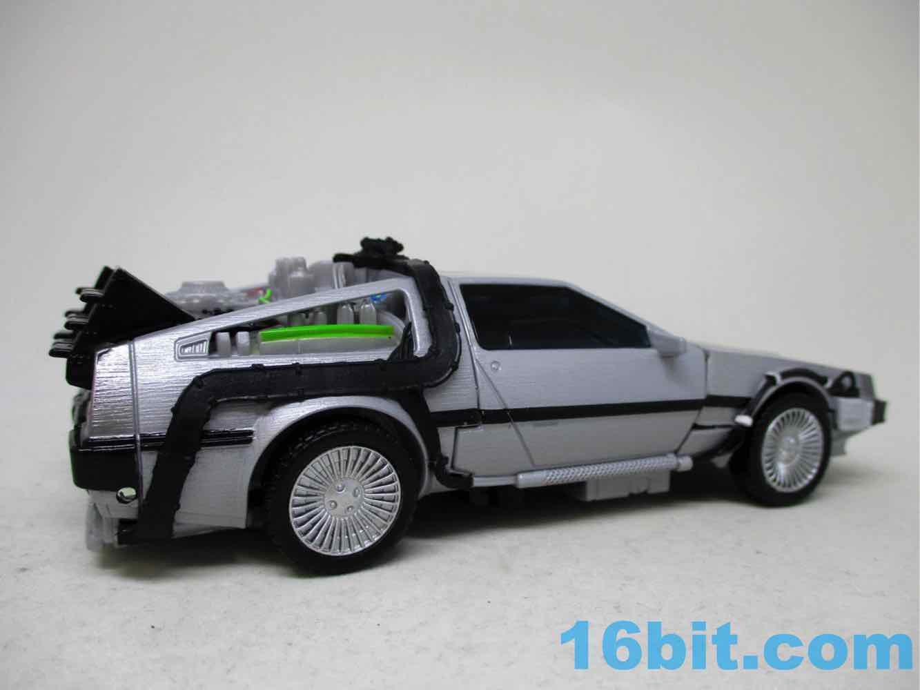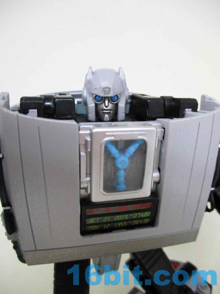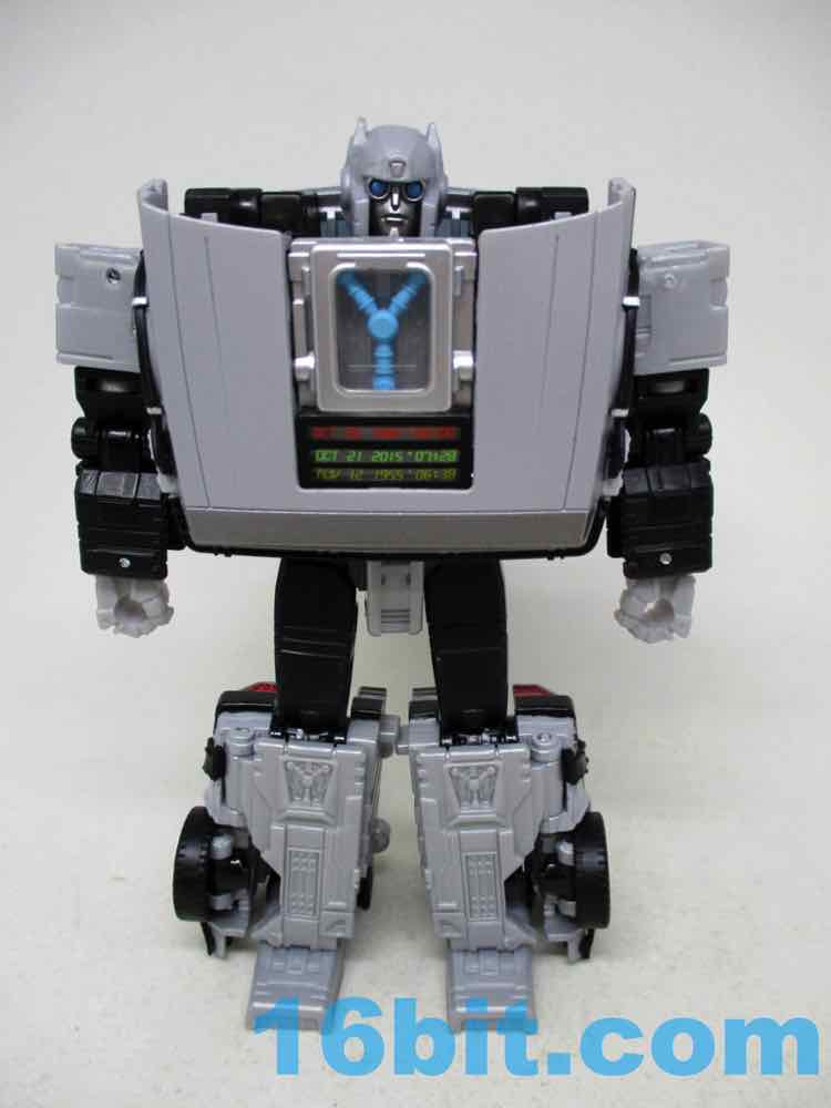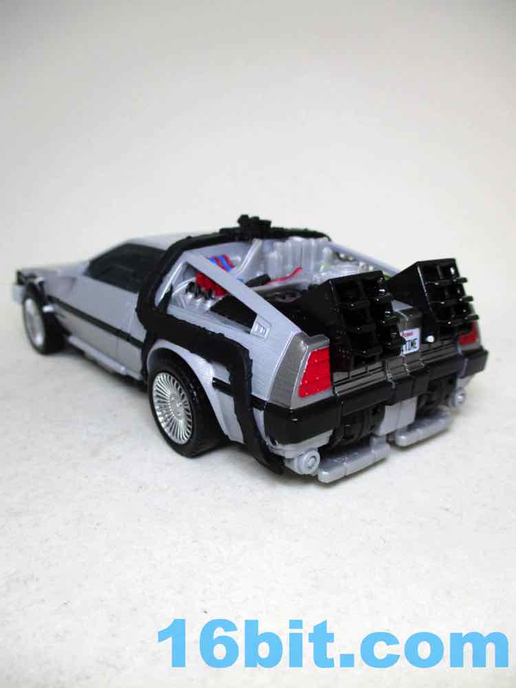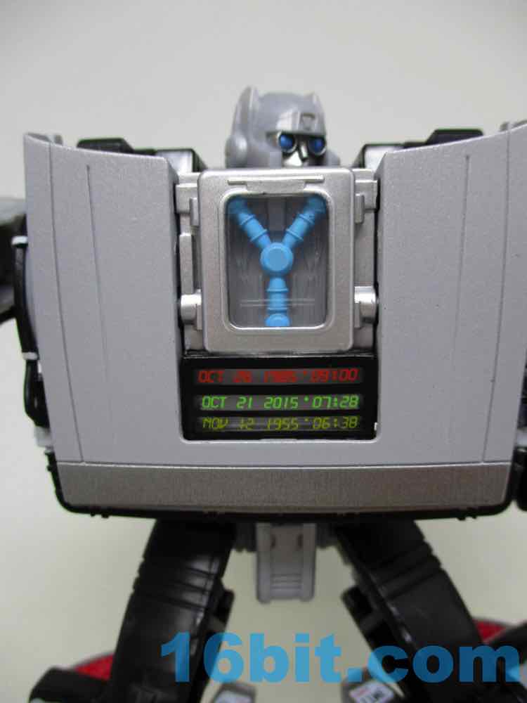 The transformation is similar to Sideswipe, but with some more locking elements and of course the wing doors. After you're removed Mr. Fusion, the undercarriage blaster, and the cable, you can pop open the doors and most things work like Sideswipe. Added steps include some locks on the arm pieces, and a flipping panel on the car's hood which showcase the gratuitous circuits of time and an LED readout. It's a nice touch from a creative perspective, but somewhat silly from a character design. It's very Flavor Flav "do you know what time it is?" like a big clock, except it's three big clocks.