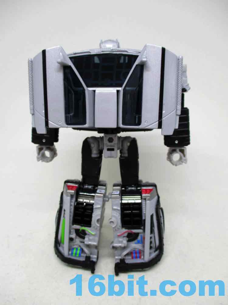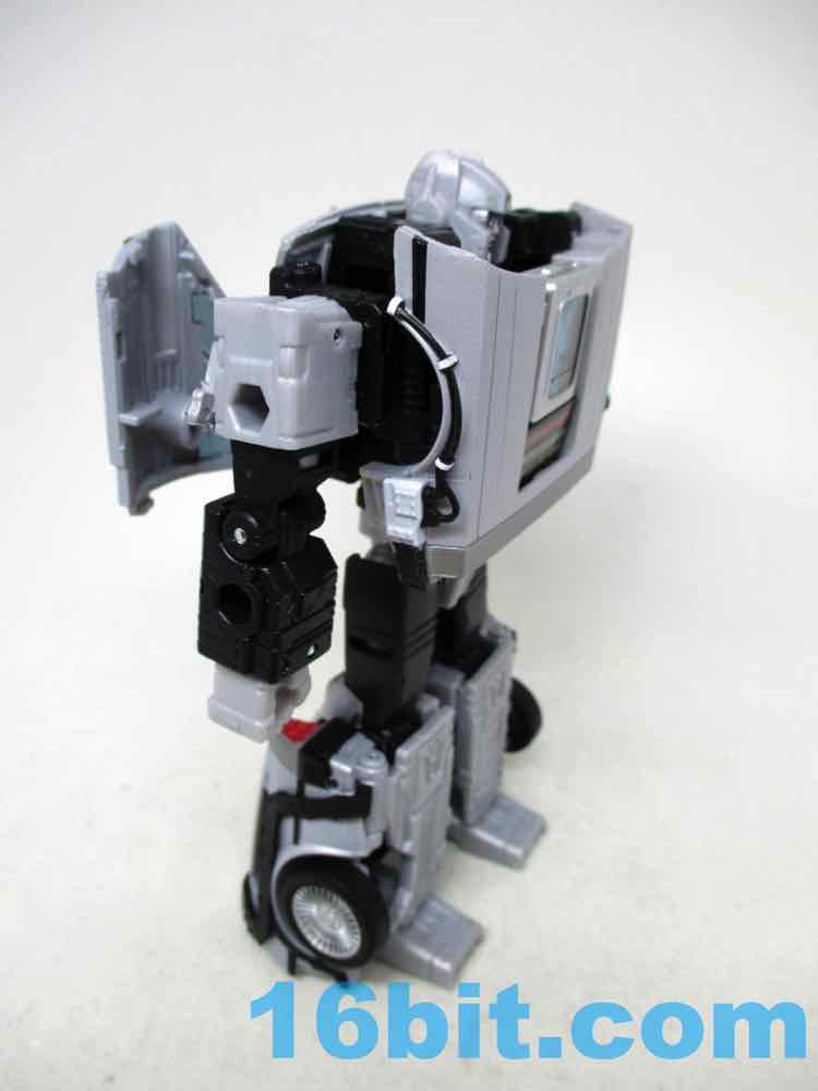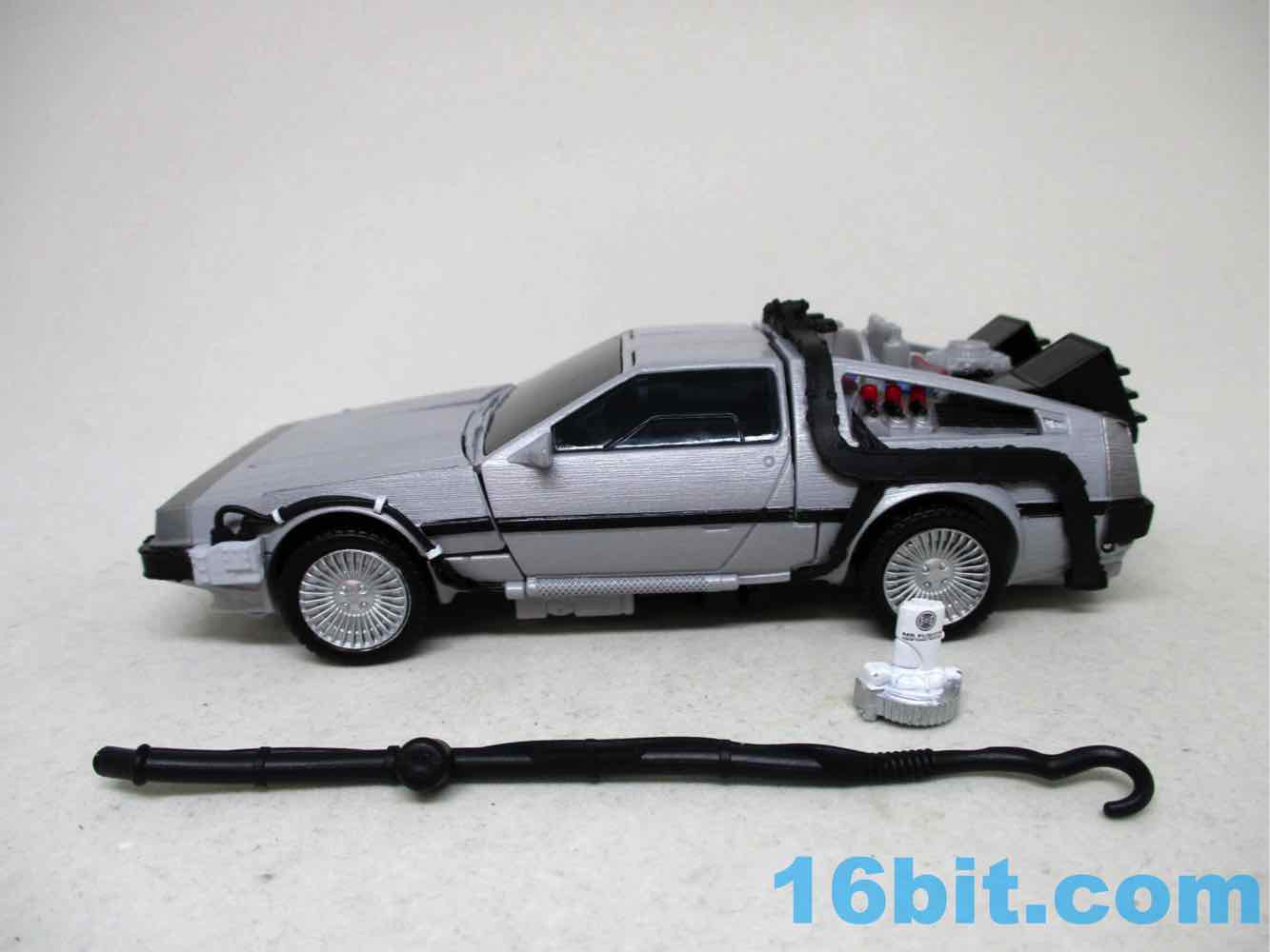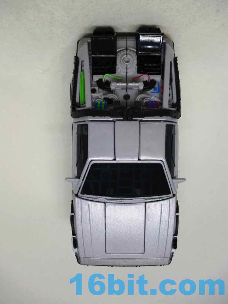 The transformation is similar to Sideswipe, but with some more locking elements and of course the wing doors. After you're removed Mr. Fusion, the undercarriage blaster, and the cable, you can pop open the doors and most things work like Sideswipe. Added steps include some locks on the arm pieces, and a flipping panel on the car's hood which showcase the gratuitous circuits of time and an LED readout. It's a nice touch from a creative perspective, but somewhat silly from a character design. It's very Flavor Flav "do you know what time it is?" like a big clock, except it's three big clocks.