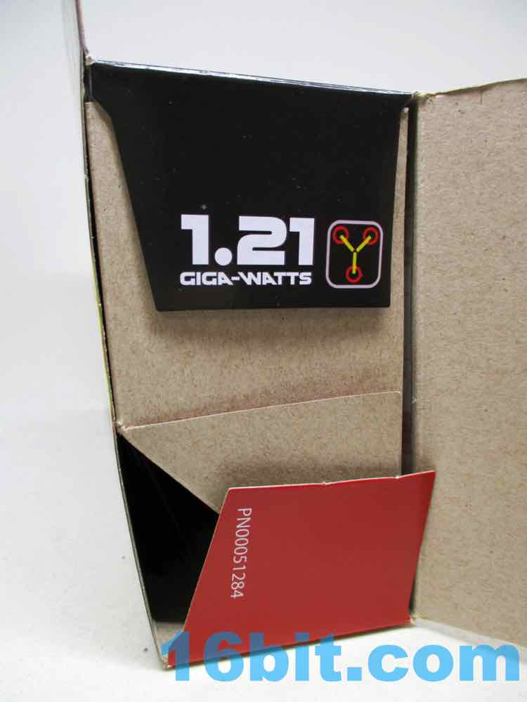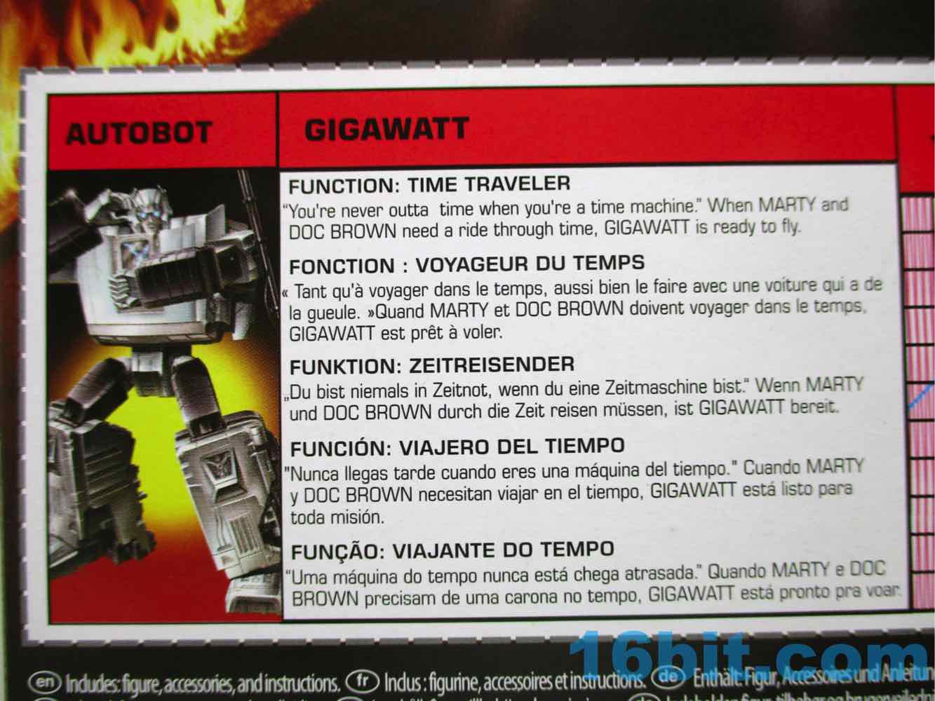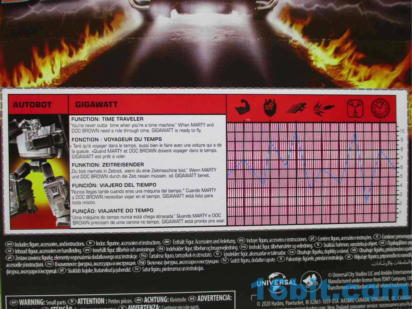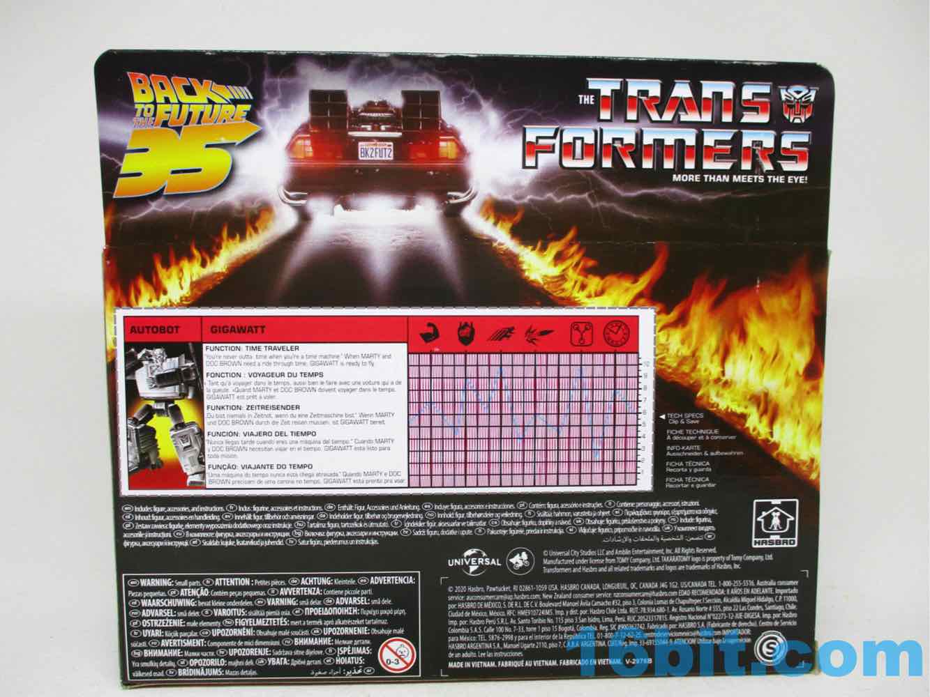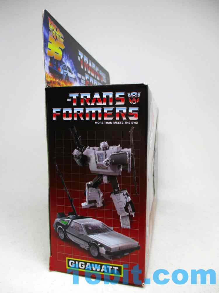 The Gigawatt vehicle mode is packaged in a marvelous G1-style box. If this toy were made in 1985, this is close to how the box would look - but probably would be entirely in English. You've got the flap on the box, you've got classic Hasbro and Transformers logos, and you've even got the classic grid pattern. What you don't get is the old-style insert - instead you have a very modern clear plastic tray with sock ties holding it in place, plus an all-new backdrop with vaguely blueprinty illustrations of Doc Brown's most famous invention.