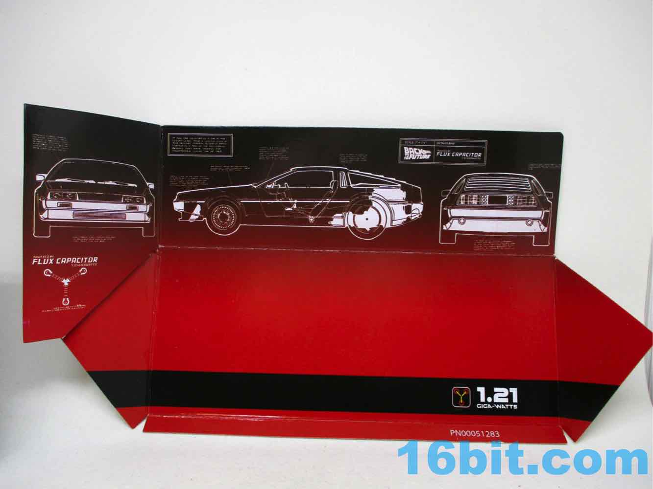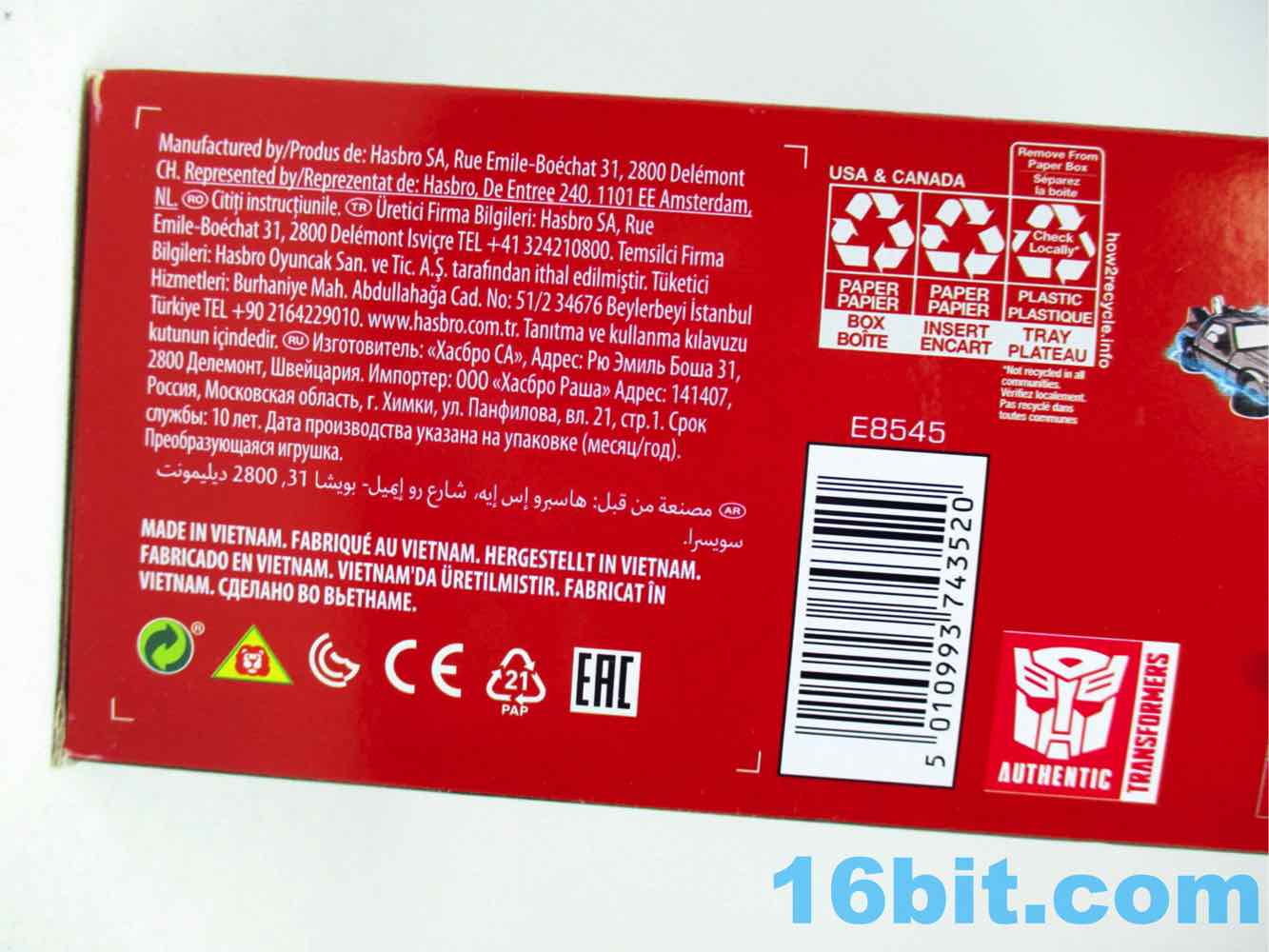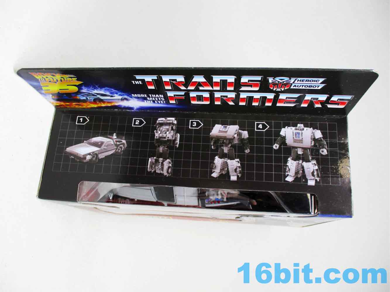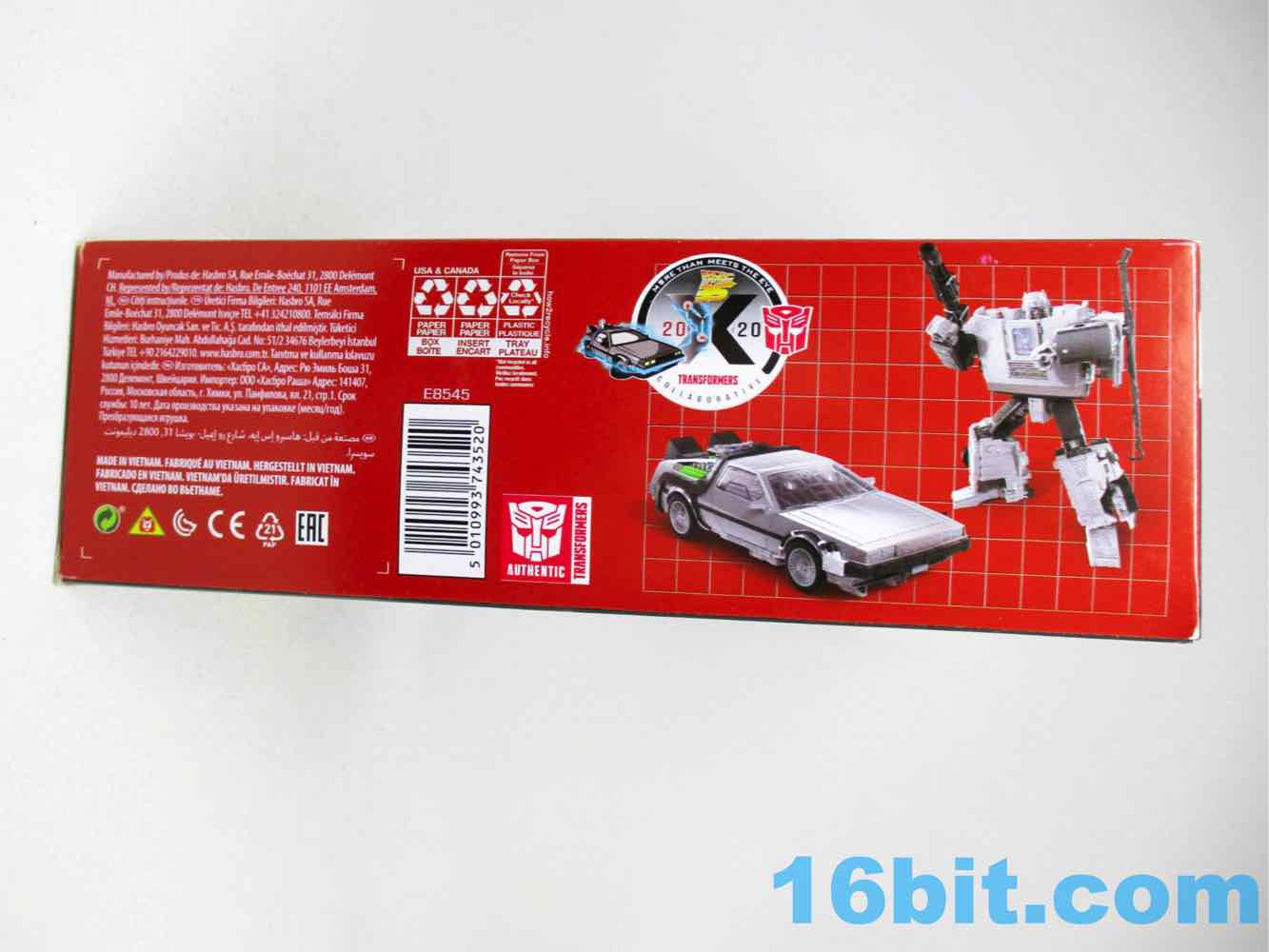 The Gigawatt vehicle mode is packaged in a marvelous G1-style box. If this toy were made in 1985, this is close to how the box would look - but probably would be entirely in English. You've got the flap on the box, you've got classic Hasbro and Transformers logos, and you've even got the classic grid pattern. What you don't get is the old-style insert - instead you have a very modern clear plastic tray with sock ties holding it in place, plus an all-new backdrop with vaguely blueprinty illustrations of Doc Brown's most famous invention.