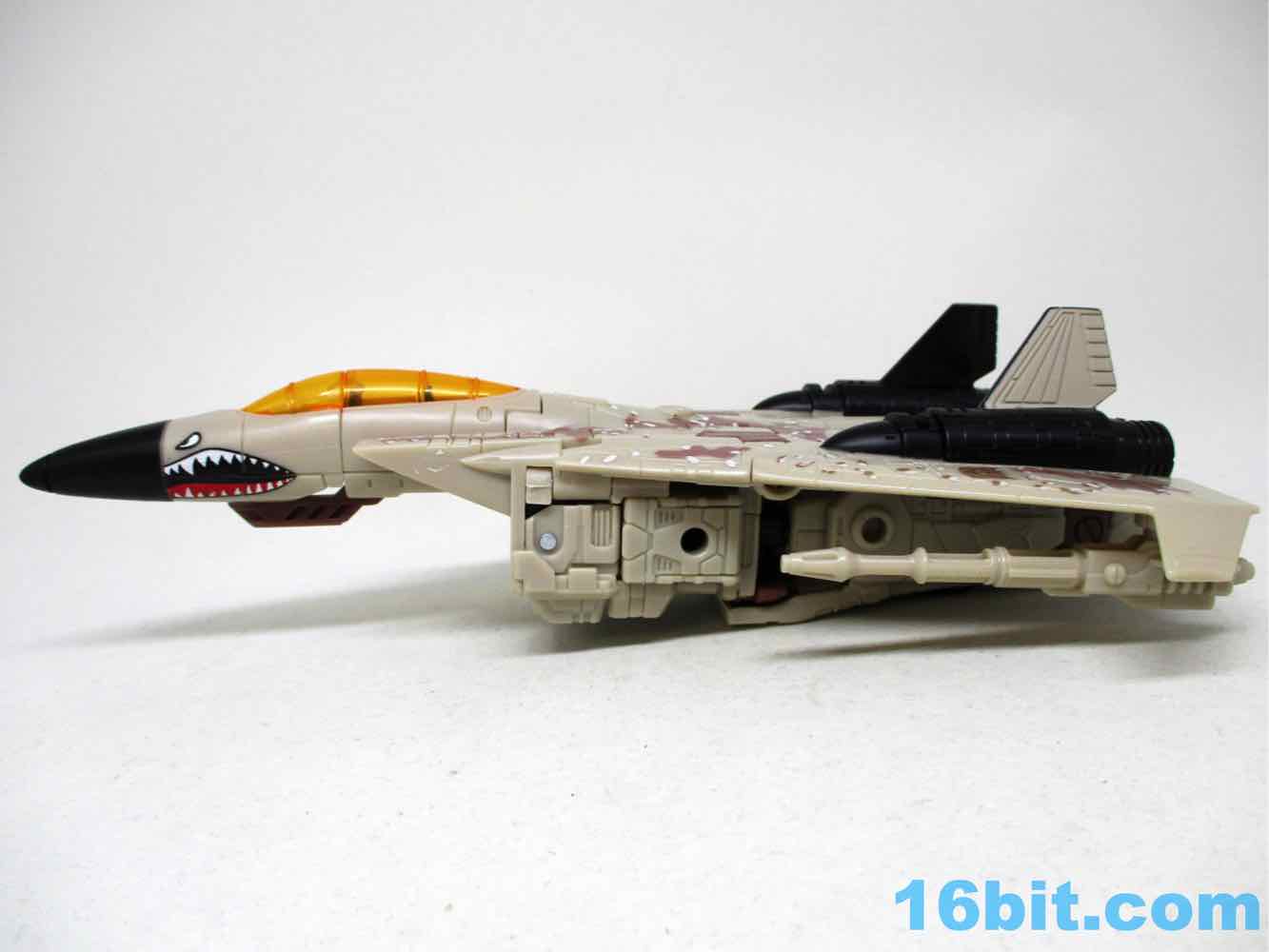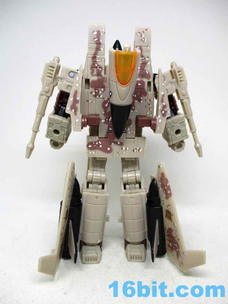 The robot has 10-gallon shoulder pylons bringing him to a whopping 7-inches tall, which admittedly isn't huge but the last toy I opened before this one was Bumblebee. You can really feel the difference here. Thanks to his desert camo, the Generation 2-era tribute bucks the trend of most others we've received in how it doesn't set your retinas on fire. It's tan, with some black and brown. His face is dark grey, and the toy is devoid of the late-G2 hallmarks like writing his name on his body, or the revised Decepticon symbols. The redeco delighted me a lot more than Dirge, mostly because of how the color layout works. While the other coneheads are slathered in paint, this one mostly uses the plastic color to its advantage. This is good - there's less chance of paint chipping, and nothing looks off. I like the pattern on the knees, the black chest intakes look great, and most important of all it's a new seeker. We don't get these very often.