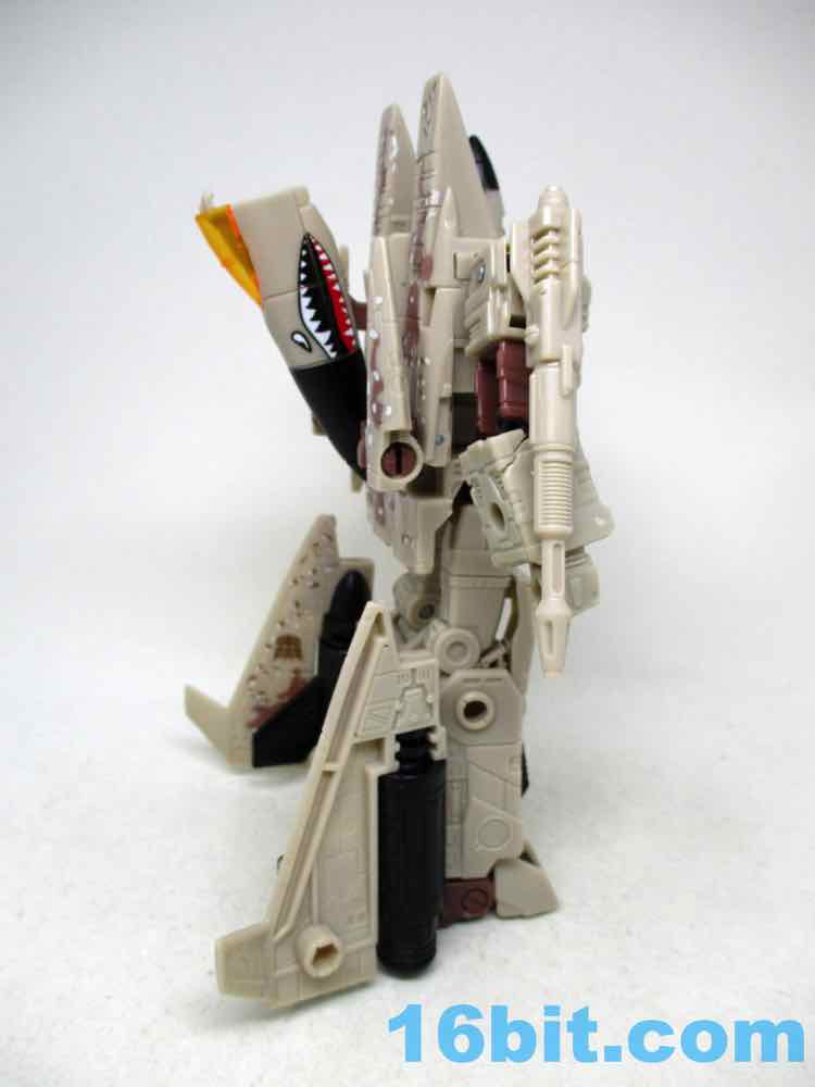 I like the jet, mostly because of the fact that it was one of those "lost toys" that come up in conversation with men my age who are me. The original one wasn't very garish and neither is this - you get the nosecone art with the shark mouth, a first for this mold. While Hasbro has largely followed a consistent pattern of who gets repaints, they've broke the mold a few times by throwing in new-to-toy characters like this one. It's hard to not appreciate, given the seekers are sort of the Clone Troopers of the Decepticons. The character is something of a blank slate, but the toy is distinctive with colors that may more closely match your desert-themed G.I. Joe toys. I especially like how they integrated dark brown Decepticon symbols on the wings. "Subtle" isn't a word that typically describes Hasbro toy design from the early 1990s, and this one seems like the opposite of the last tribute we got - G2 Megatron.