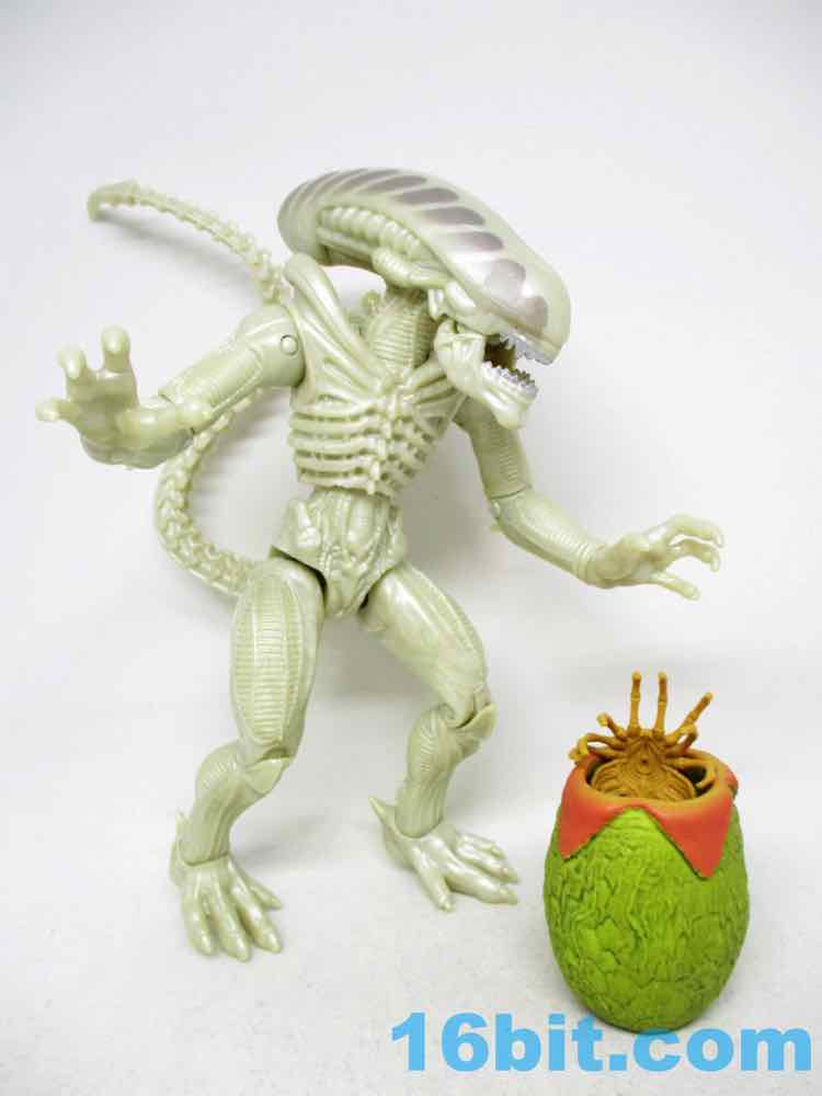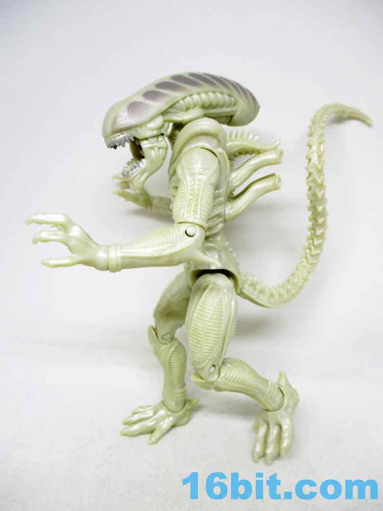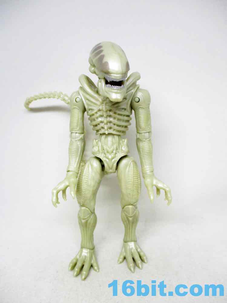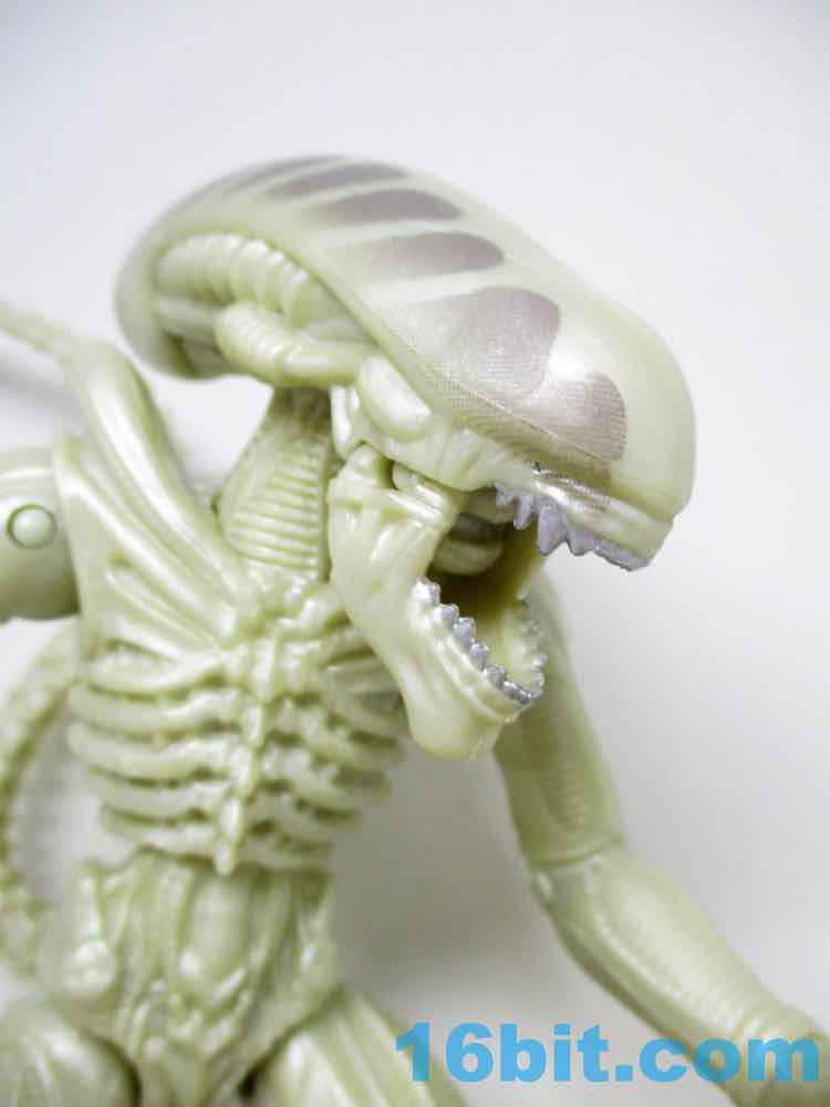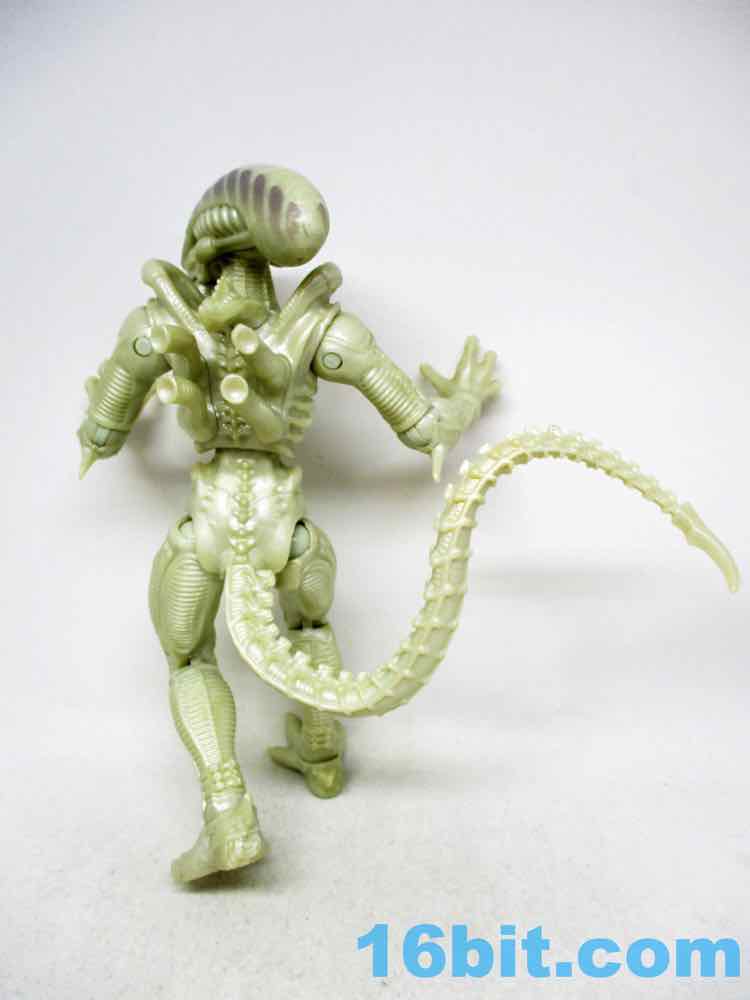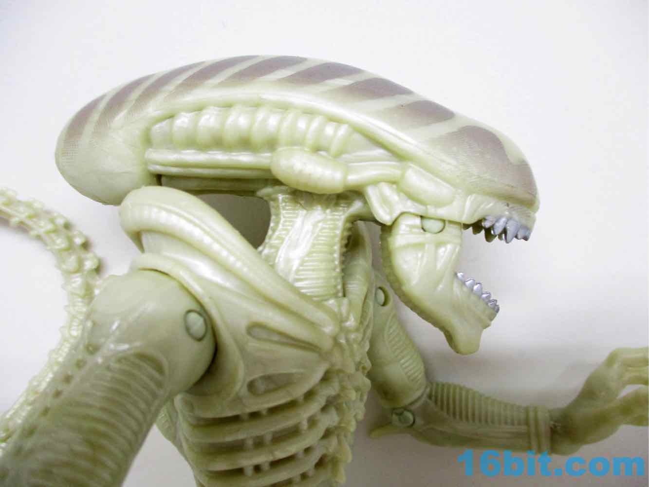 It's hard to not think of the Kenner figures when picking these new guys up. Back in 1993, those things infuriated fans who wanted true-to-movie designs, and fans who just wanted to buy creatures. The colonial marines sat on pegs while the bugs immediately sold at a cheap $5. Nearly 30 years later they seem more like designer toys than movie or kid toys, but sometimes that works - this time around, the black Alien creature is now a pearly menace with silver teeth and dark grey markings along the dome. There's not a lot of deco here, and the design seems like something done by someone who was familiar with the design but didn't have good reference photos. The exoskeletal, biomechanical body trappings are mostly all here. You've got the weird vented legs, the bony chest, the long scorpion-like tail, and even the second set of jaws hidden behind an opening mouth - but not articulated. This ticks off most of the elements of the costume, without getting most of them completely correct.