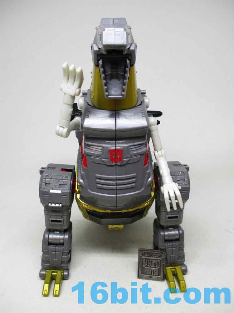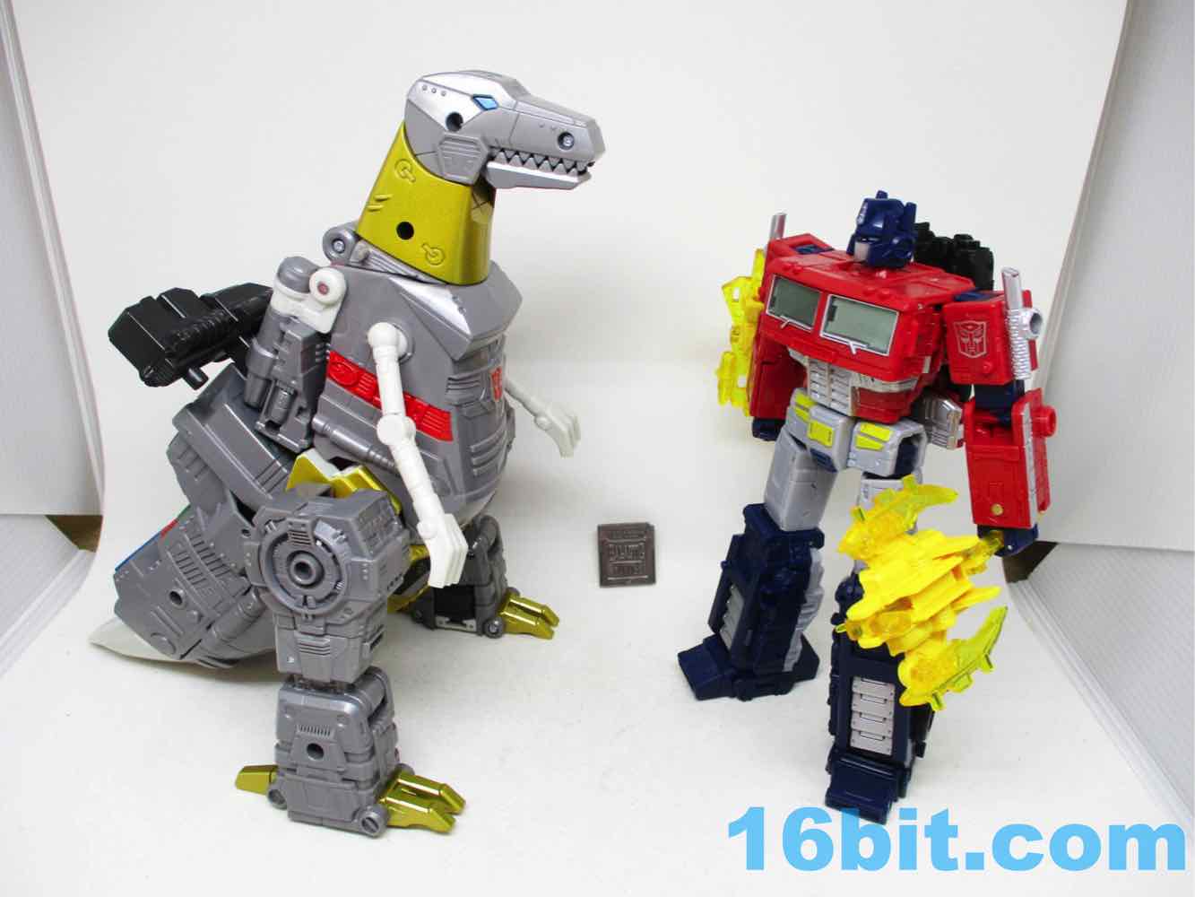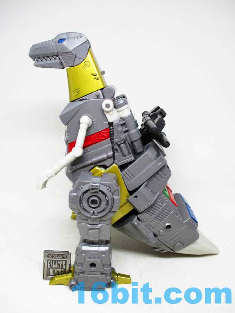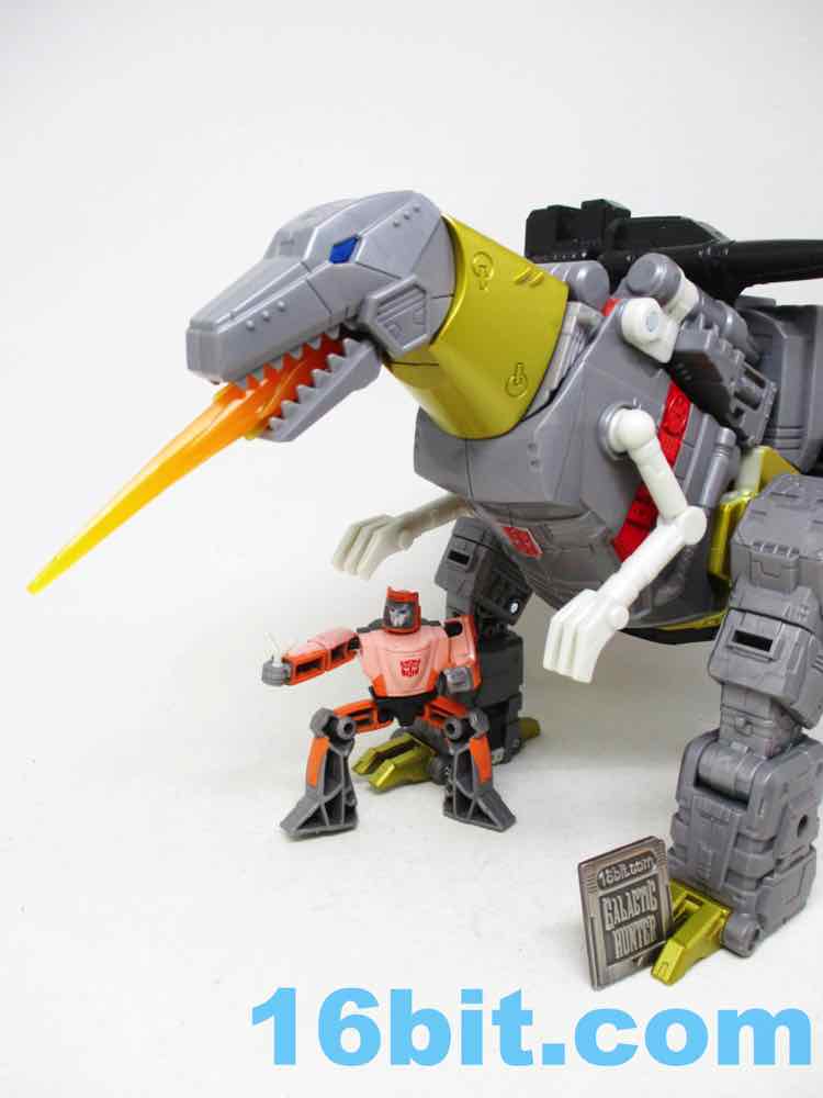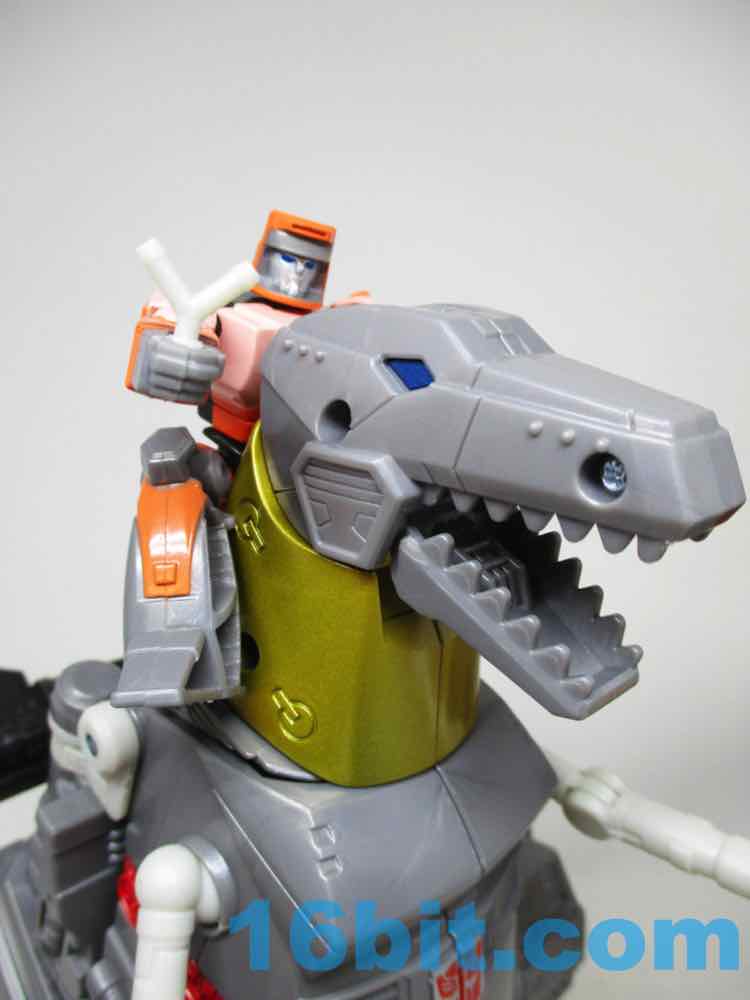 Dinosaur mode is not quite as refined - the dinosaur tail is made up of boots, so it's bulky and kind of not great. There's room for improvement here. I do love his T-Rex head with opening jaw, complete with 3mm port to mount a C.O.M.B.A.T. blast accessory. The tiny arms pop out a little easily, and are articulated at the elbow as well as the shoulder. For some reason the neck is painted rather than toy-ish clear like the prototype, and thanks to the tail-drag design he has no problems standing. Unlike the robot mode, the Autobot chest is visible in this mode and it looks great! From most angles! If he was $50 alone, the value is here. It's big.