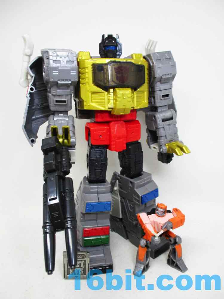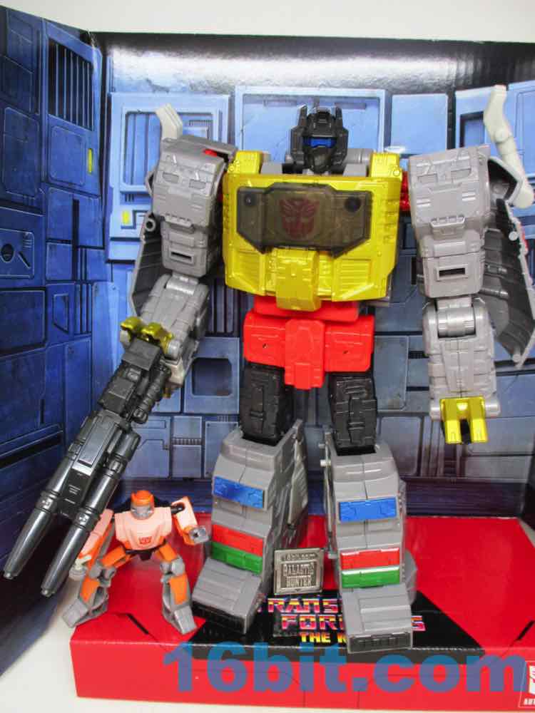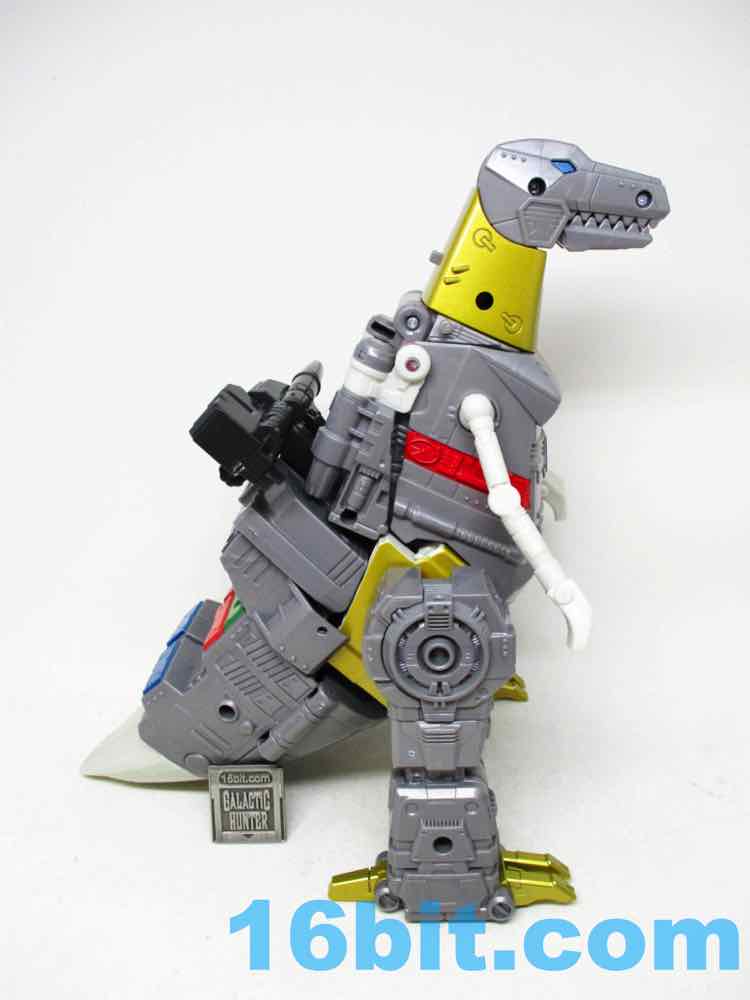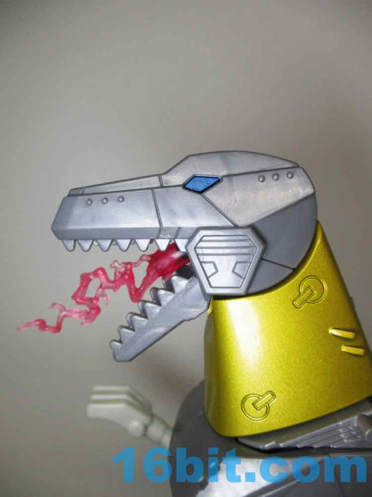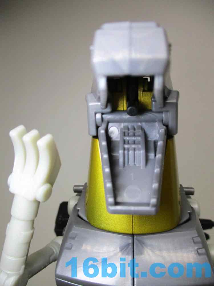 Dinosaur mode is not quite as refined - the dinosaur tail is made up of boots, so it's bulky and kind of not great. There's room for improvement here. I do love his T-Rex head with opening jaw, complete with 3mm port to mount a C.O.M.B.A.T. blast accessory. The tiny arms pop out a little easily, and are articulated at the elbow as well as the shoulder. For some reason the neck is painted rather than toy-ish clear like the prototype, and thanks to the tail-drag design he has no problems standing. Unlike the robot mode, the Autobot chest is visible in this mode and it looks great! From most angles! If he was $50 alone, the value is here. It's big.