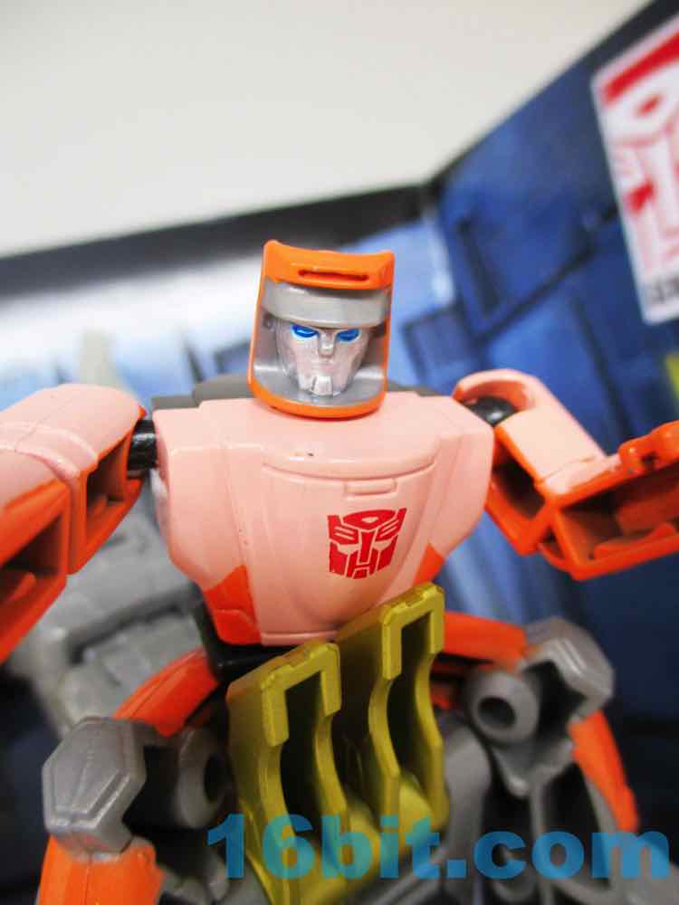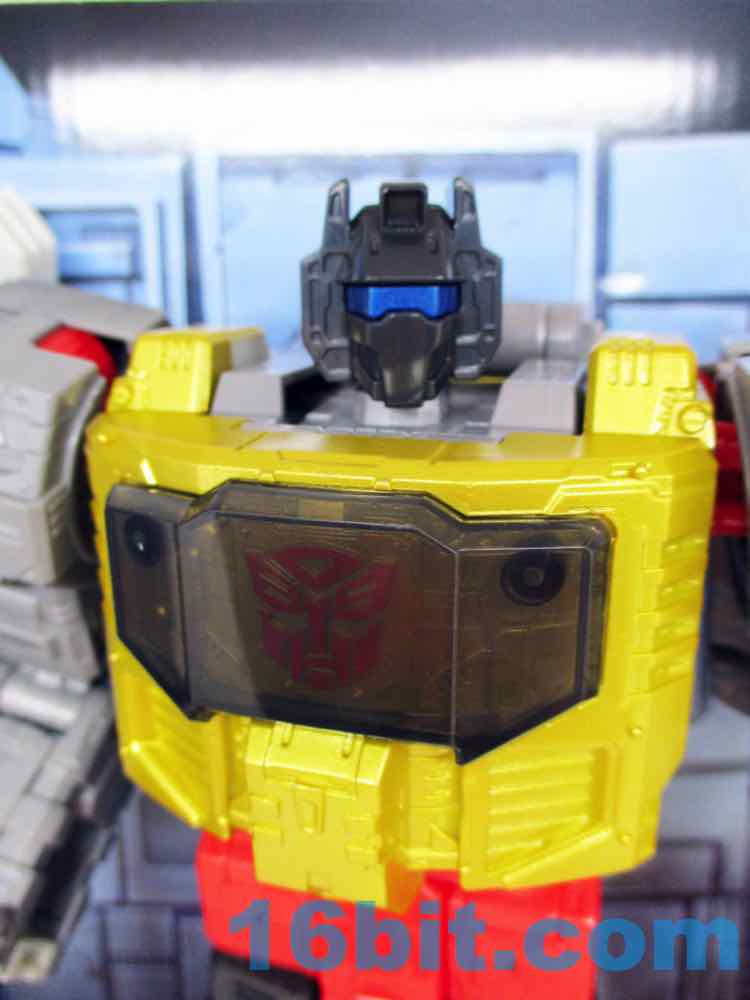 Unlike his Studio siblings, he has 5mm ports all over his arms and legs - this makes me wonder if the design was, at one point, meant for Earthrise or another War for Cybertron line. The silhouette is pretty close to the animation model, and this chunky 8-inch robot has 22 meaningful points of articulation with such niceties as rotating wrists and tilting ankles. You can see painted stripes to resemble the toy's labels, but that opaque window on the chest completely obfuscates the Autobot symbol. It's screwed on so you can replace it if someone makes a good third party kit piece. I have yet to buy a third-party upgrade but this might make me break that streak. There's really no reason for it to not be correct, early test shots had this piece - and seemingly the dino neck - in clear plastic.