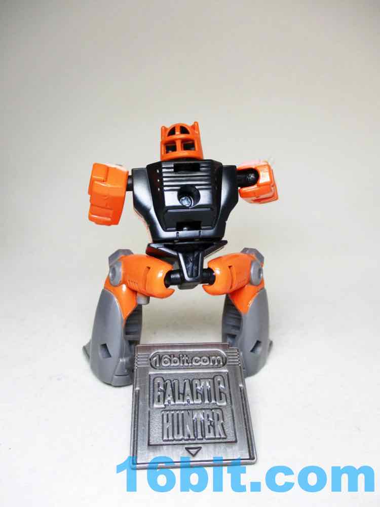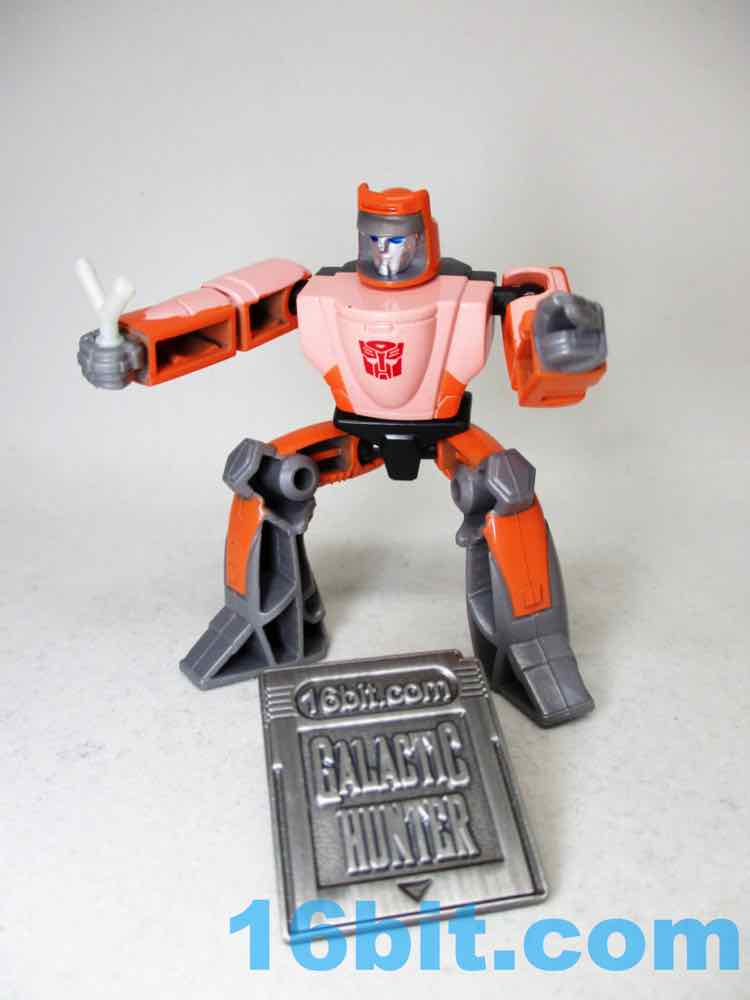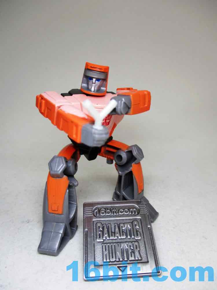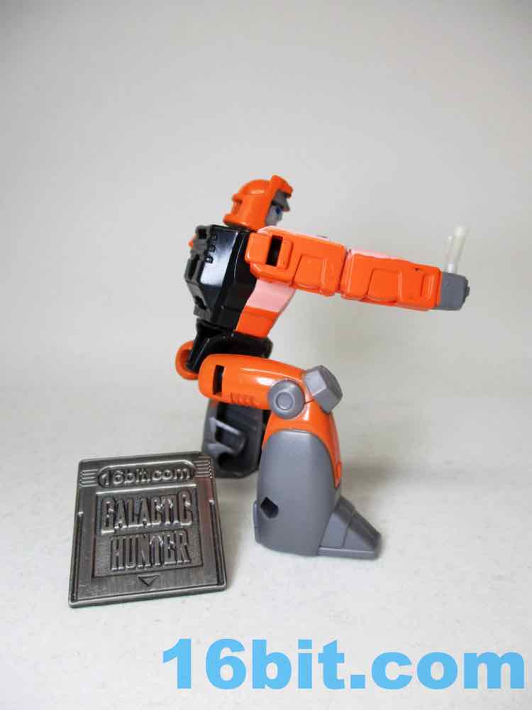 Wheelie is a nicely-painted, 6-jointed figure with a removable tiny slingshot. His knees are permanently bent, otherwise he would be the same basic height as a Core-class toy. With a little work you can get him to balance while standing, but he's designed to sit on Grimlock. There's a peg under his thigh that fits on Grimmy's shoulder, but my sample's peg is too big for the hole - so good luck with that. The deco is good, with orange and a peachy color painted on a grey body with silver on his face and nice blue eyes. I'm not saying it's a replacement for Titans Return Wheelie, but it's certainly a good supplement. As accessories go, he's no slouch and can be posed "dancing" or pulling back on his weapon.