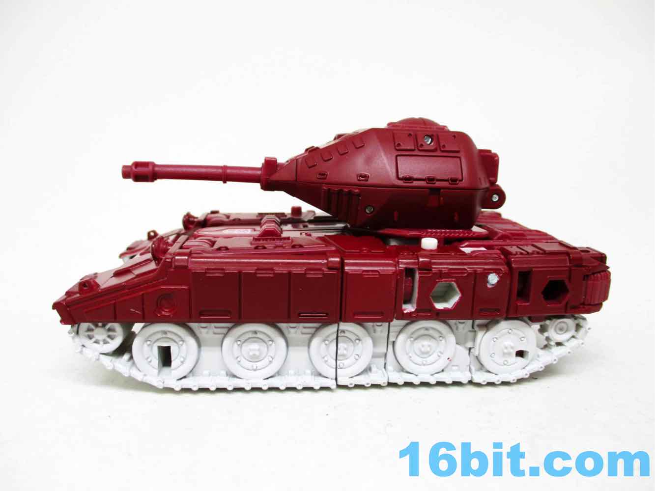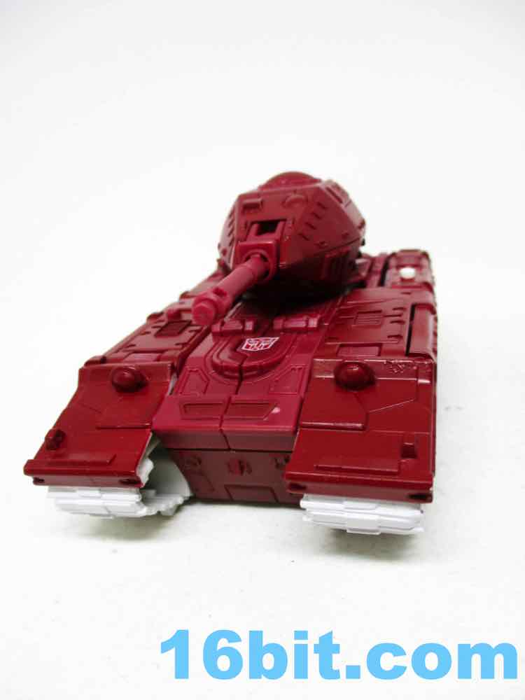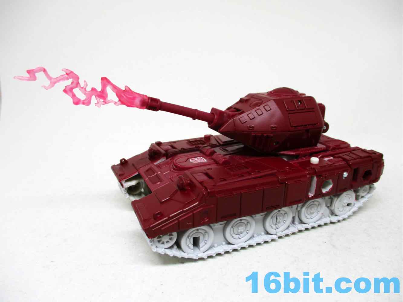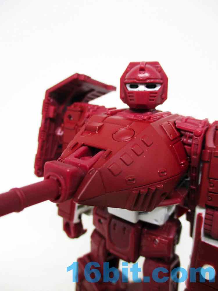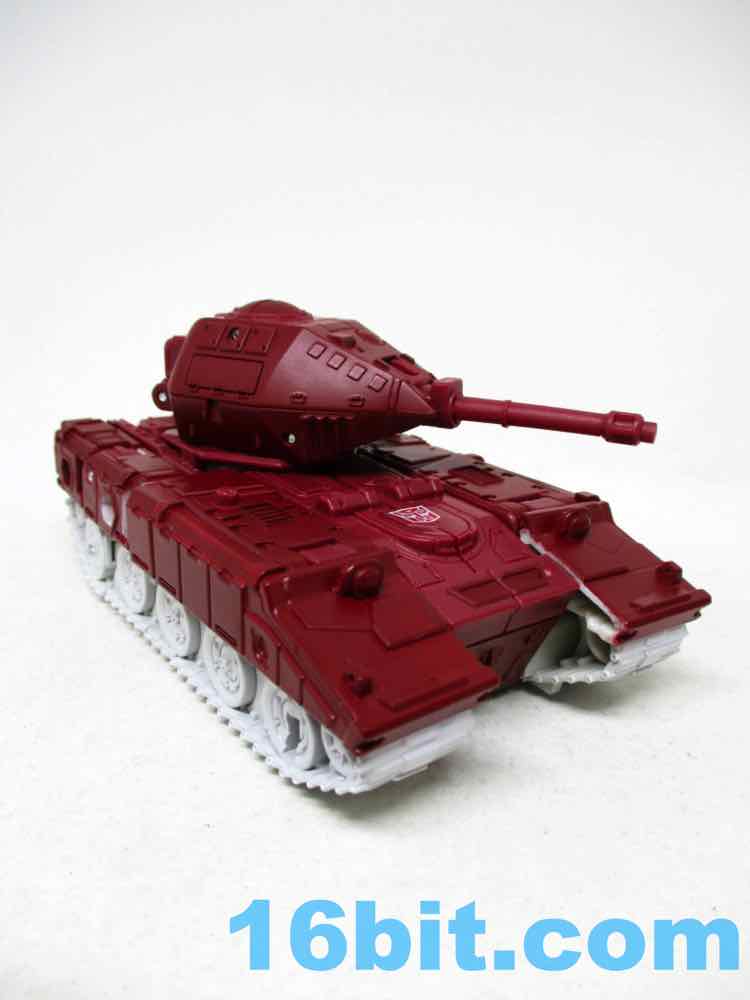 I very much like the tank - it's cute. The turret is round and bulbous, like the original toy and most likely your memory of the original toy. The grey panel behind the turret is now red, and matches the rest of the toy. There are rolling wheels which don't roll terribly well, and at this point could be dropped and most wouldn't miss them. The classic rubsign sticker is gone, replaced by an Autobot symbol. The colors don't precisely match the original toy, but they look good - they're good enough.