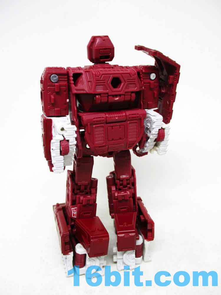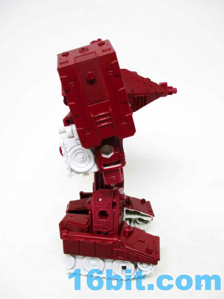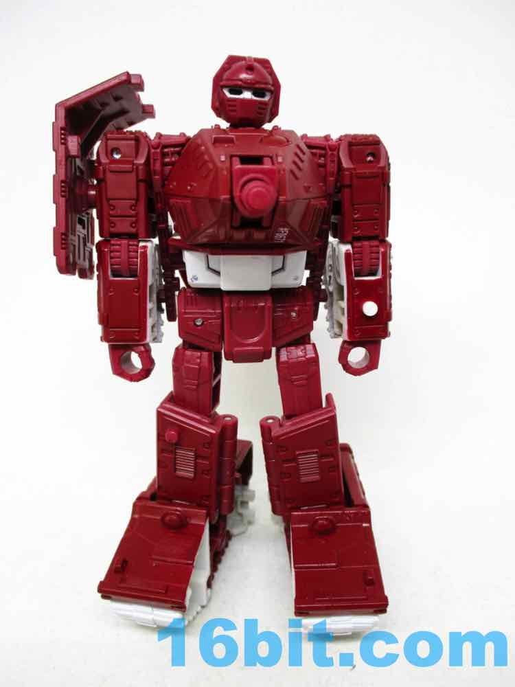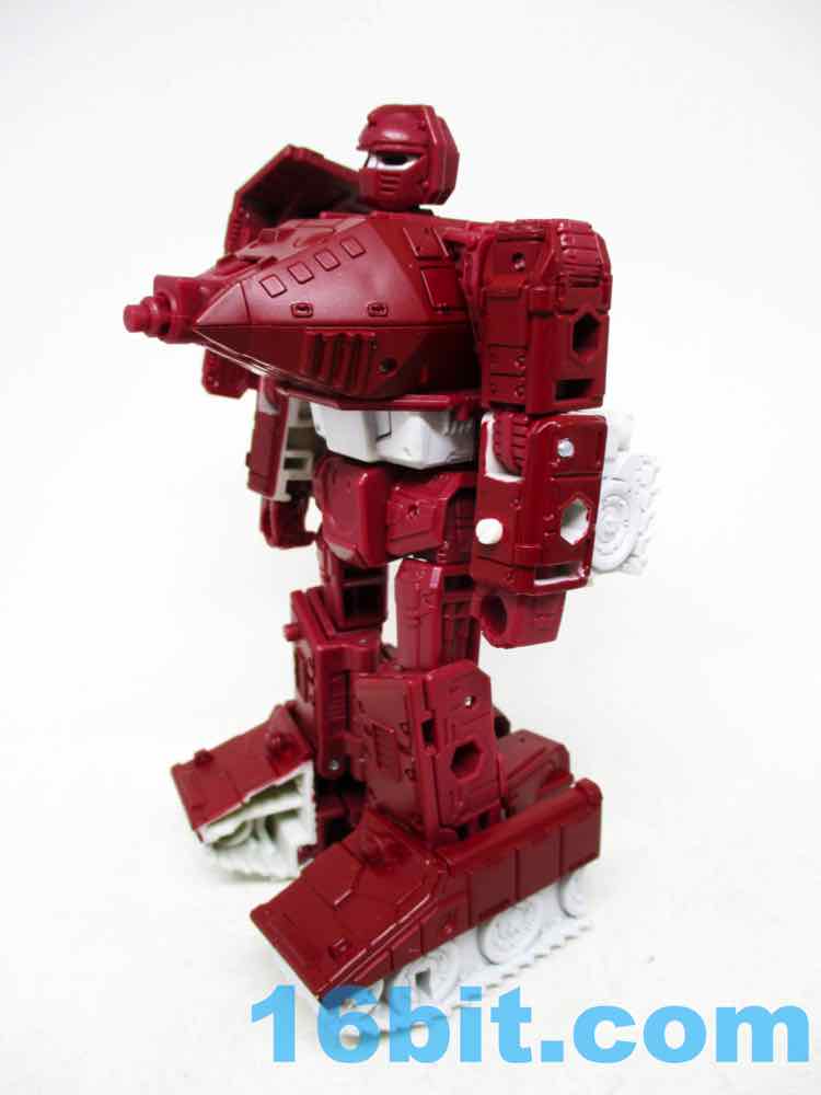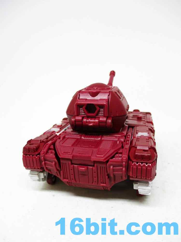 I very much like the tank - it's cute. The turret is round and bulbous, like the original toy and most likely your memory of the original toy. The grey panel behind the turret is now red, and matches the rest of the toy. There are rolling wheels which don't roll terribly well, and at this point could be dropped and most wouldn't miss them. The classic rubsign sticker is gone, replaced by an Autobot symbol. The colors don't precisely match the original toy, but they look good - they're good enough.