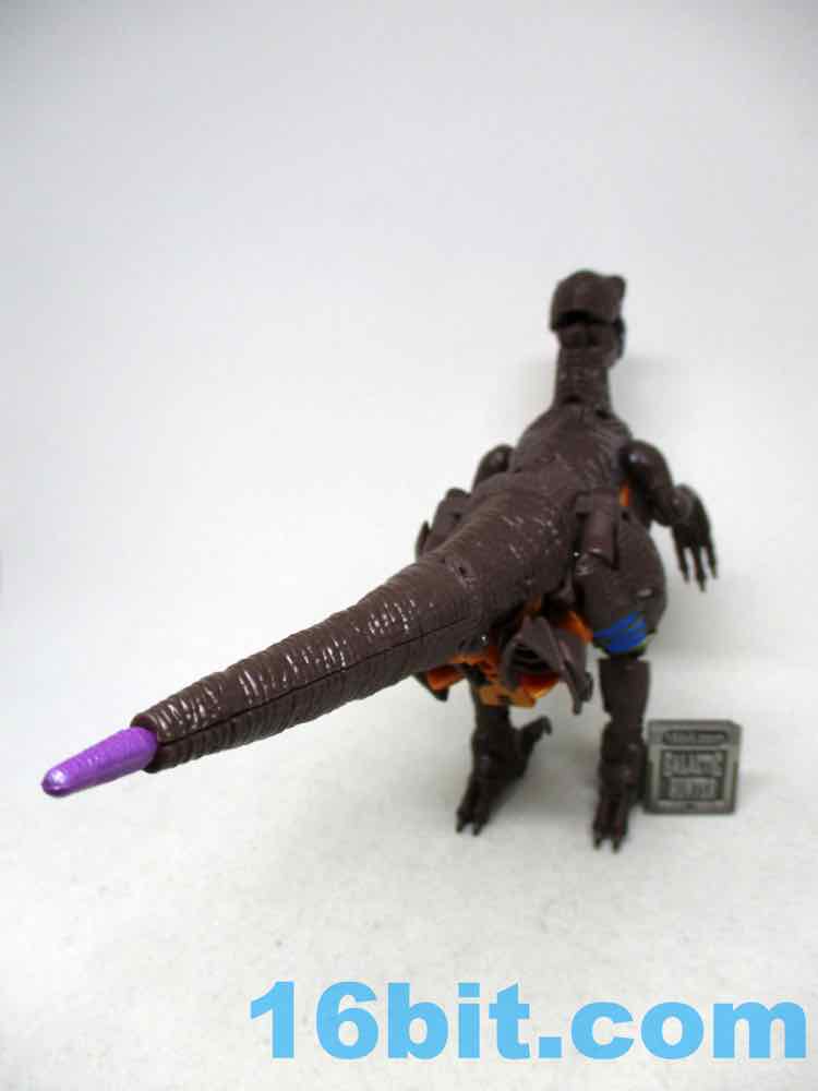 Of course, there are issues. There are robot feet hanging out on the back of the body... and there's no hiding them. The robot's bright orange hips jut out on the dinosaur's chest, and may have melted in if colored differently. They're a bit of an eyesore. There's a bit of robot kibble behind the thighs, but short of coming up with completely different modes that may not look like the Mainframe cartoon I don't know how they could've easily made this design work, at this size, at this price. Also the children of the 1990s aren't buying this toy for the beast form - but Hasbro could probably make good money with non-transforming animal toys based on the TV show. Until then, we've got a 2021 toy painted like the 2009 toy that doesn't really seem to be a good skin color match for the Dinobot on TV or on toy shelves from 1996. The stripes aren't quite right, the browns are off, and the purple tail tip - while understandable - it would've been nice to see that hidden a bit.