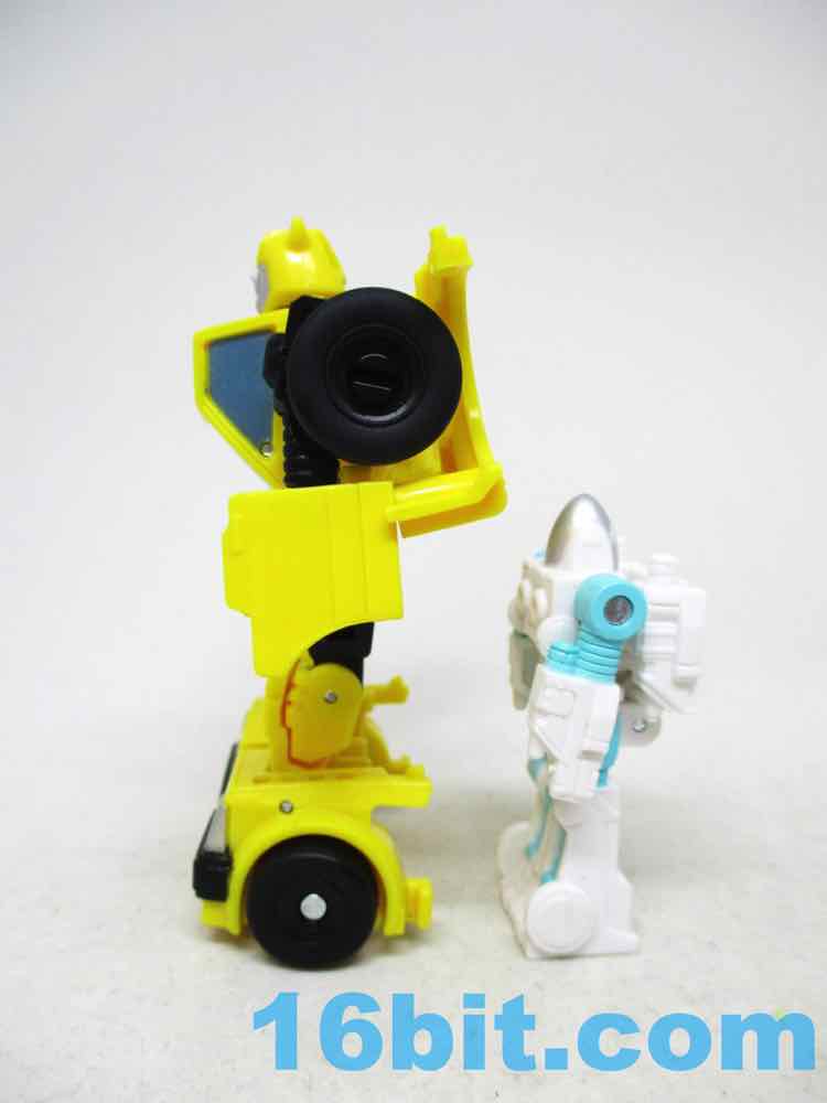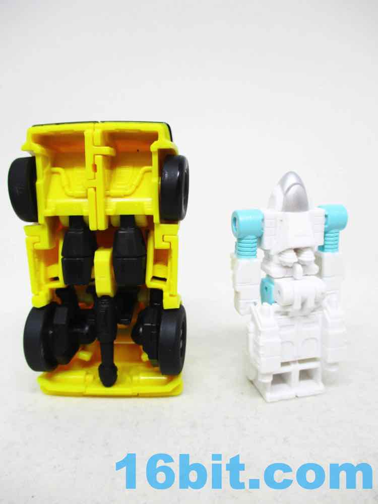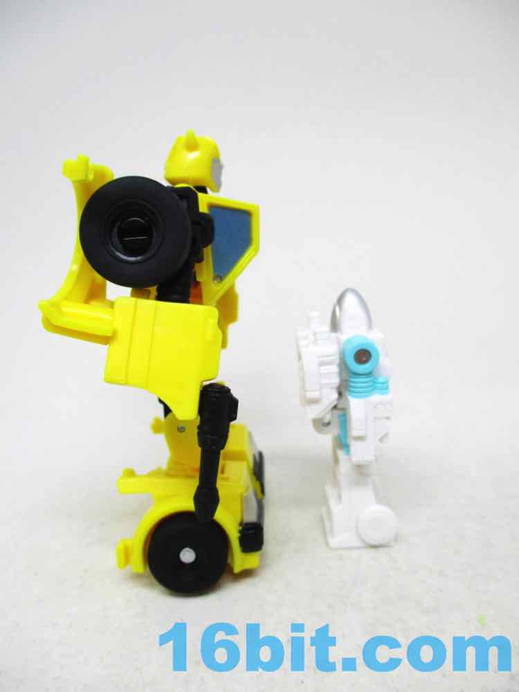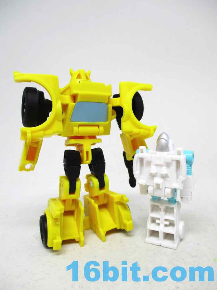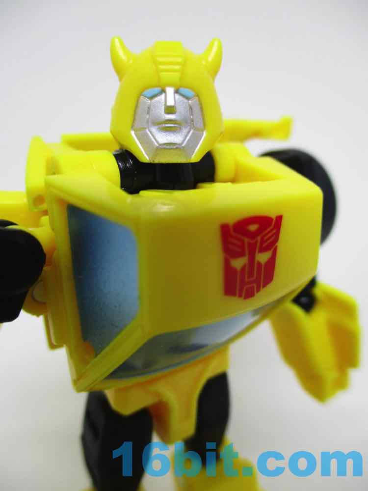 Packaged in a robot mode, Bumblebee is pretty simple from the waist up, but surprisingly robust from the legs down. The shoulders and elbows are simple ball joints that pop out easily, with 3mm fist holes that are also surprisingly small. The legs have joints hips, swivel thighs, jointed knees, and jointed ankles - plus amazing kibble in the hood that becomes shin guards. Everything down there just fits, while the upper body has weird little wings hanging off the figure's back. The head looks like it was modeled after the original character model, but with silver instead of grey on his face plus pale blue eyes. Articulation is just fine for the scale, as good as - or arguably better than - the other $9.99 core-class toys. The big feet means he stands well, and has proven to be stable. He's more than a head shorter than Optimus Prime Core Class, so he's not quite scale to that line. He's just a good 3 1/2-inch tall robot