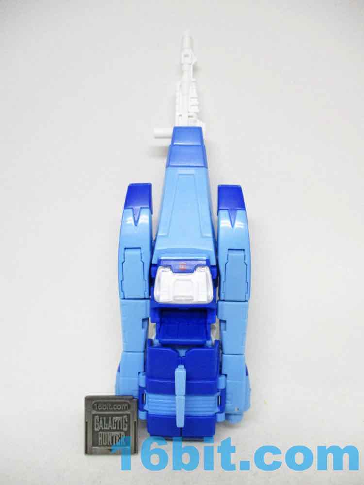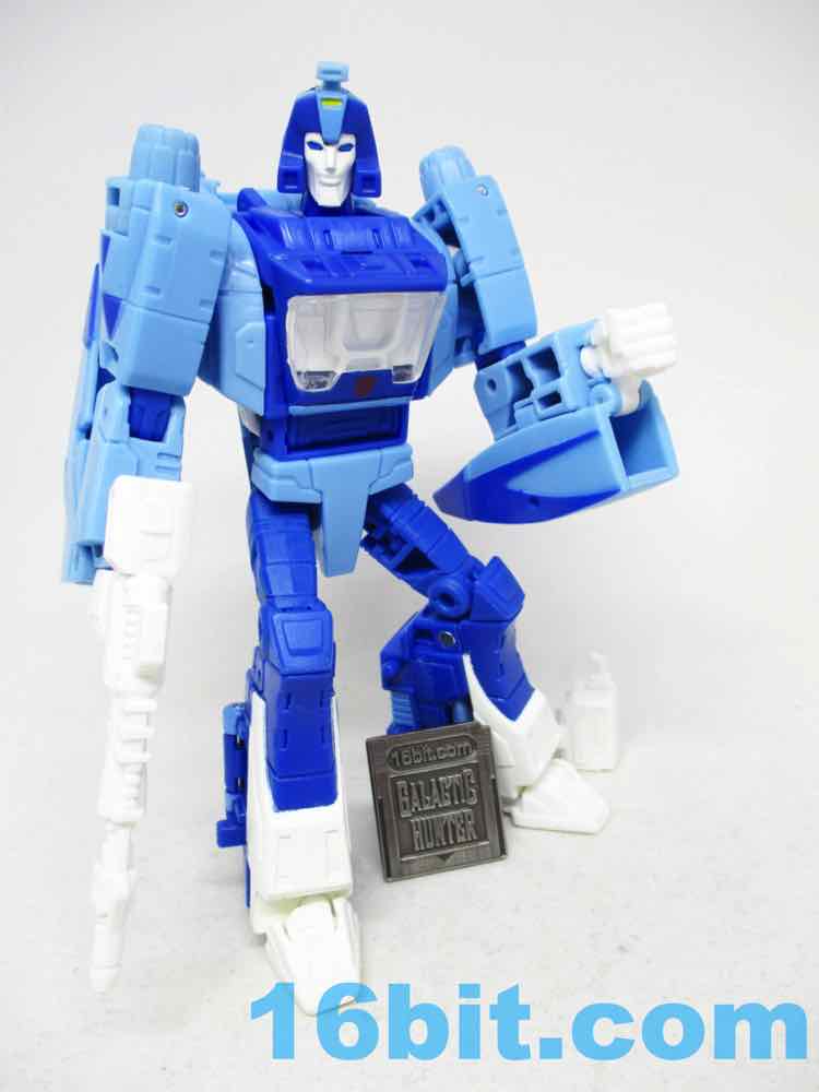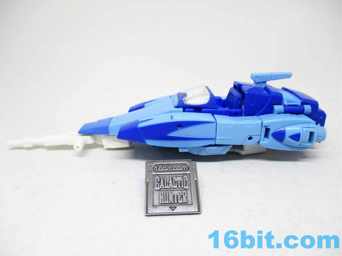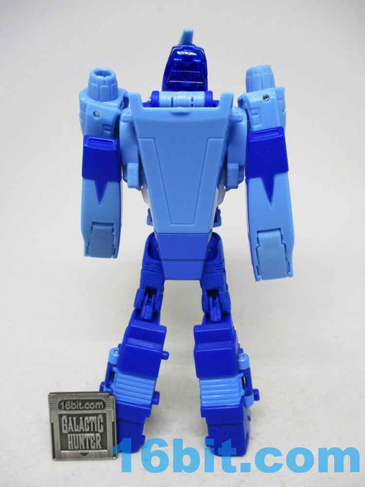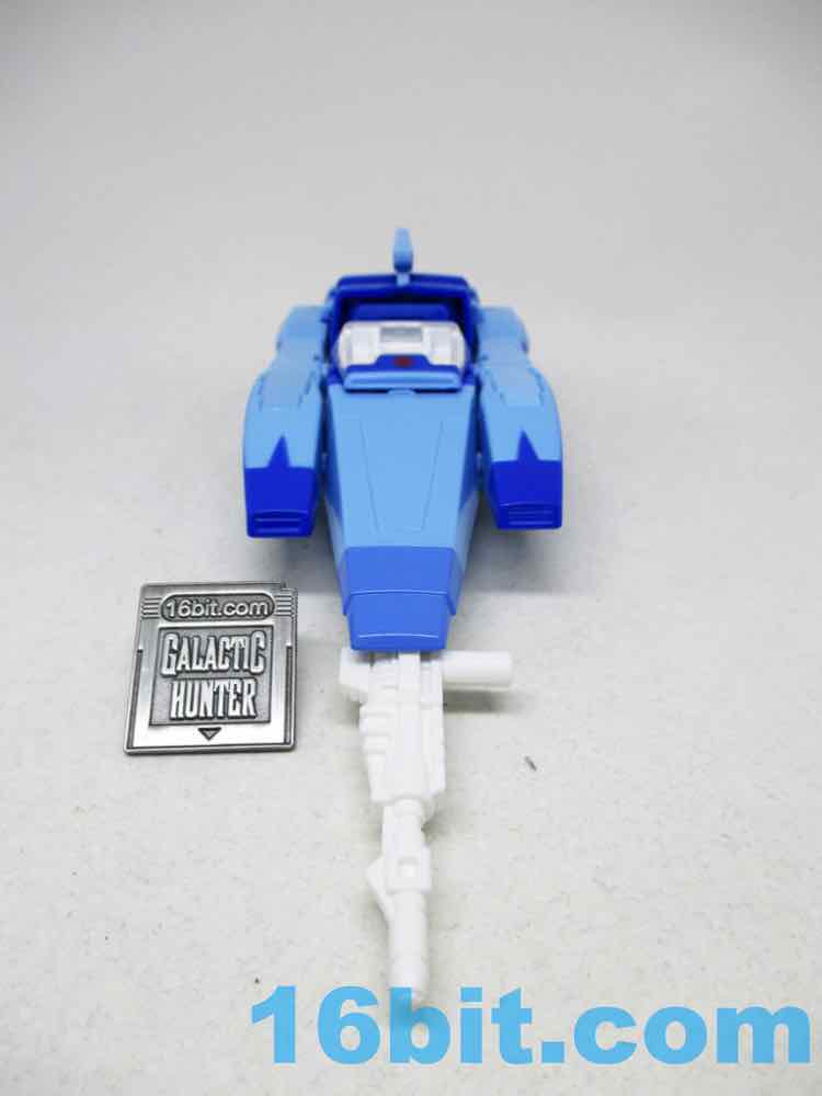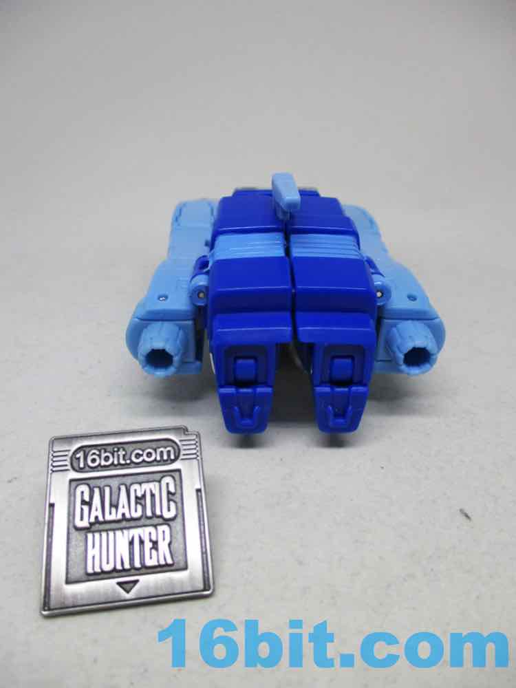 It's great to see new versions of Blurr - I never had one as a child, but I was a huge fan of the talented John Moschitta's lightning-fast performances since I was accused by the slow-speaking adults in my schools of talking too quickly. (Heresy.) Packaged in robot mode, the 5 3/4-inch tall figure looks a bunch like the 2016 Titans Return version at first glance. The colors are different, but the landmarks are similar - the car's engines are now shoulder pylons. The pontoons - now significantly larger - still hang behind the arms, and the car's nosecone hangs off the back. This isn't to say it's the same old thing - far from it. The legs have a different and more complicated transformation, and the chest rotates rather than flipping open. You've still got a rumble seat, this time it folds down under the chest.