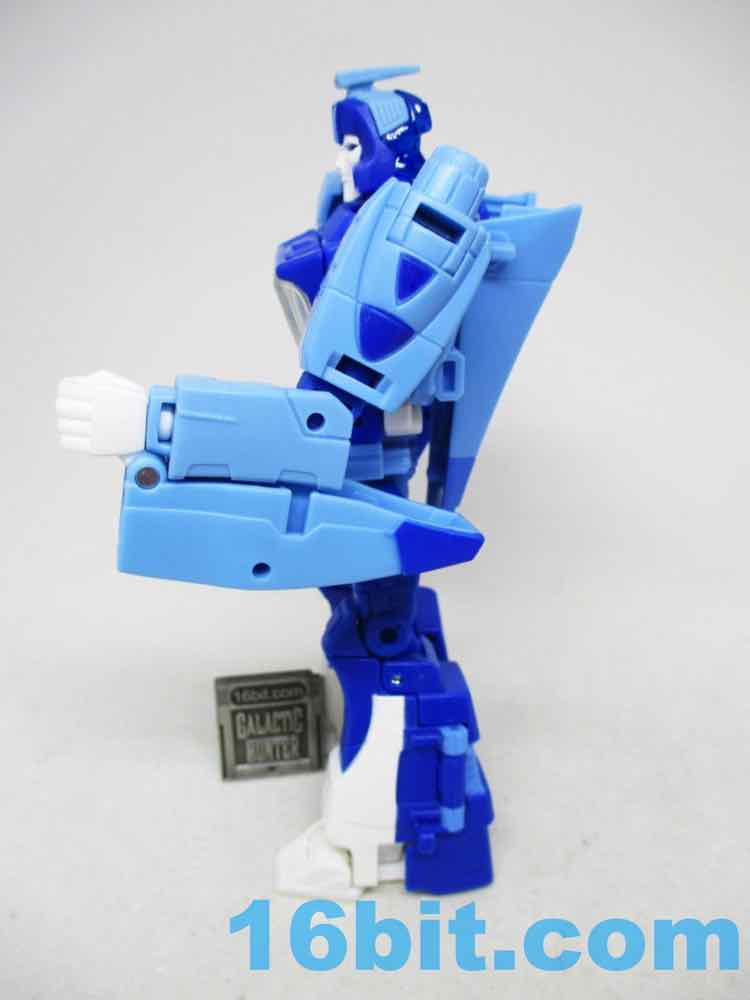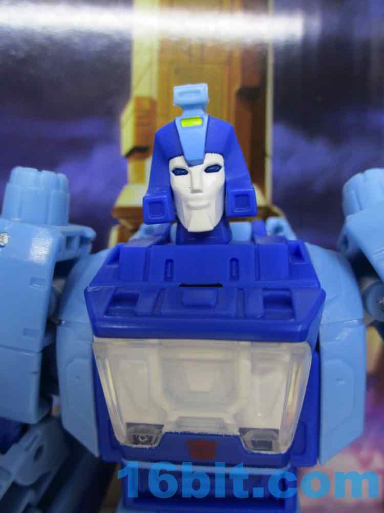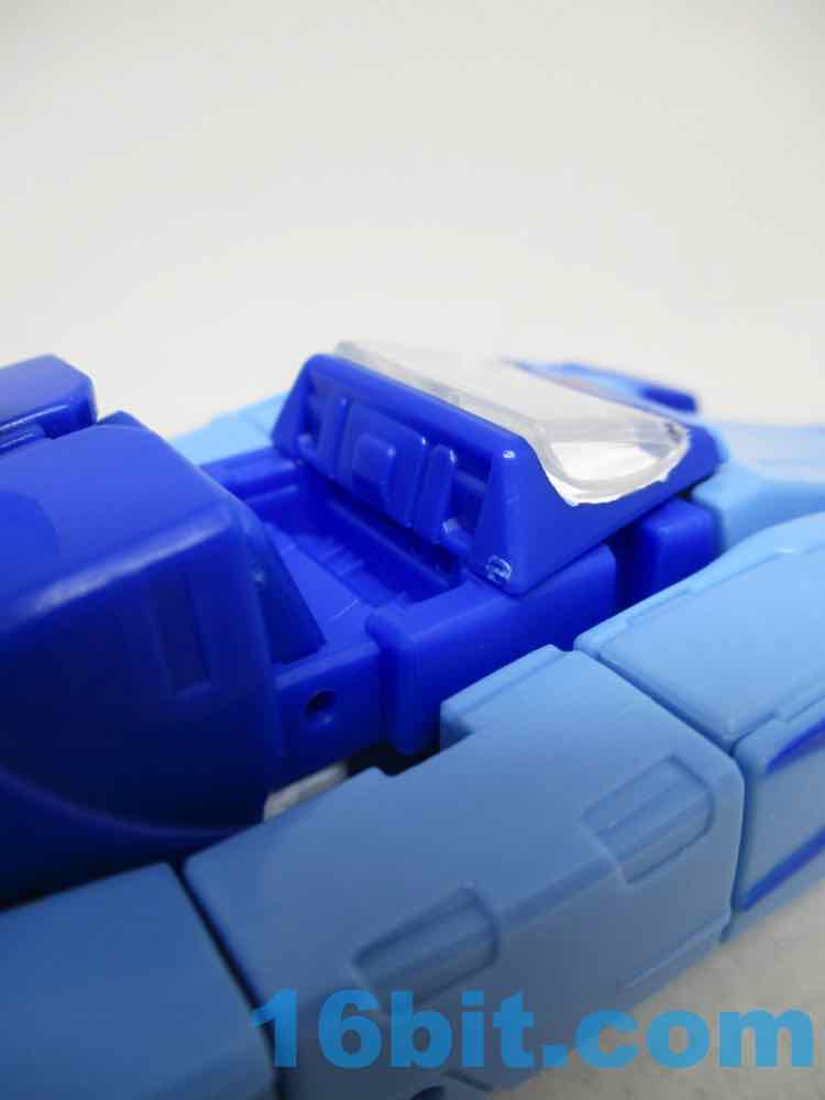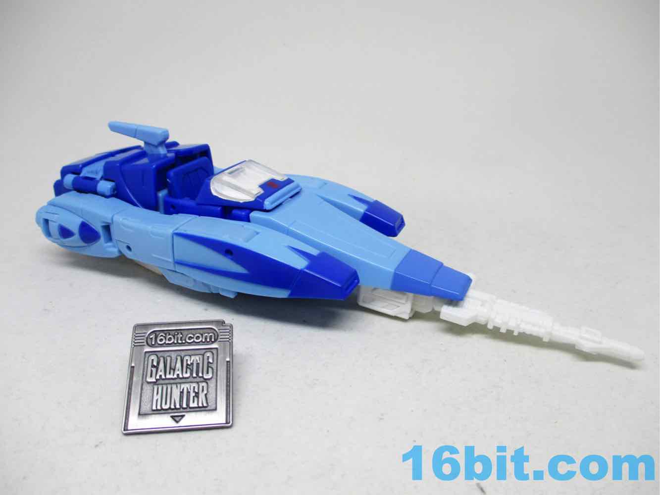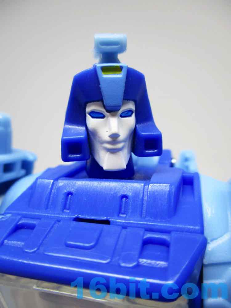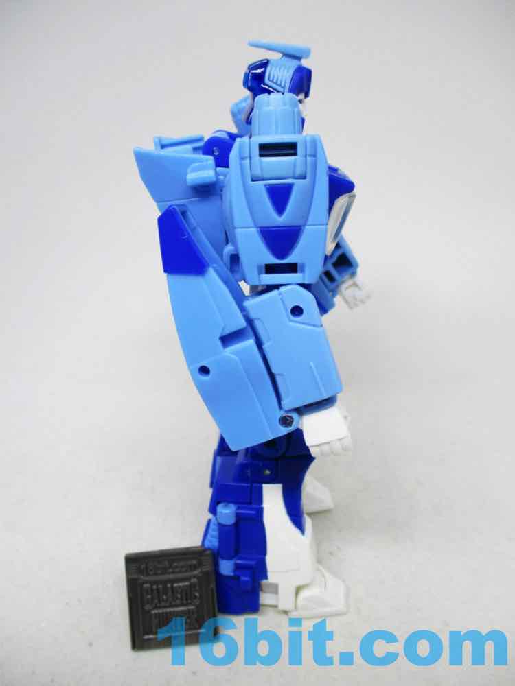 It's great to see new versions of Blurr - I never had one as a child, but I was a huge fan of the talented John Moschitta's lightning-fast performances since I was accused by the slow-speaking adults in my schools of talking too quickly. (Heresy.) Packaged in robot mode, the 5 3/4-inch tall figure looks a bunch like the 2016 Titans Return version at first glance. The colors are different, but the landmarks are similar - the car's engines are now shoulder pylons. The pontoons - now significantly larger - still hang behind the arms, and the car's nosecone hangs off the back. This isn't to say it's the same old thing - far from it. The legs have a different and more complicated transformation, and the chest rotates rather than flipping open. You've still got a rumble seat, this time it folds down under the chest.