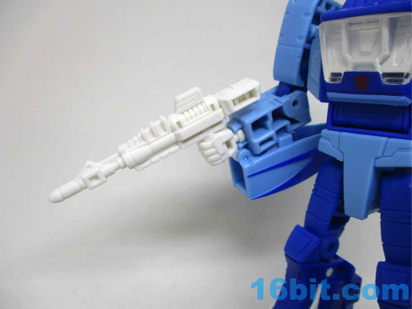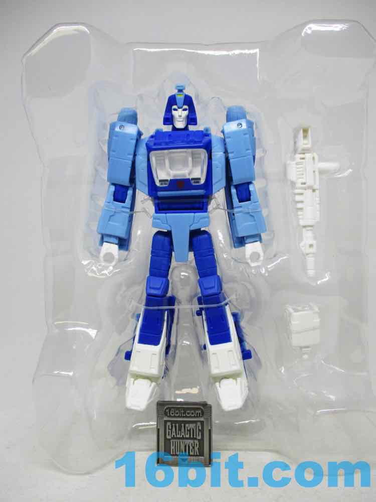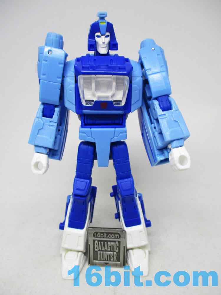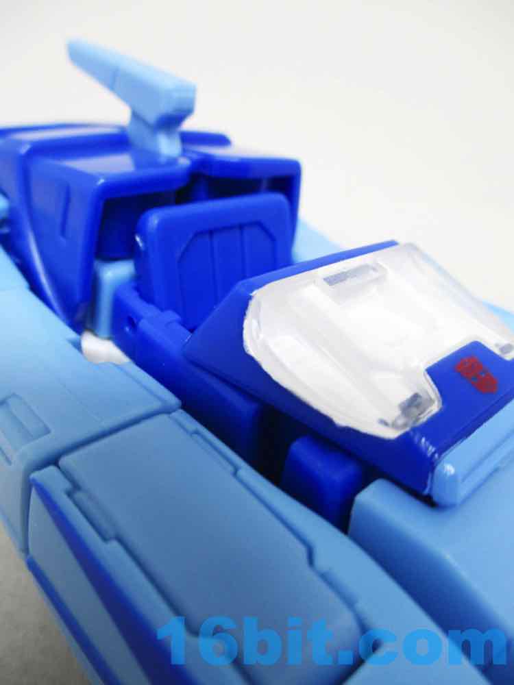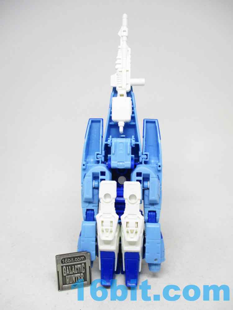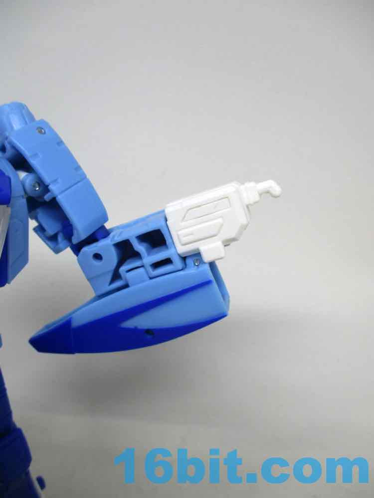 It's great to see new versions of Blurr - I never had one as a child, but I was a huge fan of the talented John Moschitta's lightning-fast performances since I was accused by the slow-speaking adults in my schools of talking too quickly. (Heresy.) Packaged in robot mode, the 5 3/4-inch tall figure looks a bunch like the 2016 Titans Return version at first glance. The colors are different, but the landmarks are similar - the car's engines are now shoulder pylons. The pontoons - now significantly larger - still hang behind the arms, and the car's nosecone hangs off the back. This isn't to say it's the same old thing - far from it. The legs have a different and more complicated transformation, and the chest rotates rather than flipping open. You've still got a rumble seat, this time it folds down under the chest.