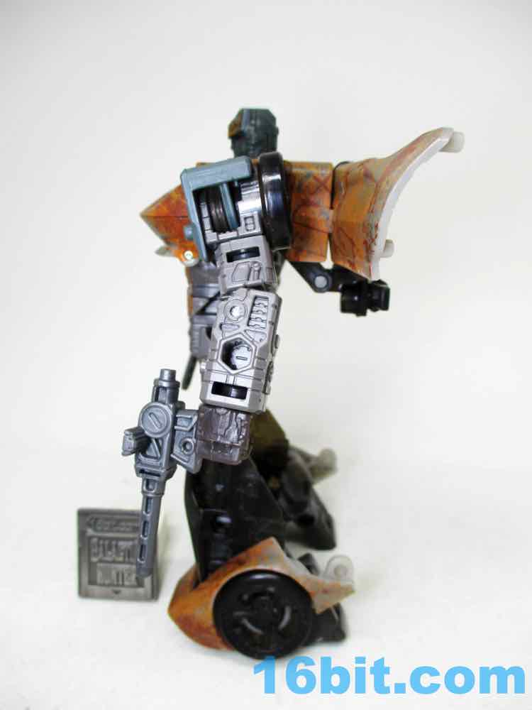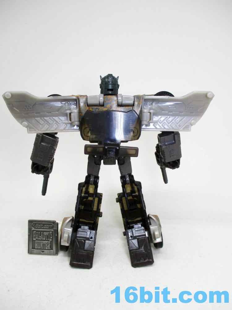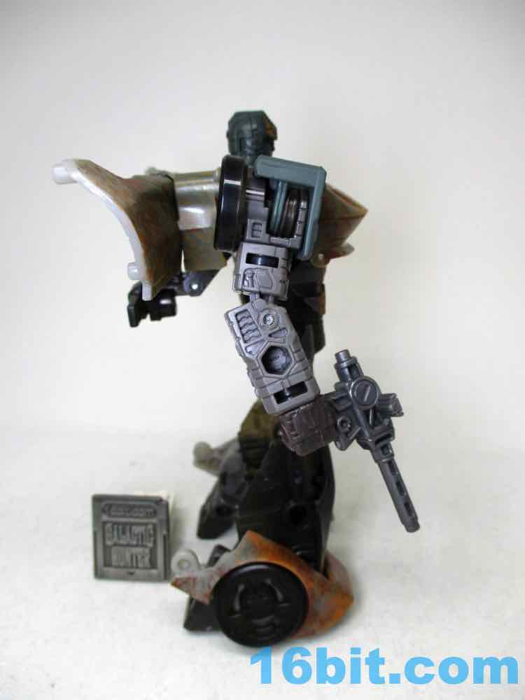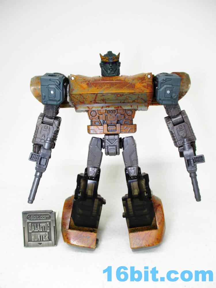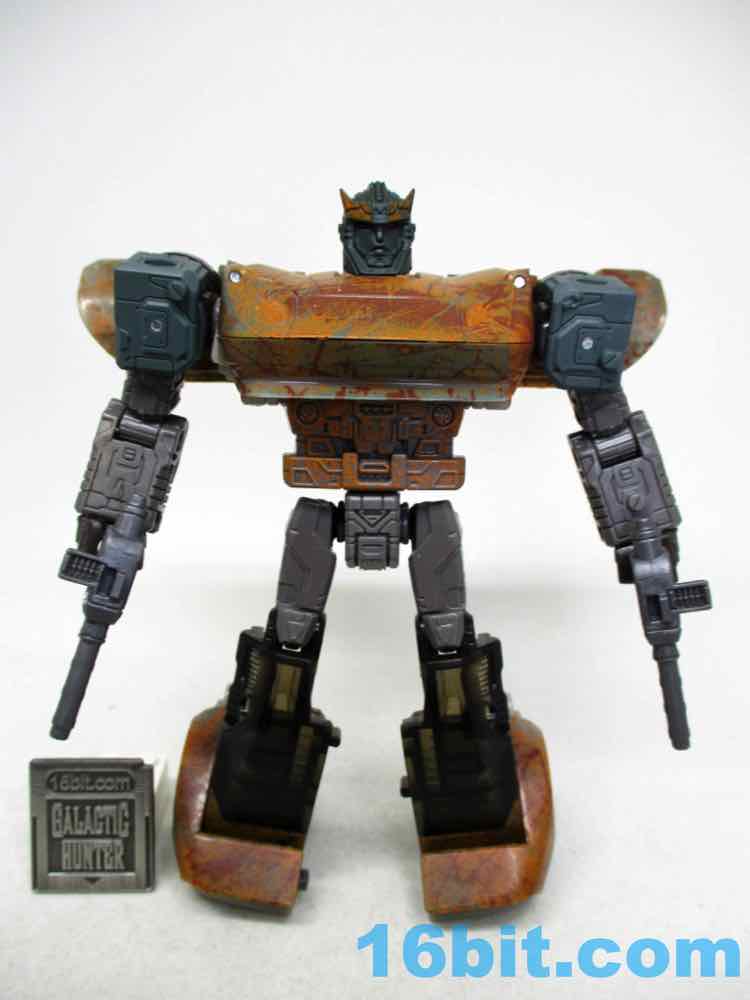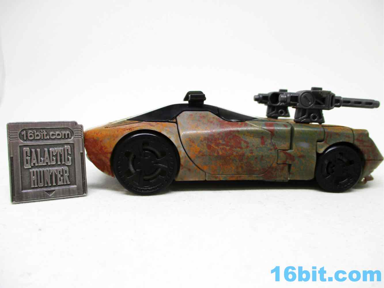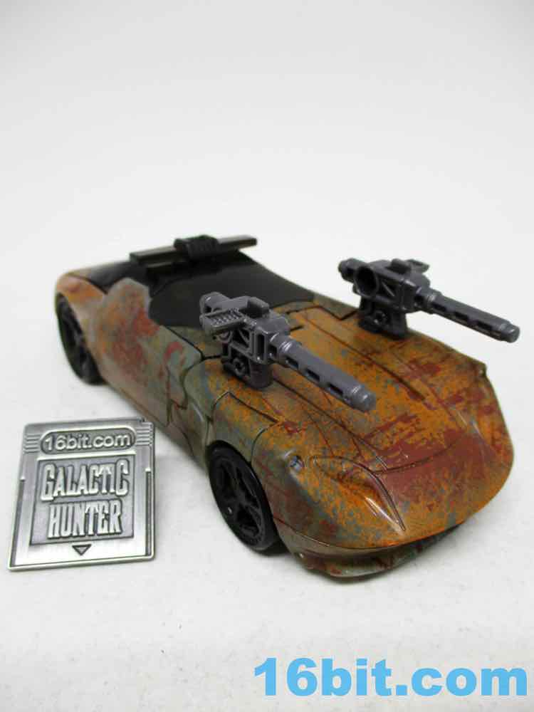 Since this is a toy of a character with no precedent outside a silent cameo as one of a horde of sparkless undead robots, it's perfect. The TV show just took existing animation models, slapped on new textures, and presto - the sparkless exist. This one snuck up on Moonracer, which was just a slightly different blue Chromia, which was not at all obvious. The grey plastic robot has purple eyes and rusty car parts, but not a lot of deco in general - and it works here. It's like all the life had been drained from it, and it has the same articulation as previous releases of the mold - about 22 moving joints, most of which are involved in the transformation to rust bucket mode. The blasters can fit in his fists or his torso, and of course you can cover this guy with C.O.M.B.A.T. blast effects if you want.
