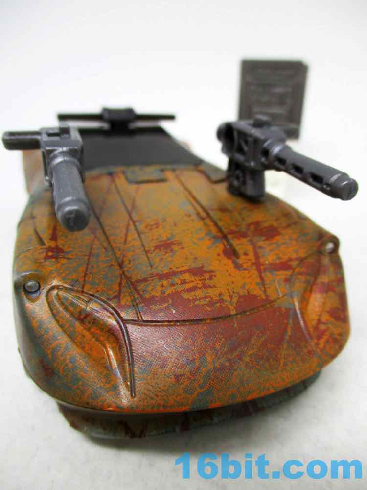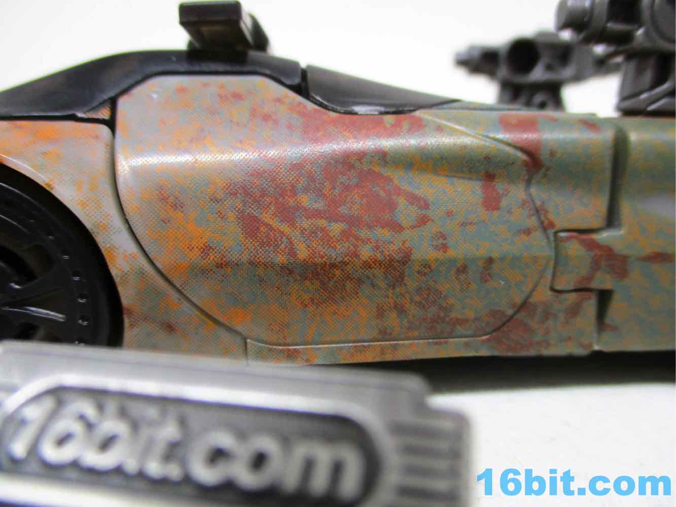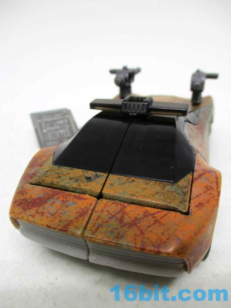 The car is unlike anything we've really seen from Hasbro - although I guess there was a very hard-to-find farm battle Optimus Prime from Age of Extinction that never got widespread release. Normally Hasbro's idea of a beater is a few splotches of paint - a scrape, a scratch, a black dot that looks like mold. In this case, the car is entirely covered in paint. It's not unique to each one (sadly), as the incredibly detailed pattern seems printed on with the same kind of process used for the "photo real" faces in Star Wars and Marvel Legends - you can see little tiny dots if you get real close.