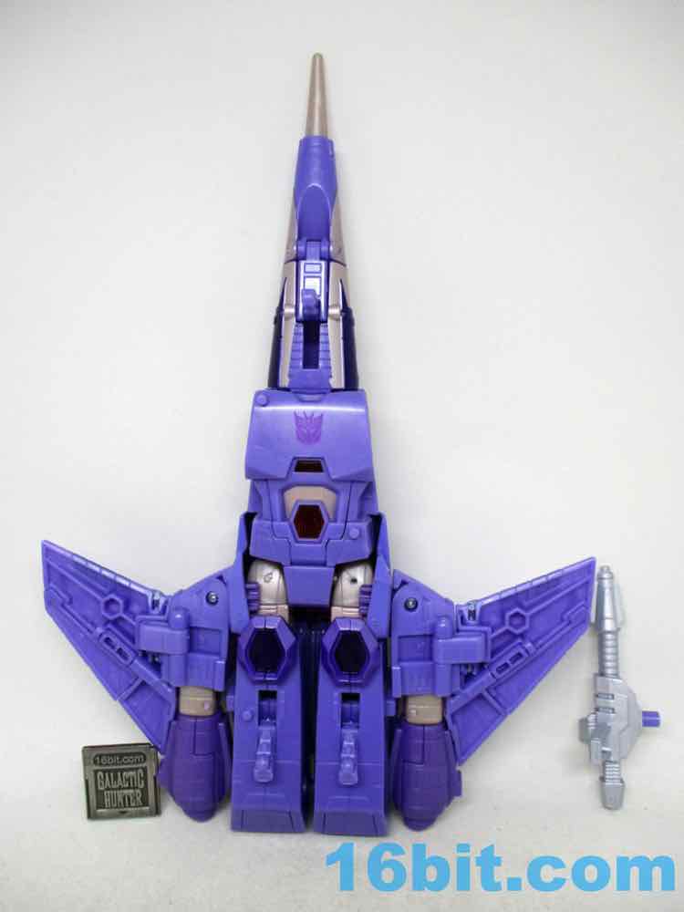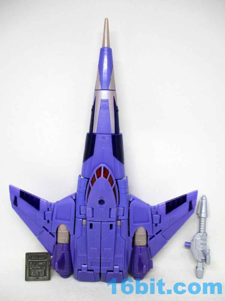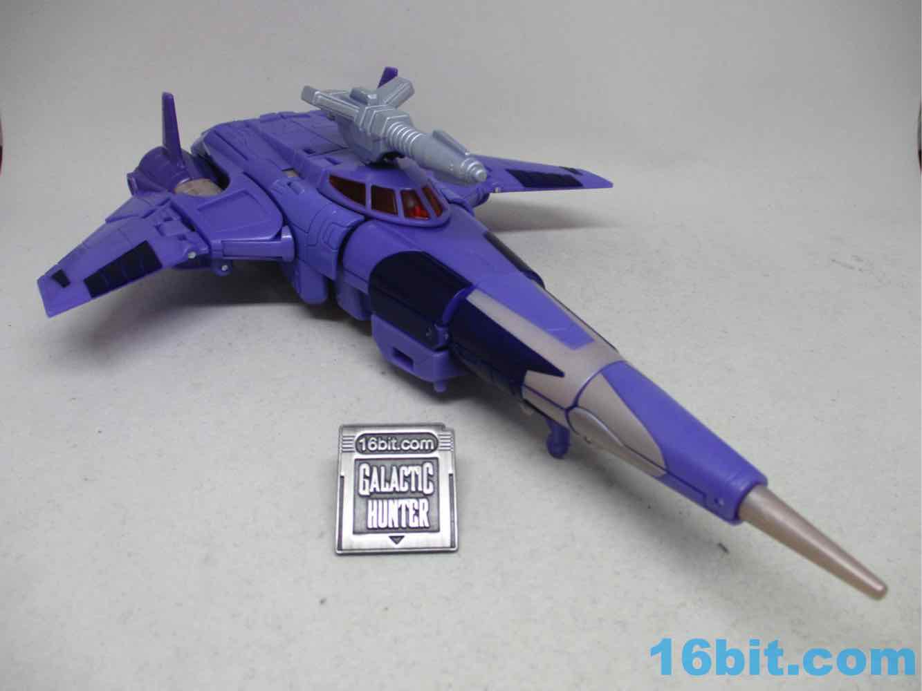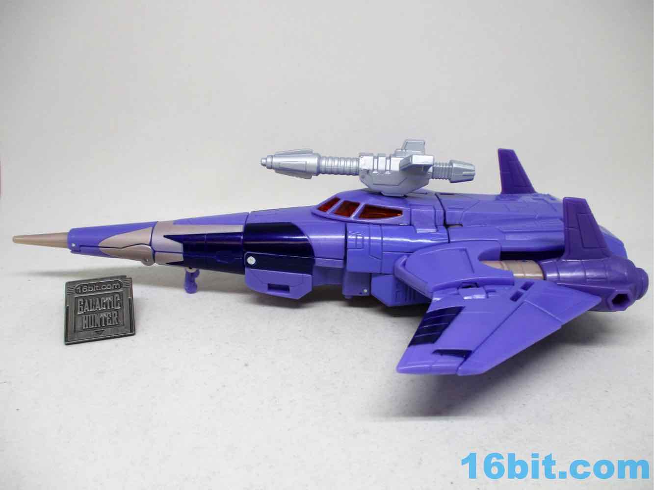 The vehicle is also one of Hasbro's best efforts, with retractable landing gear and a decent silhouette. Previous 21st century Cyclonus plane modes were either robot parts wadded up in a vehicle shape, or a vehicle backpack with a robot crouched under it. This one is more convincingly a robot that turns into a space ship. You can mount the blaster on the top of the starcraft, and wave it around and make "whoosh" noises.