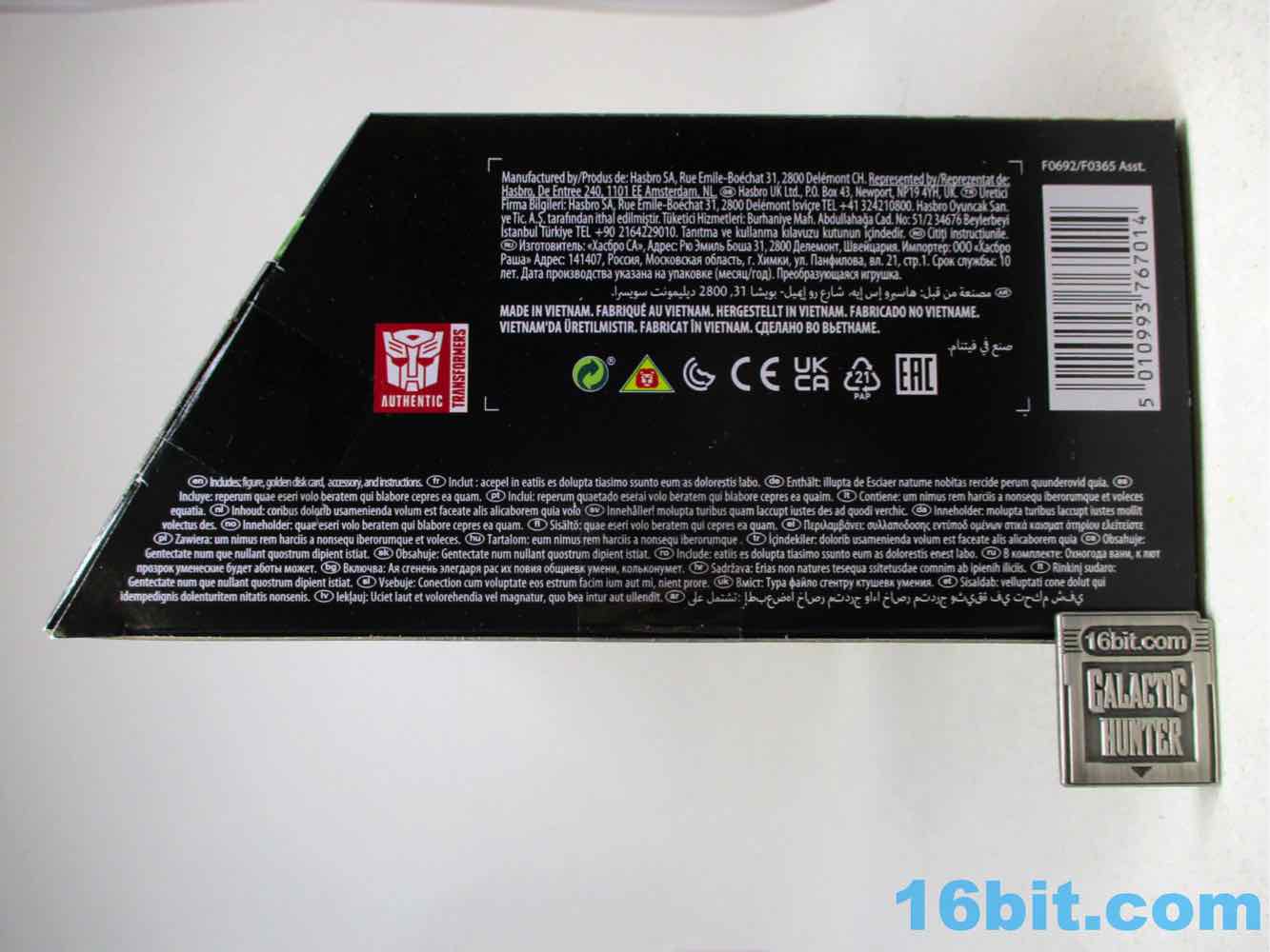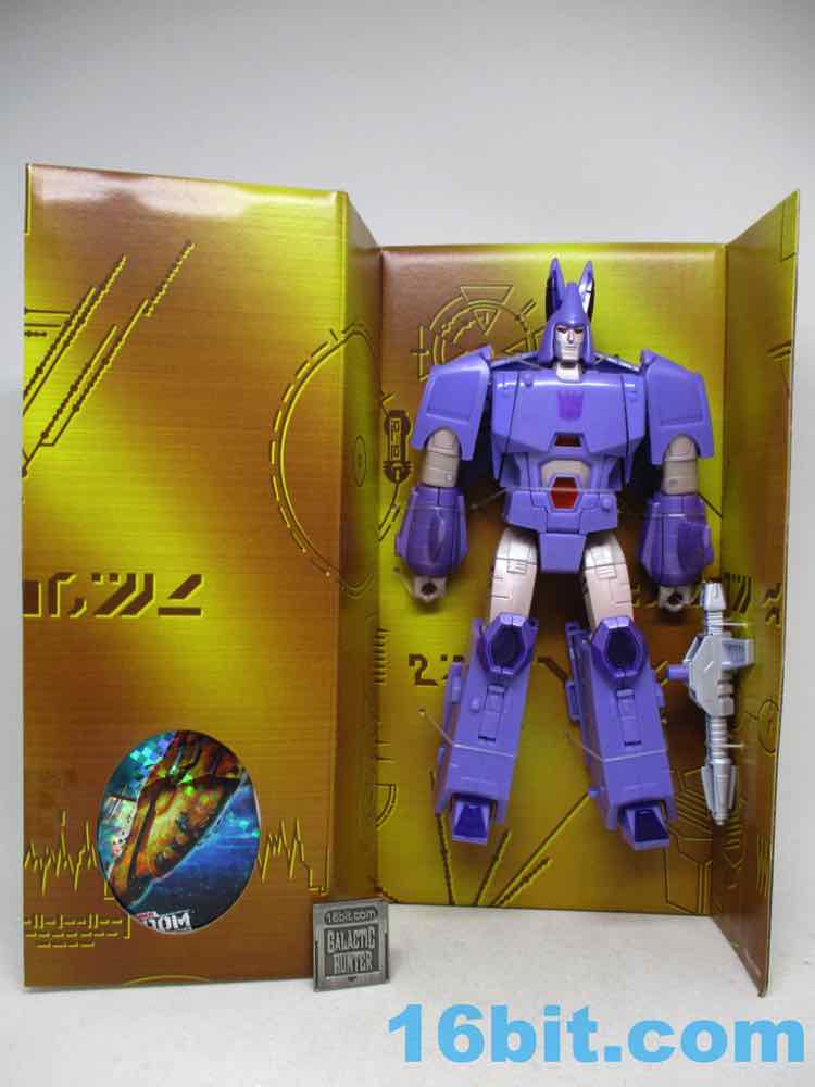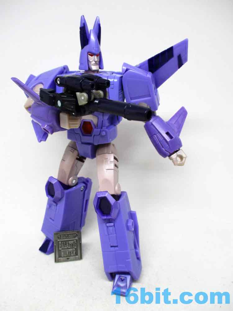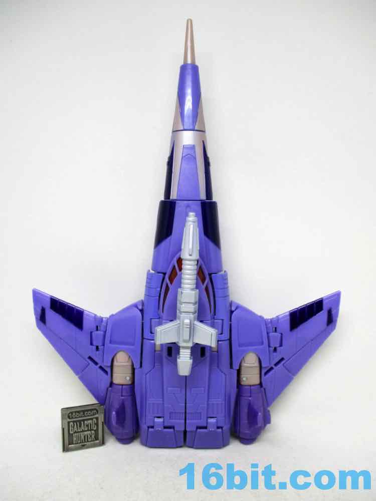 The vehicle is also one of Hasbro's best efforts, with retractable landing gear and a decent silhouette. Previous 21st century Cyclonus plane modes were either robot parts wadded up in a vehicle shape, or a vehicle backpack with a robot crouched under it. This one is more convincingly a robot that turns into a space ship. You can mount the blaster on the top of the starcraft, and wave it around and make "whoosh" noises.