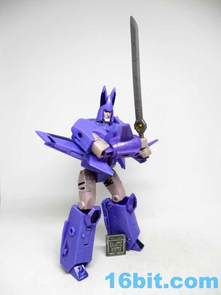 The 7 1/2-inch robot mode is a gem, and probably about as close as you can get to one of those fancy collector figures that can still transform. The elbows and knees bend slightly more than 90 degrees, and there are articulated, swivel wrists as well as ankle tilts. While a lot of Kingdom toys seem to be (shall we say) inspired by Masterpiece Edition toy engineering, this one exists in a world by itself with 26 points of articulation. That's a lot. The big boots stand nicely, and the arms have a great range of motion. If you wanted to give him a sword, you can indeed pose both arms to double-grip 2010 Drift's sword. He has no problem holding his own blaster, or the 2008 Targetmaster Nightstick.