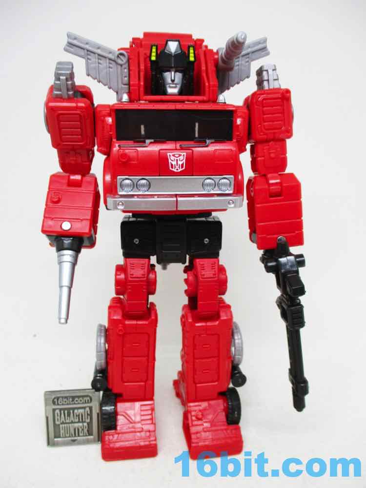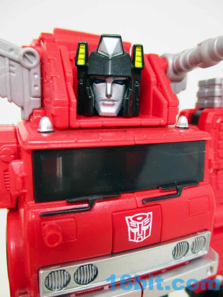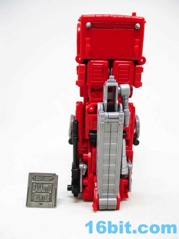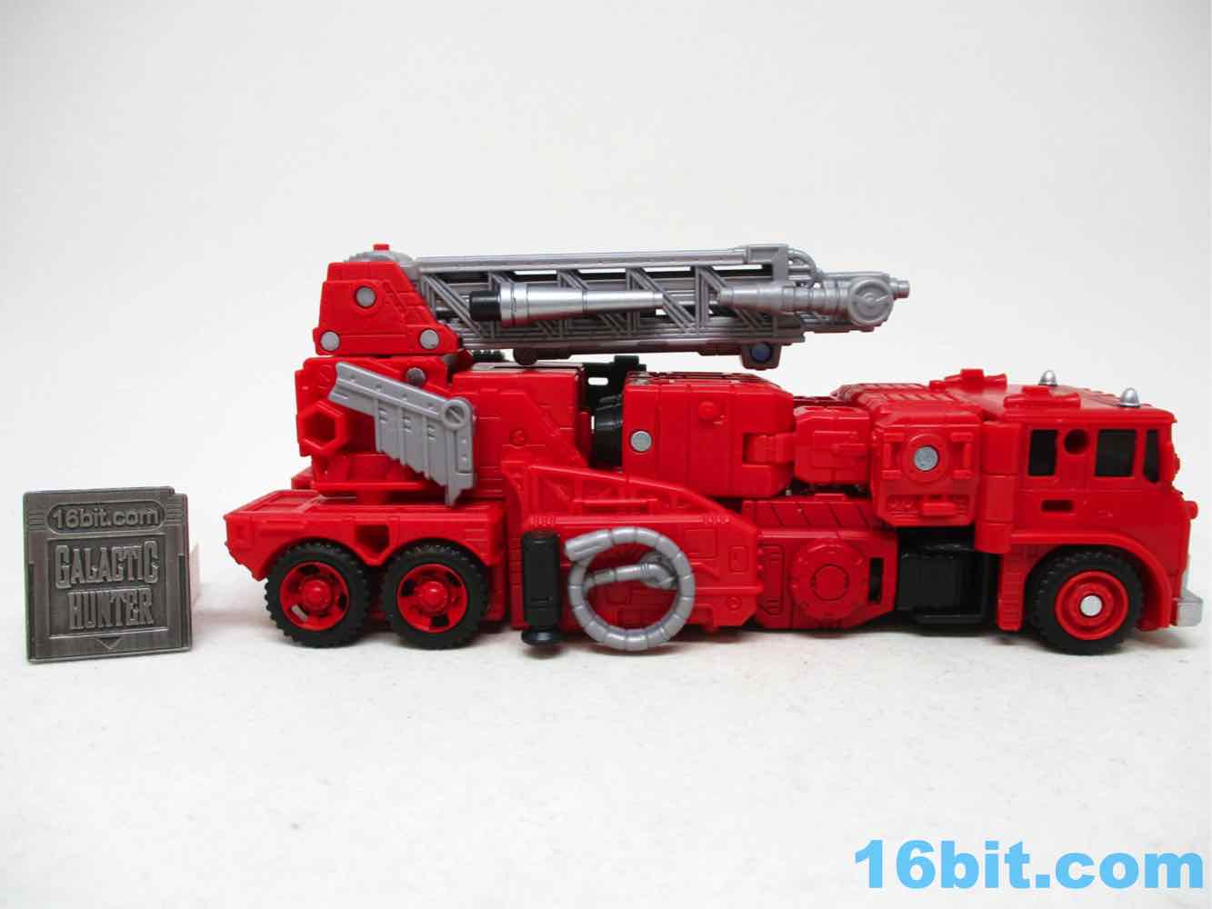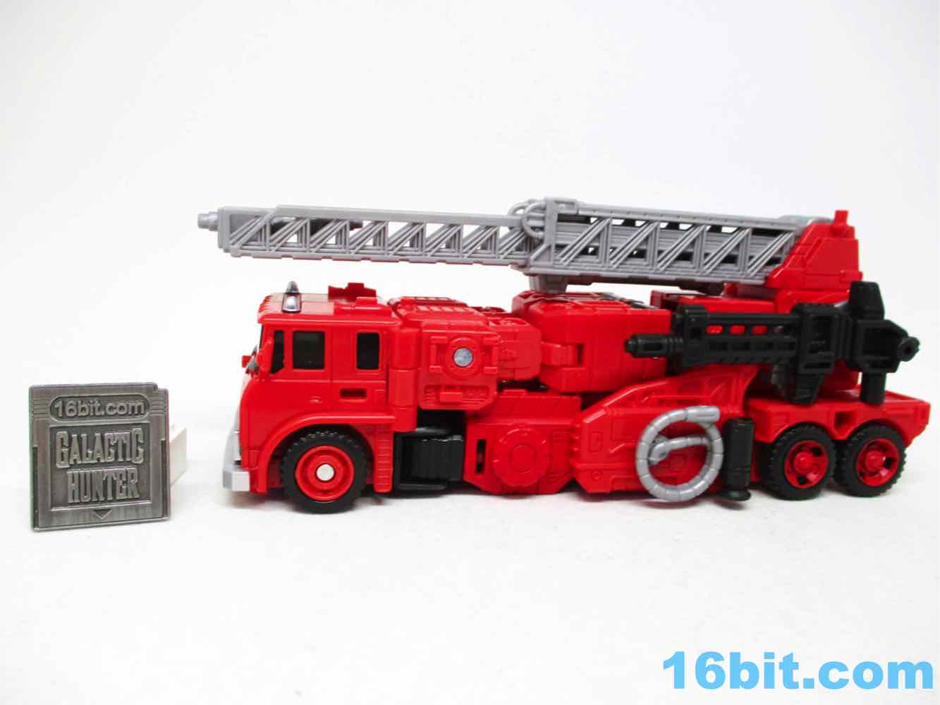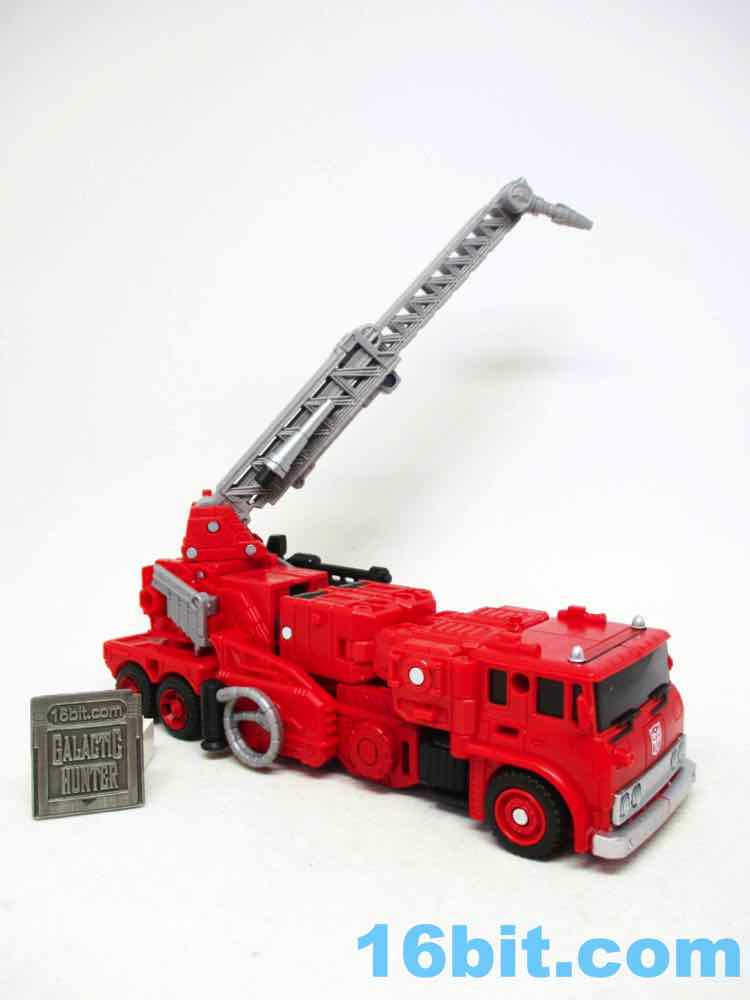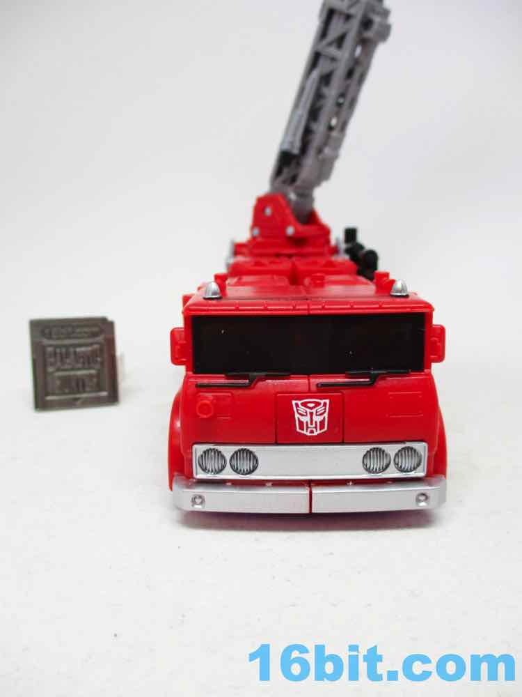 It's a fire engine! The wheels roll, but not terribly well. There's not a lot of clearance there, but other than that it's pretty good. The telescoping ladder is articulated so you can swivel it around, plus there's a 3mm peg for a blaster bolt. It would be great if there were more blue ones you could pretend were water. The truck looks pretty good from some angles, and like a robot contorted into a truck block from others. This makes it a lot like the original 1984 toy. "Blocky but good" is the G1 calling card, making this likely to appeal to people who enjoyed and want more of what they had as a kid in the 1980s. I'm sure a lot of long-term fans would rather have something completely new, but the demand for more G1 remakes continues to be high since there's a pretty steady supply of 30- and 40-somethings looking to grab on to a better version of a childhood memory.