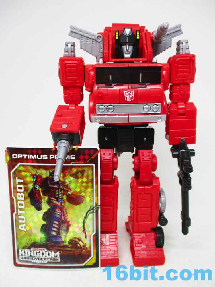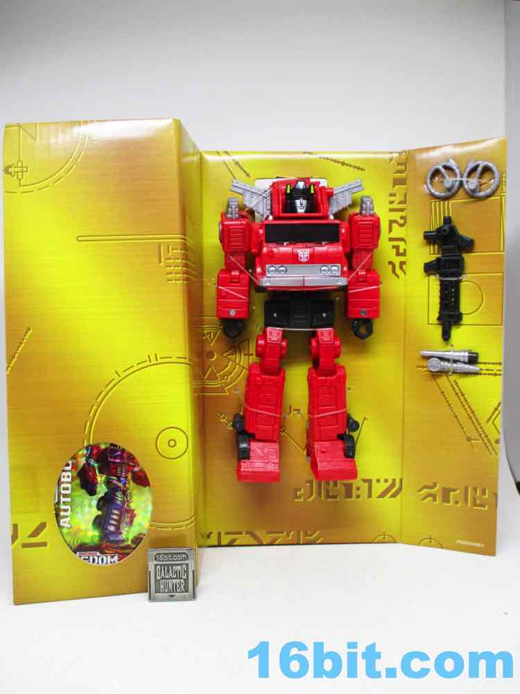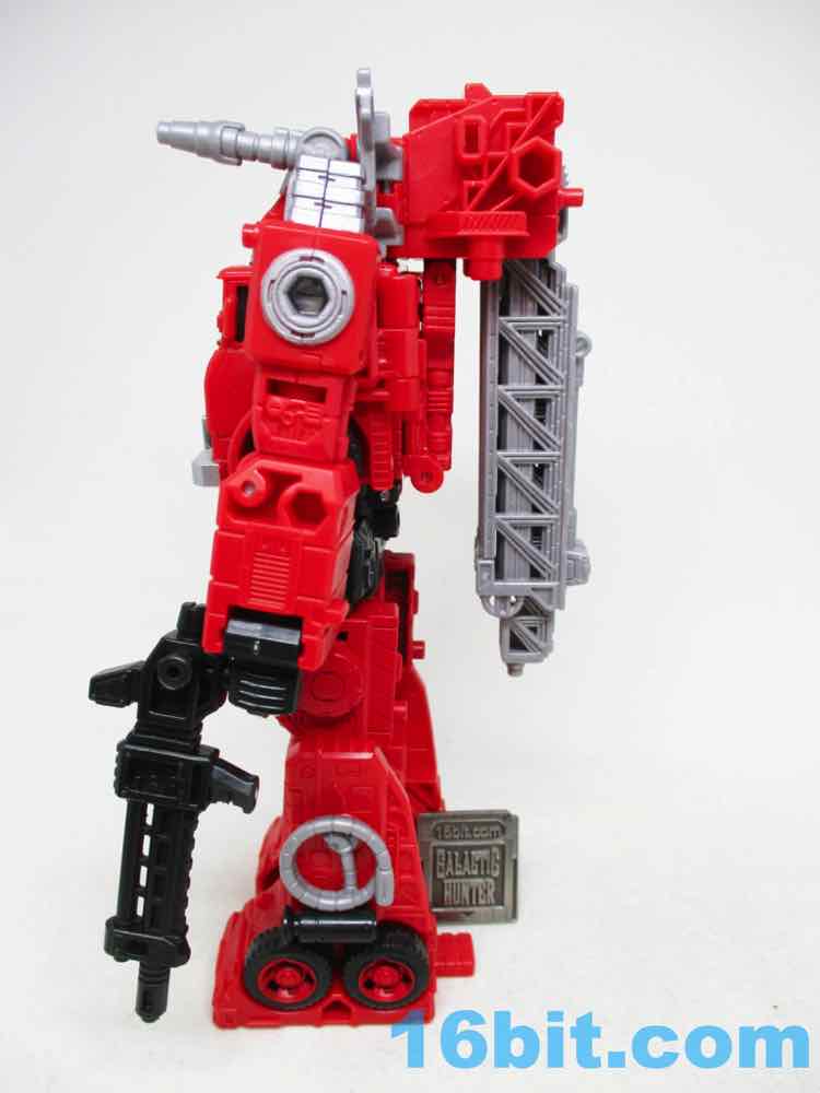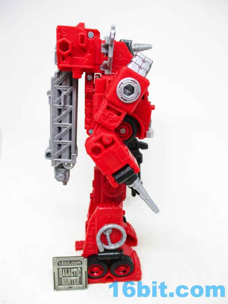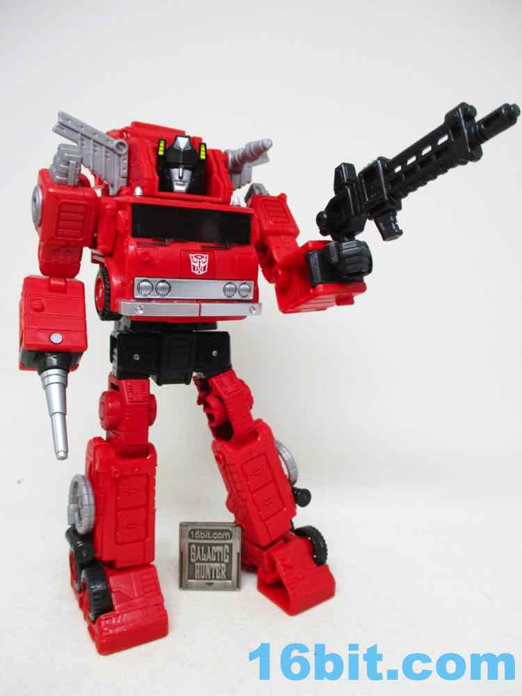 The 6 1/2-inch red robot has about 22 points of meaningful articulation, and I love that you can swap out the fists with sockets for tools. If you don't want to use the included blaster - now black, rather than almost-black-dark-grey, there is an on-board storage socket on the back of the figure. I have no real connection to the character, but I love the toy and all of its articulation. It's super poseable, he stands well, he looks good, and it offers sufficiently different play features than most of the nostalgia-era Inferno toys. He lacks the G1 rocket firing mechanisms, but beyond that it's pretty close to the 1984 toy. The 2009 Universe 2.0 "G2" toy has a clear blue water projectile and a much stockier build, which helps it stand out on the shelf. The 2015 Combiner Wars toy doubles as a combiner torso, which may be the best way to keep it now that you have this Kingdom robot. While they're all fire trucks, they're also all a little different and I find that it makes for a surprisingly fun subset of new toys of the same basic guy.
